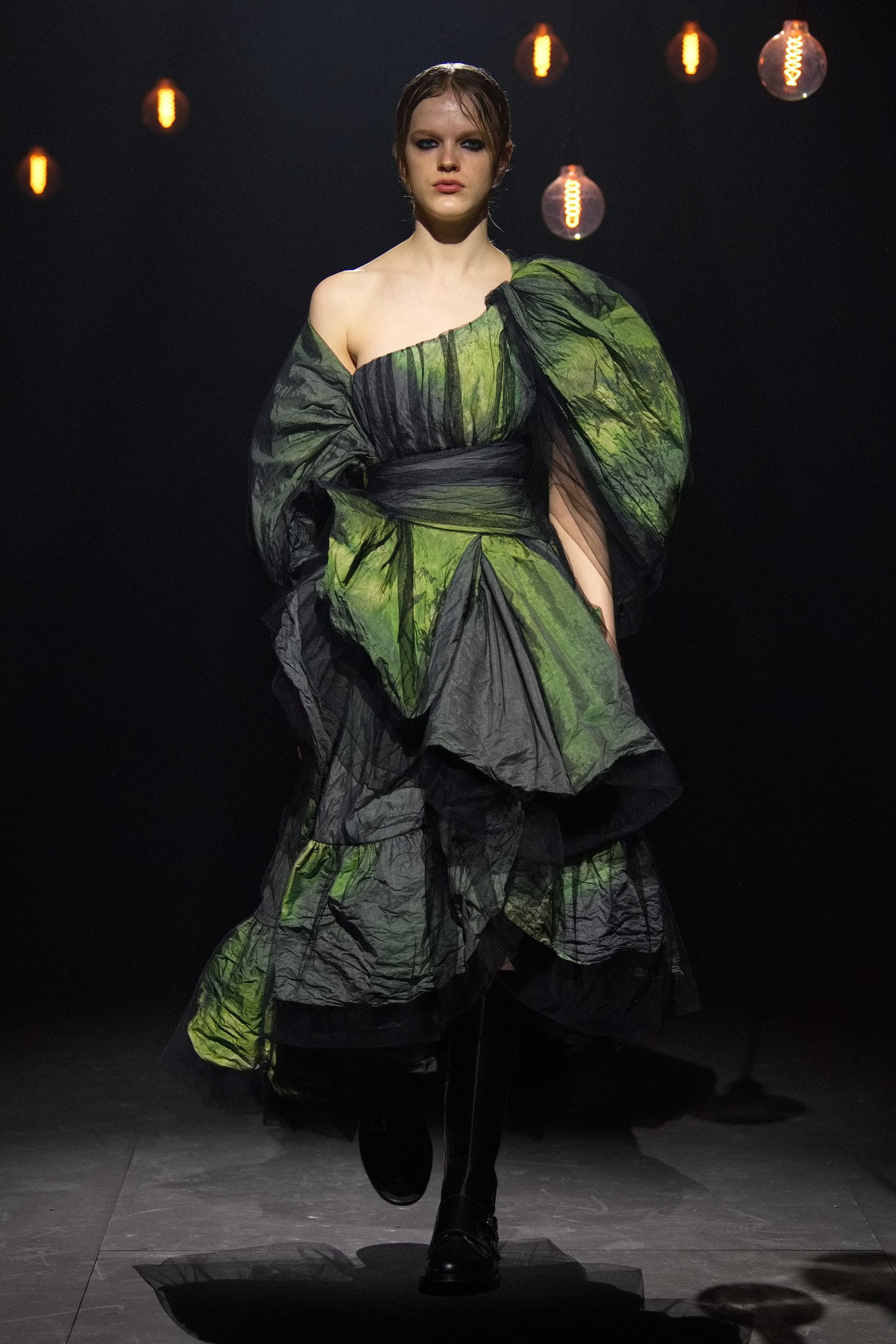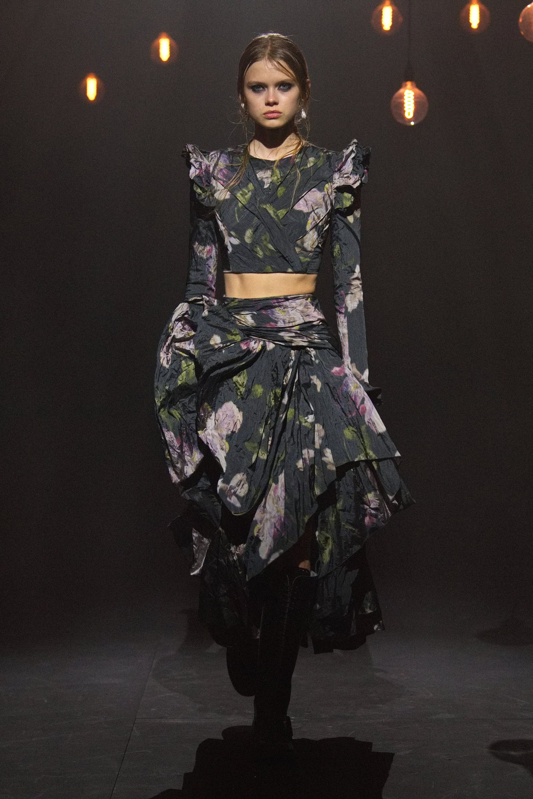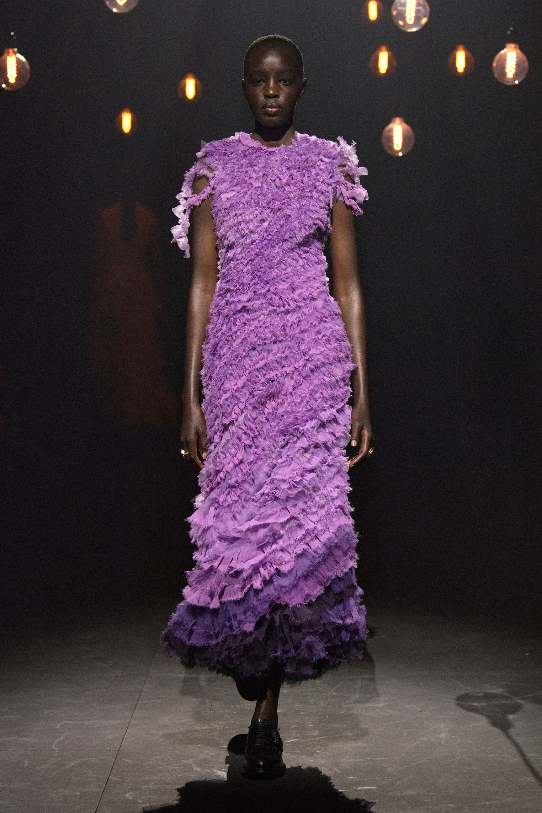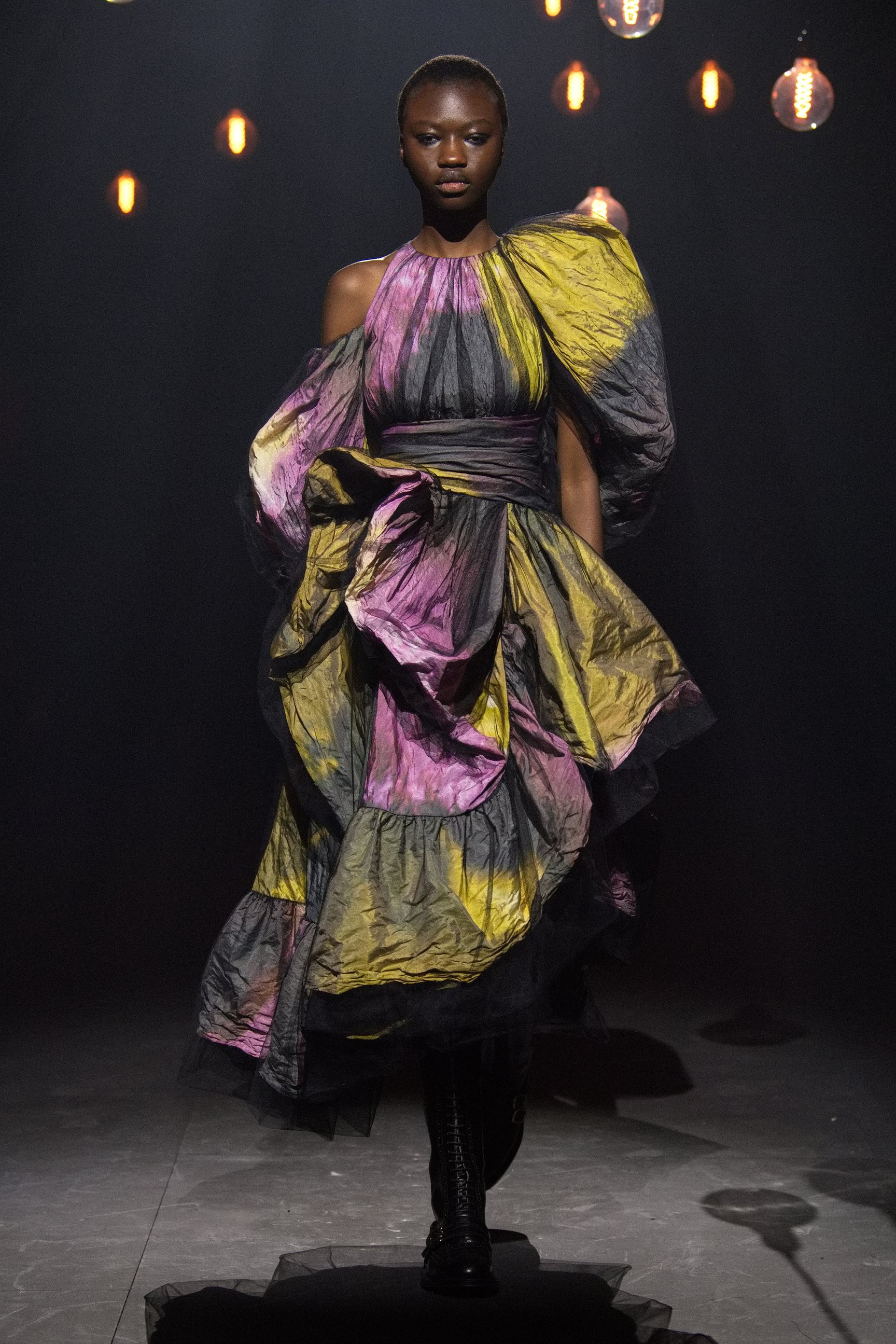 アーデムは今回のショーで、その女性たちを現代へと解き放った。無数の電球が吊り下げられた薄暗い空間に、ヴィクトリア調のドレスをまとったモデルが次々と登場。アーデムが得意とするフラワープリントが取り入れられ、イエローやライラックといったカラーリング、そしてパフトップのオペラグローブなどが幻想的なムードを盛り上げた。