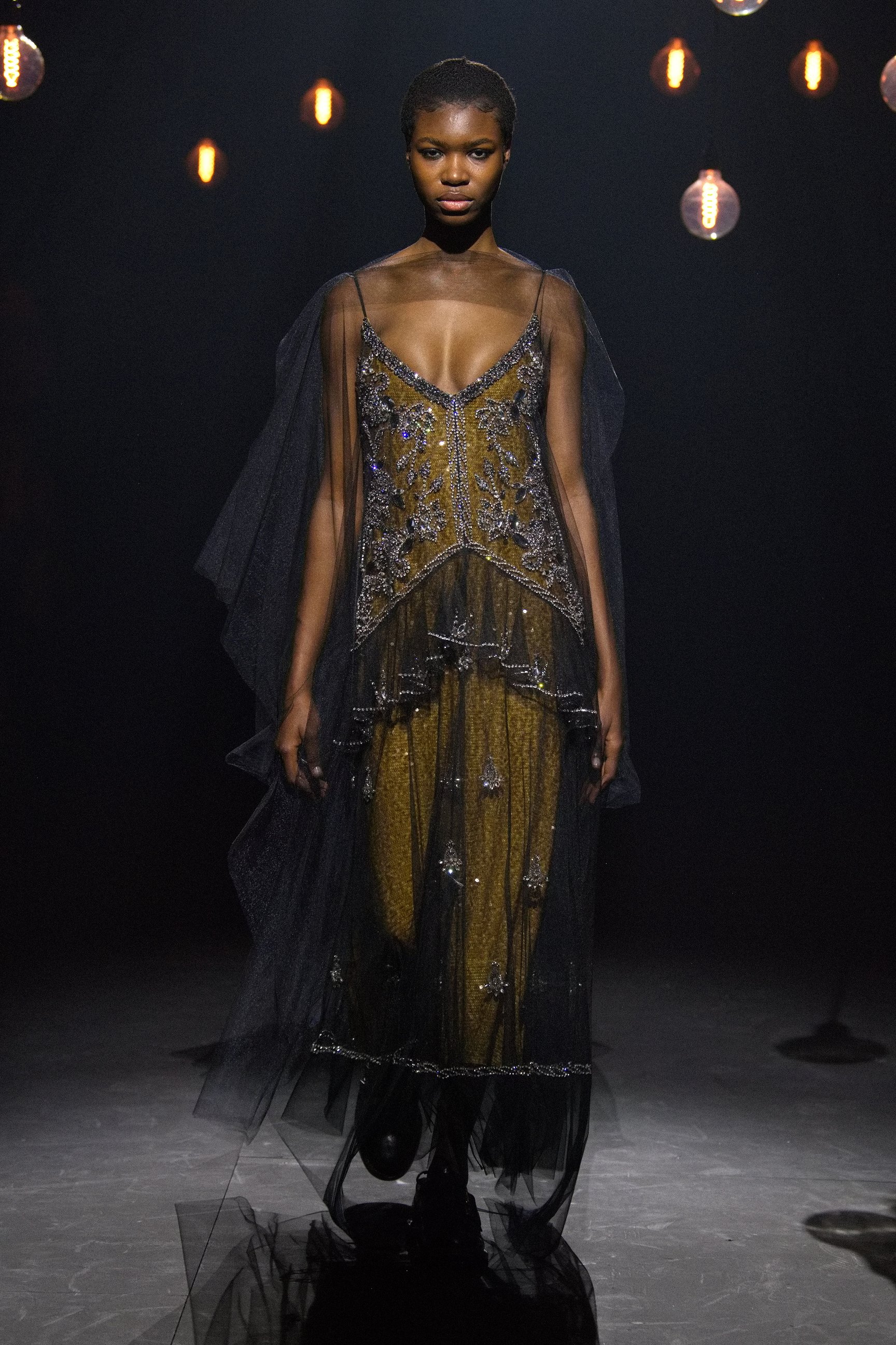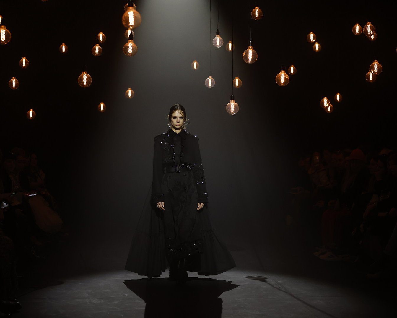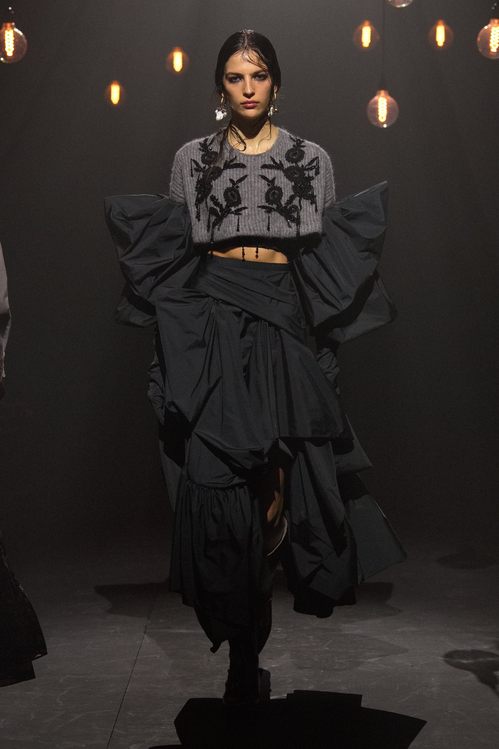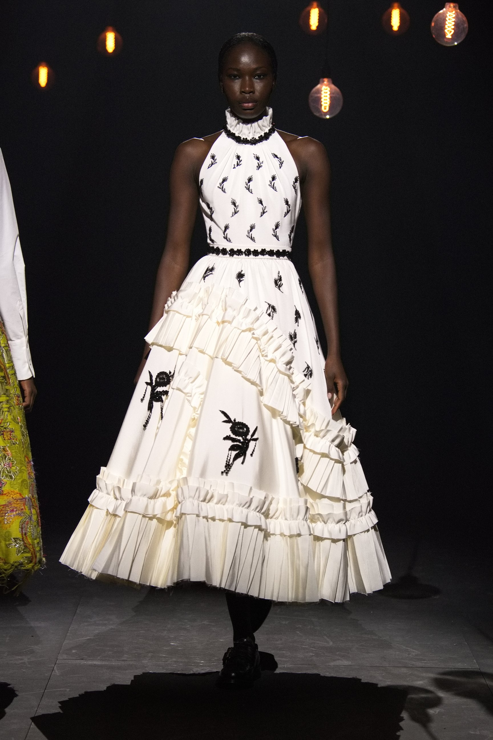 アーデムは今回のショーで、その女性たちを現代へと解き放った。無数の電球が吊り下げられた薄暗い空間に、ヴィクトリア調のドレスをまとったモデルが次々と登場。アーデムが得意とするフラワープリントが取り入れられ、イエローやライラックといったカラーリング、そしてパフトップのオペラグローブなどが幻想的なムードを盛り上げた。