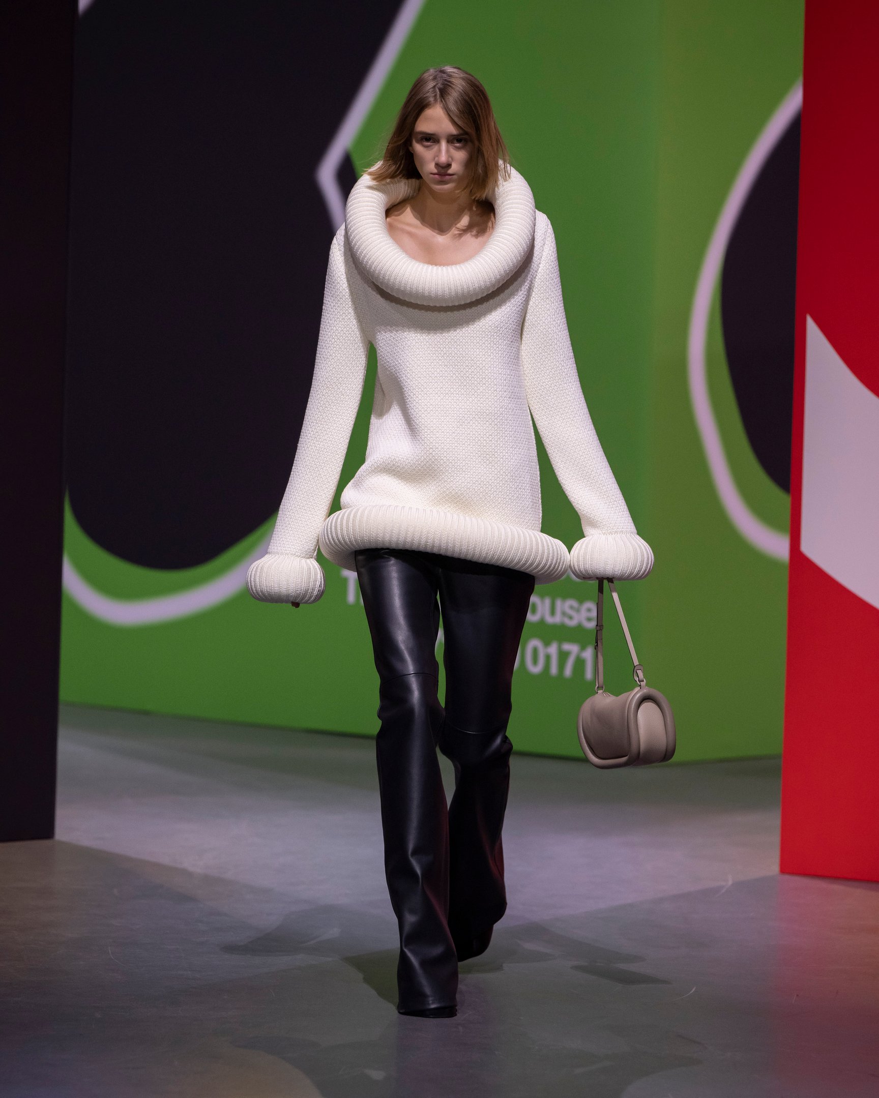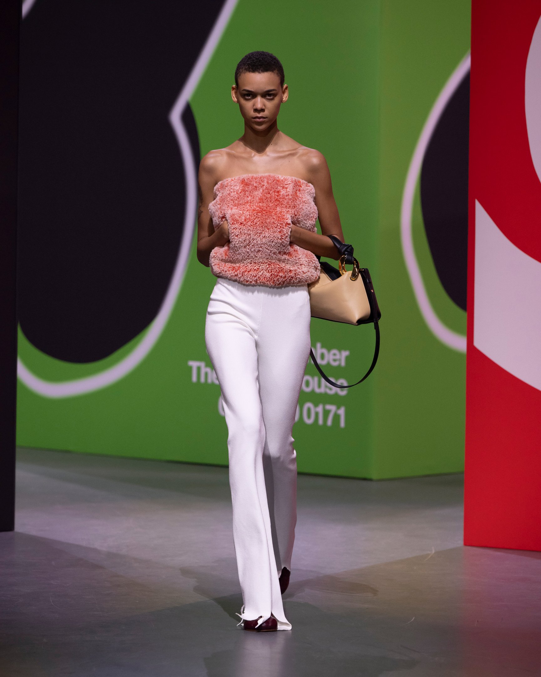 そのほか、ファーやフェザーなどを部分的に使ったユニークなシルエット、ビッグサイズのトートバッグなどもアクセントをプラス。また、ラペルを拡大したアウターやカンガルーポケットのベアトップ、襟元や袖口がチューブ状になったニットなど、過去のアーカイブアイテムをブラッシュアップして復活させ、15周年の節目にあらためてJW アンダーソンが持つ前衛的なアプローチを示した。