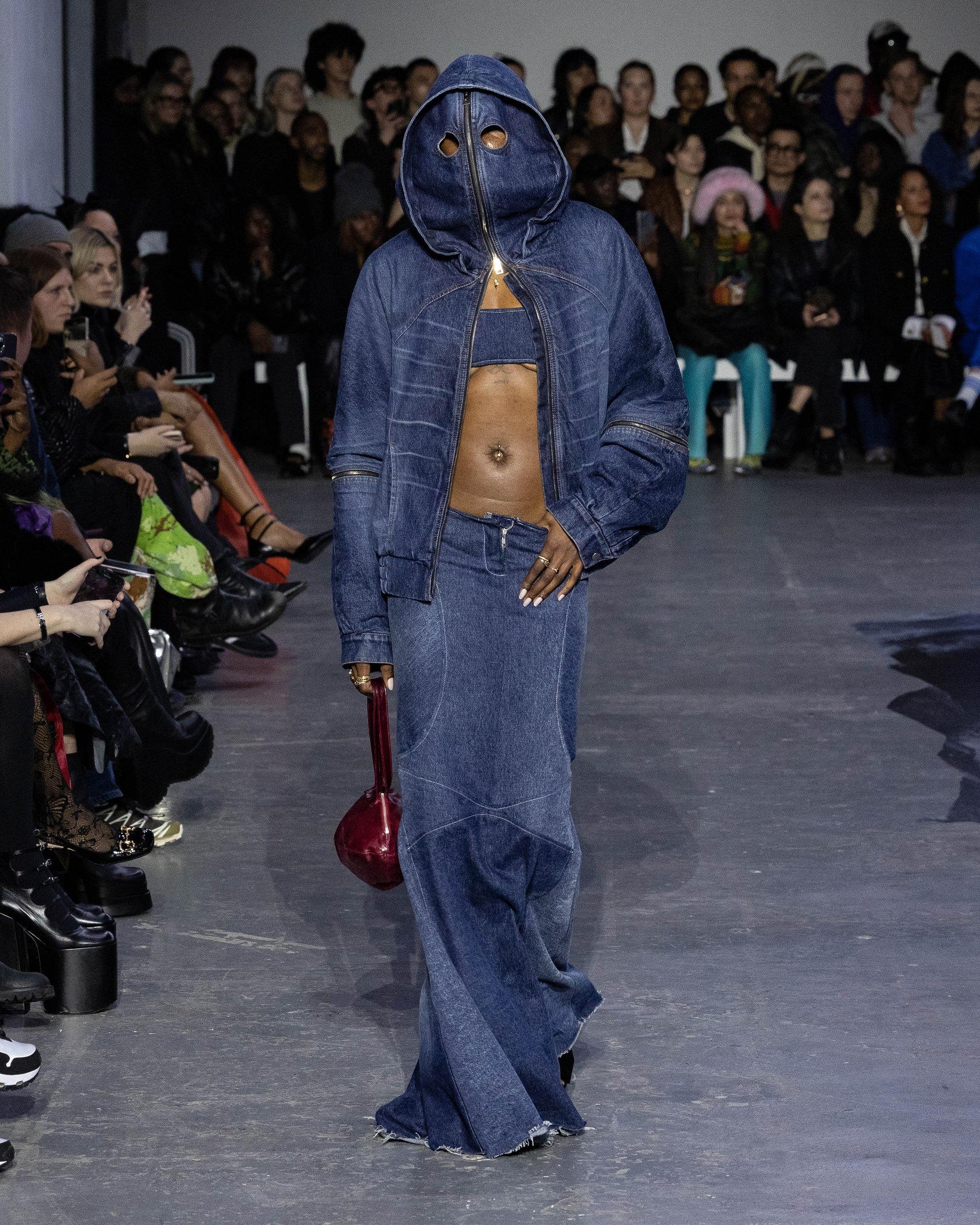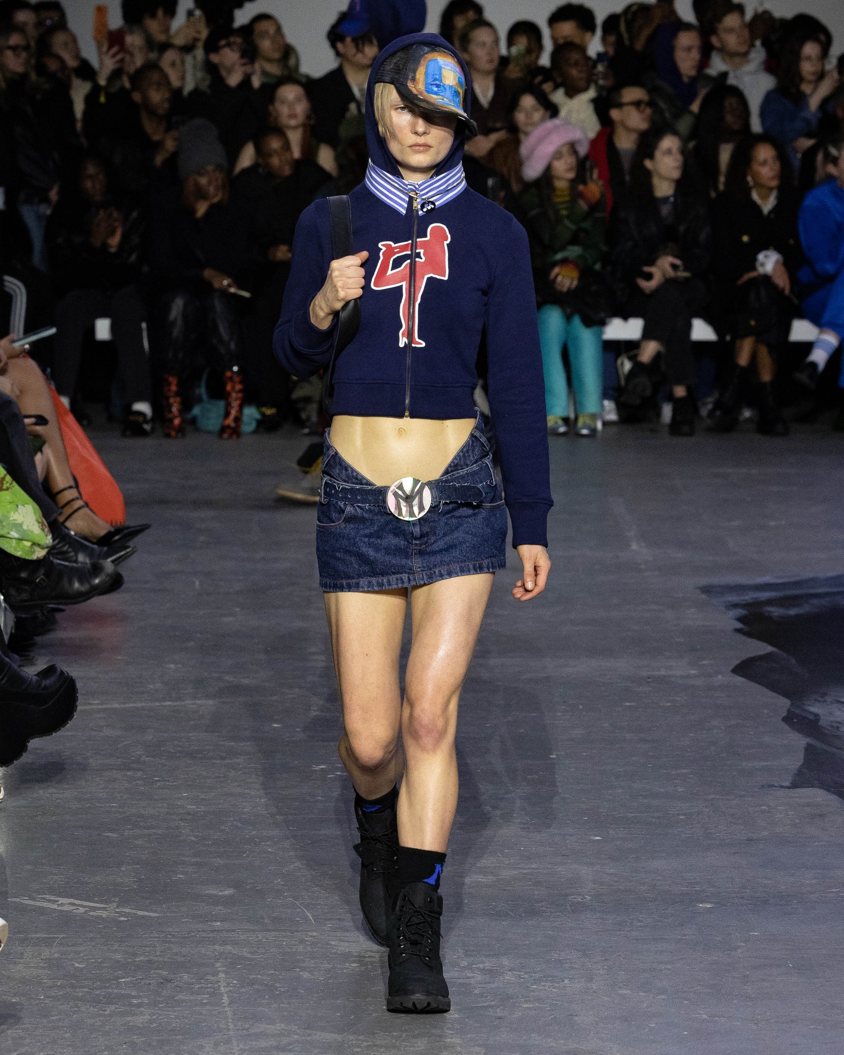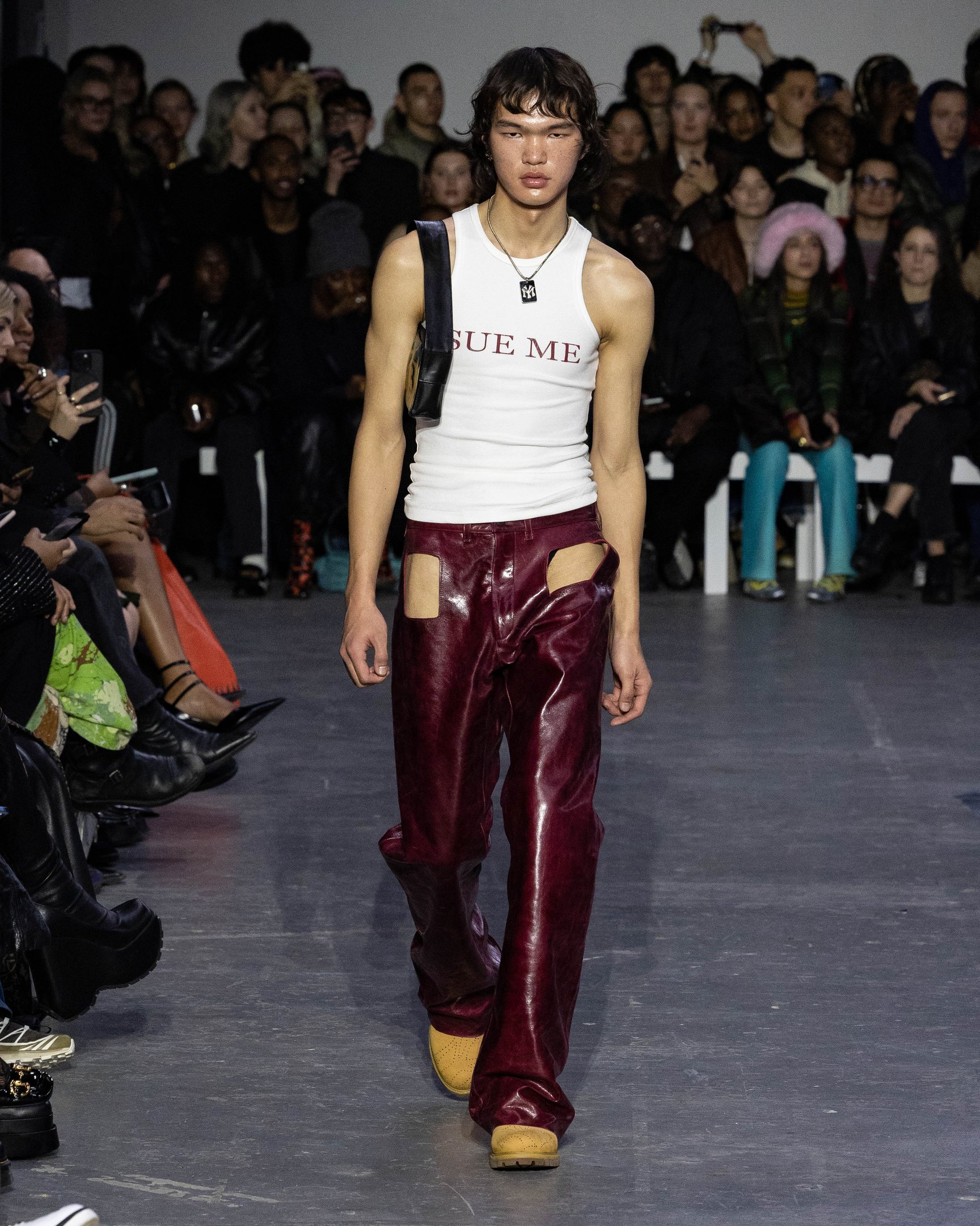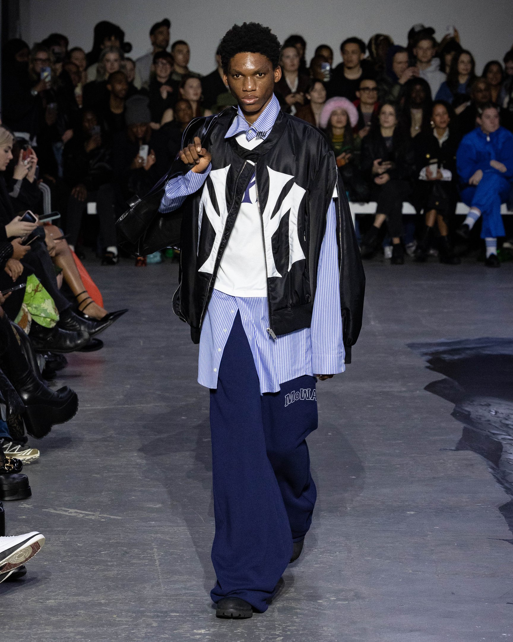 会場の中央には大きな穴が描かれており、映像で見ると建物が崩壊したかのようなトリックアートとなっている。スウェットやキャップには、ヤンキースロゴ風の「MY」や、MoMA風の「MoWA」グラフィックなど、ニューヨークを代表するモチーフを引用。また、膝までずり落ちたローライズデニム、あるいはハイレグのショーツで大胆なルックを完成させた。デザイナーが得意とするレザーアイテムも多数展開し、ショー終盤には顔周りを電飾で光らせたモデルも登場。最初から最後まで、ユニークなギミックで観客たちを驚かせた。