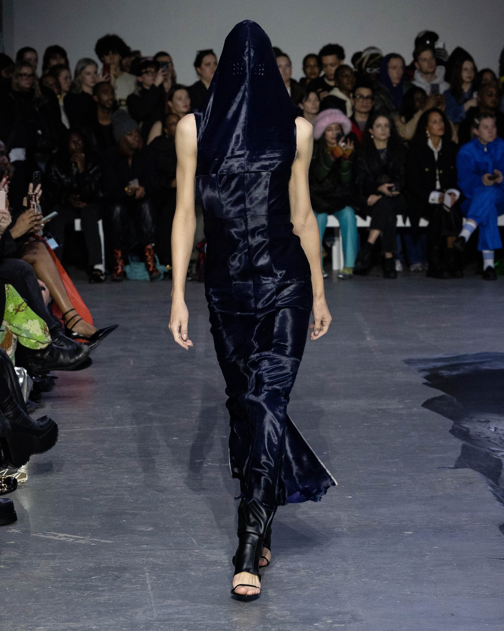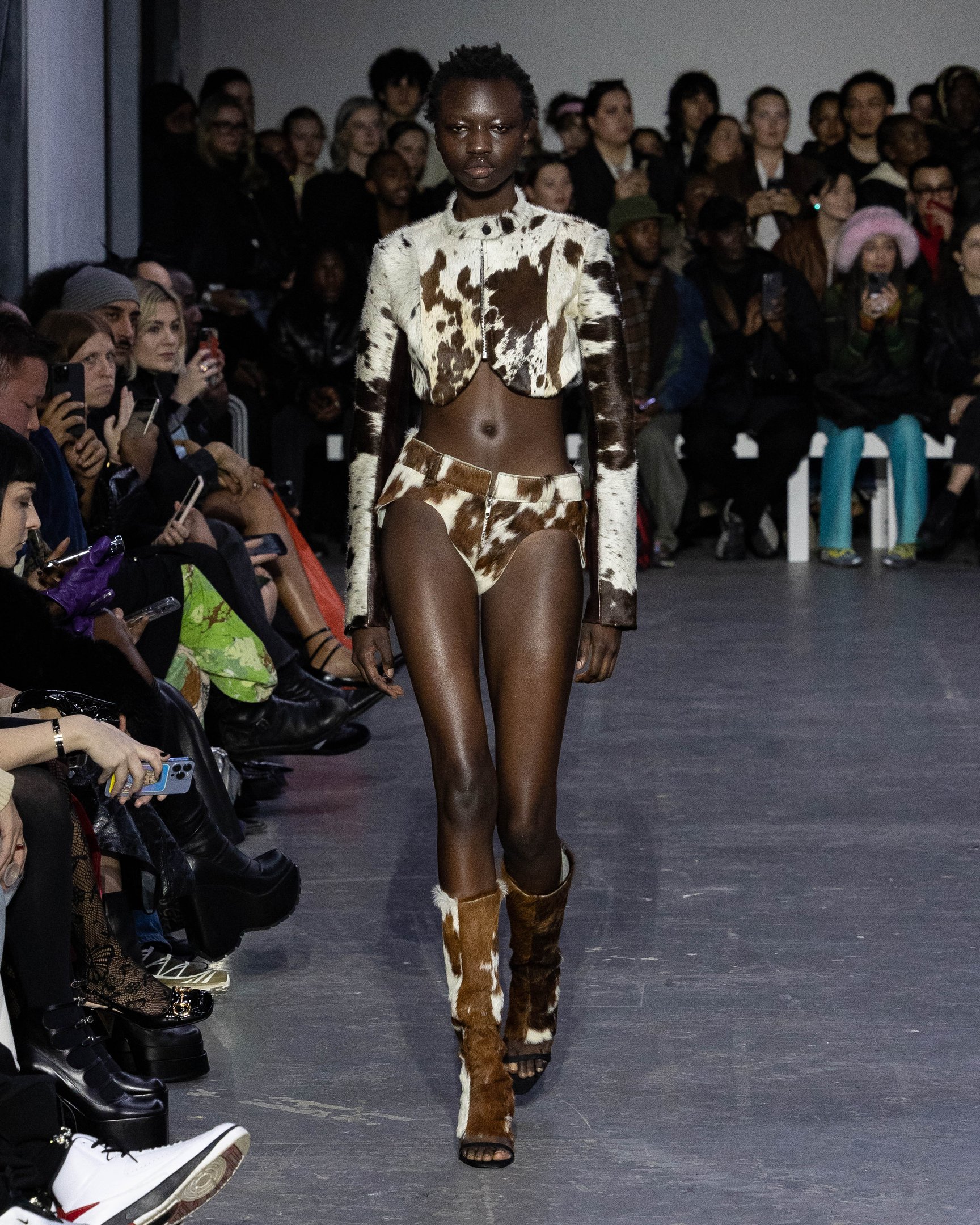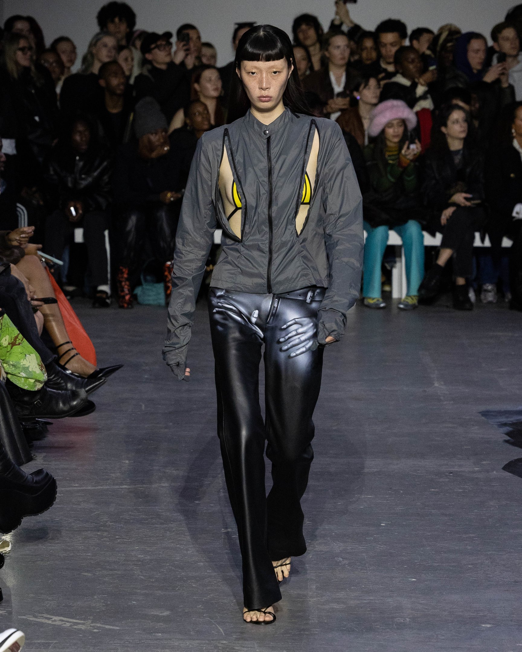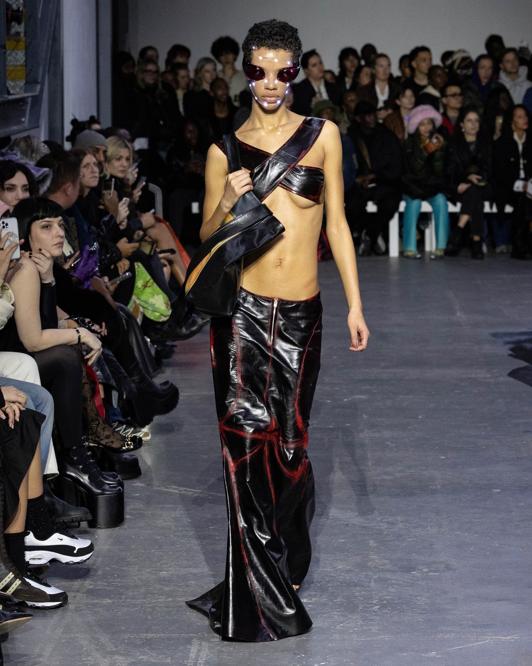 会場の中央には大きな穴が描かれており、映像で見ると建物が崩壊したかのようなトリックアートとなっている。スウェットやキャップには、ヤンキースロゴ風の「MY」や、MoMA風の「MoWA」グラフィックなど、ニューヨークを代表するモチーフを引用。また、膝までずり落ちたローライズデニム、あるいはハイレグのショーツで大胆なルックを完成させた。デザイナーが得意とするレザーアイテムも多数展開し、ショー終盤には顔周りを電飾で光らせたモデルも登場。最初から最後まで、ユニークなギミックで観客たちを驚かせた。