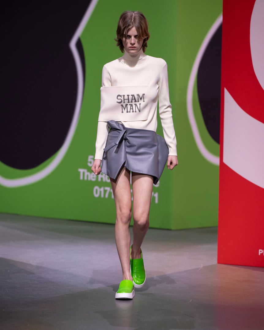 そして逆さまになったスマイルマークのサロペットや、イギリスの大手スーパー「テスコ(Tesco)」のビニル服をあしらったドレスなど、クラークの代表的な衣装がルックに落とし込まれた。「SHAM MAN(偽物の男)」「THE DENTIST(歯医者)」といった意味深な文字を取り入れたトップスもその一部だという。