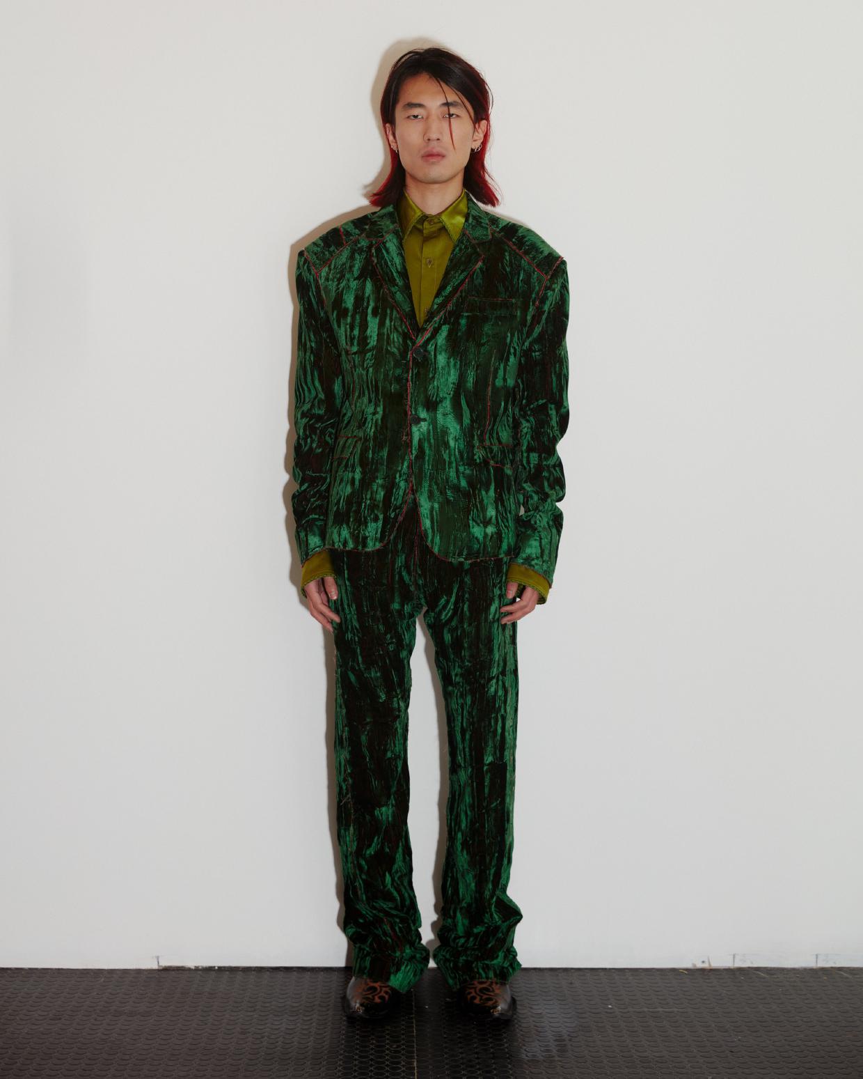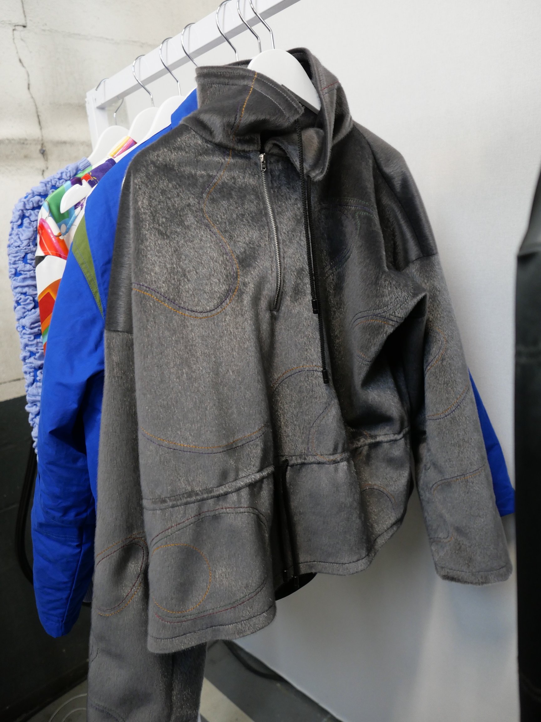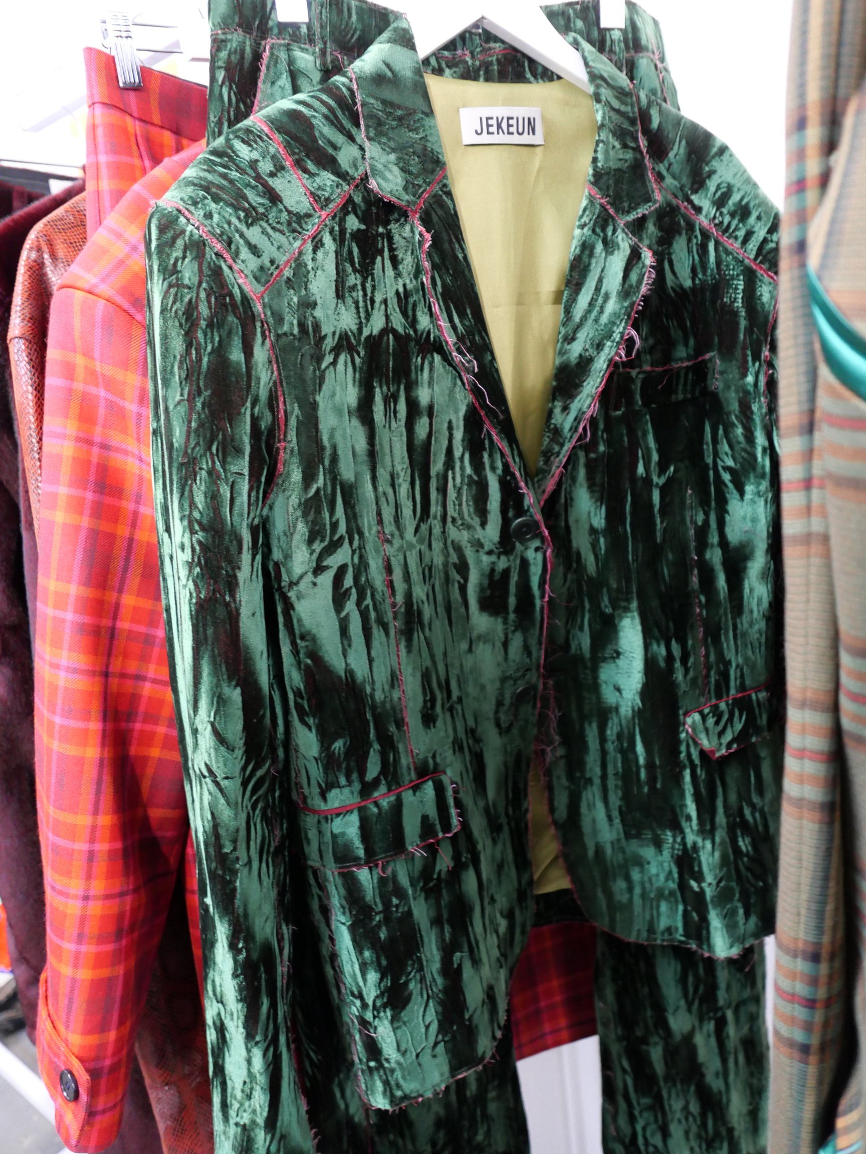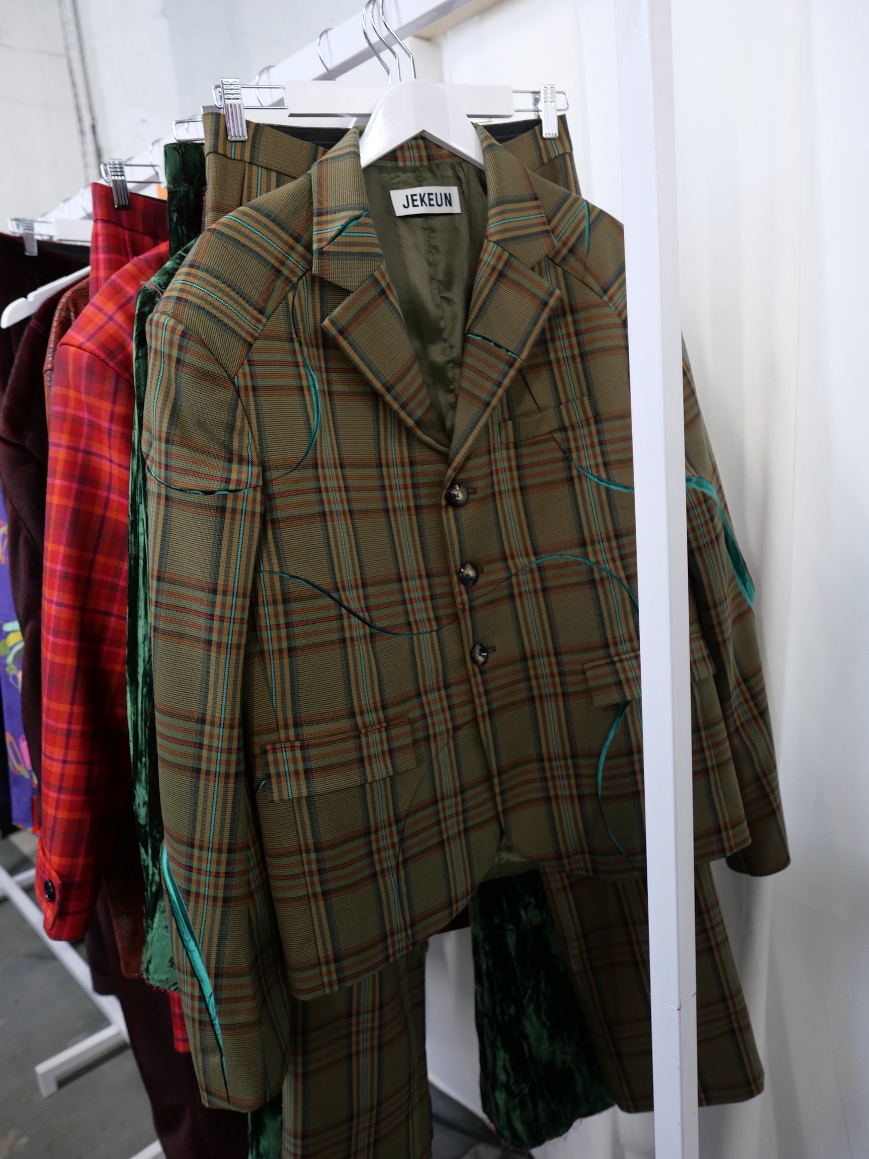 日本の血筋を引き、中国で暮らした経験もある韓国人デザイナー、ジェケウン・チョウ(Jekeun Cho)。一般大学を卒業したが、友人に勧められたウォン・カーウァイ(Wong Kar Wai)監督の「花様年華」に感化され、憧れだったファッションデザイナーの道に転向。ロンドンへ渡り、ロンドン・カレッジ・オブ・ファッションを卒業、2021年秋冬に自身のブランドをスタートした。ジェケウンが強く関心を注ぐのは人間の心理。心の内側を見せるように裏地をカッティングで露出させ、脳細胞を連想させる刺繍やニッティング、サイケデリックな柄や極彩色など、素材やテクニックなどあらゆる要素で人間の心理を表現している。