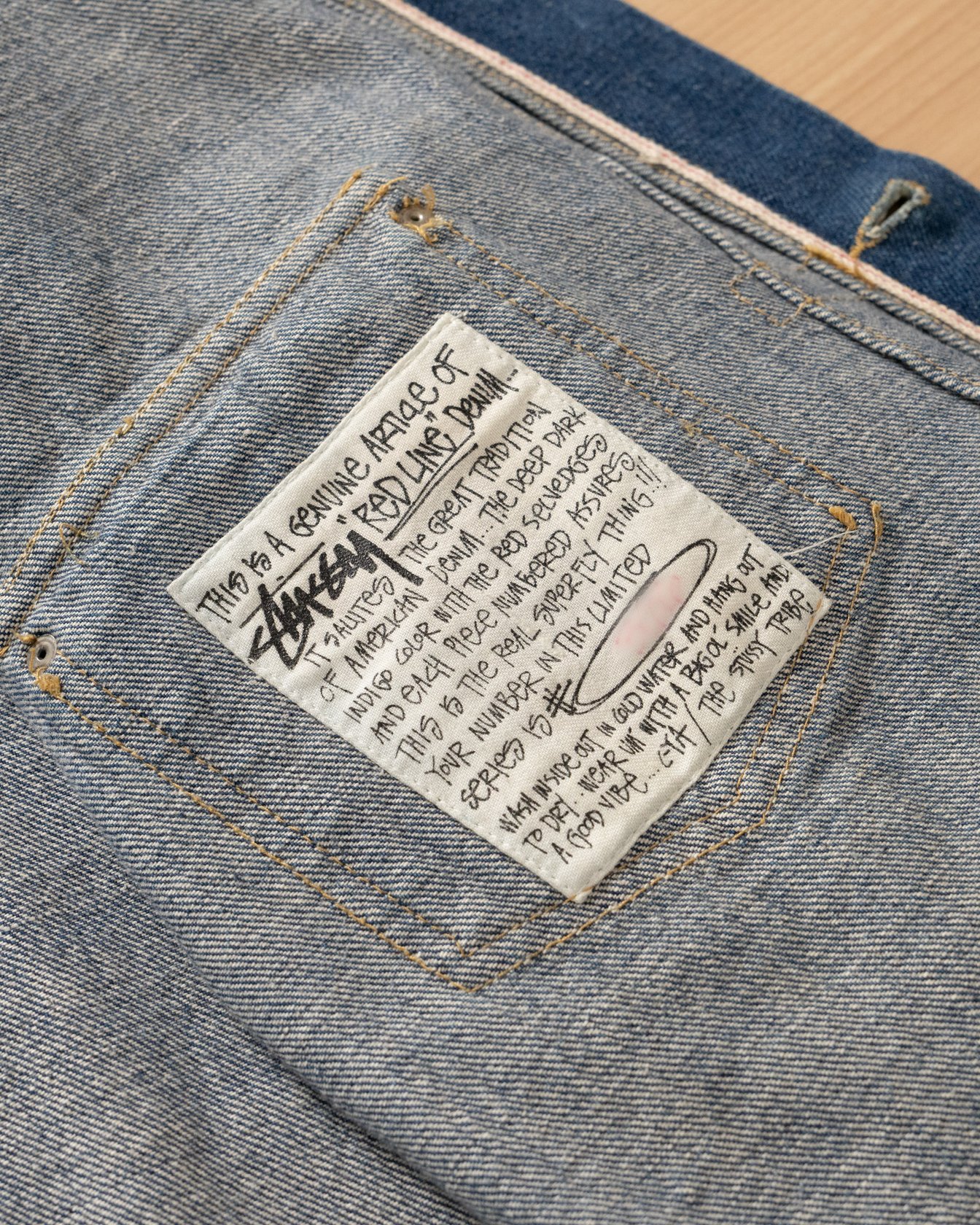 十倍:本当ならオリジナルの506XXも欲しいんですけど、サイズ的に「スプリットバック」と呼ばれる大きいサイズのものはかなり高騰していて(笑)。それと当時の作り的にサイズが小さく、僕はなかなか合わないんですよね。とはいえ、このステューシーの「レッドライン」で作られたモデルは名作なので、比べるのもアレですけど(笑)。オマージュというには完成度が高くて、純粋にデニムとして見ても素晴らしいと思います。色もインディゴが濃くて、ここに“耳”がついてて、着てみて触りながら「なるほどなぁ」って感心しています。