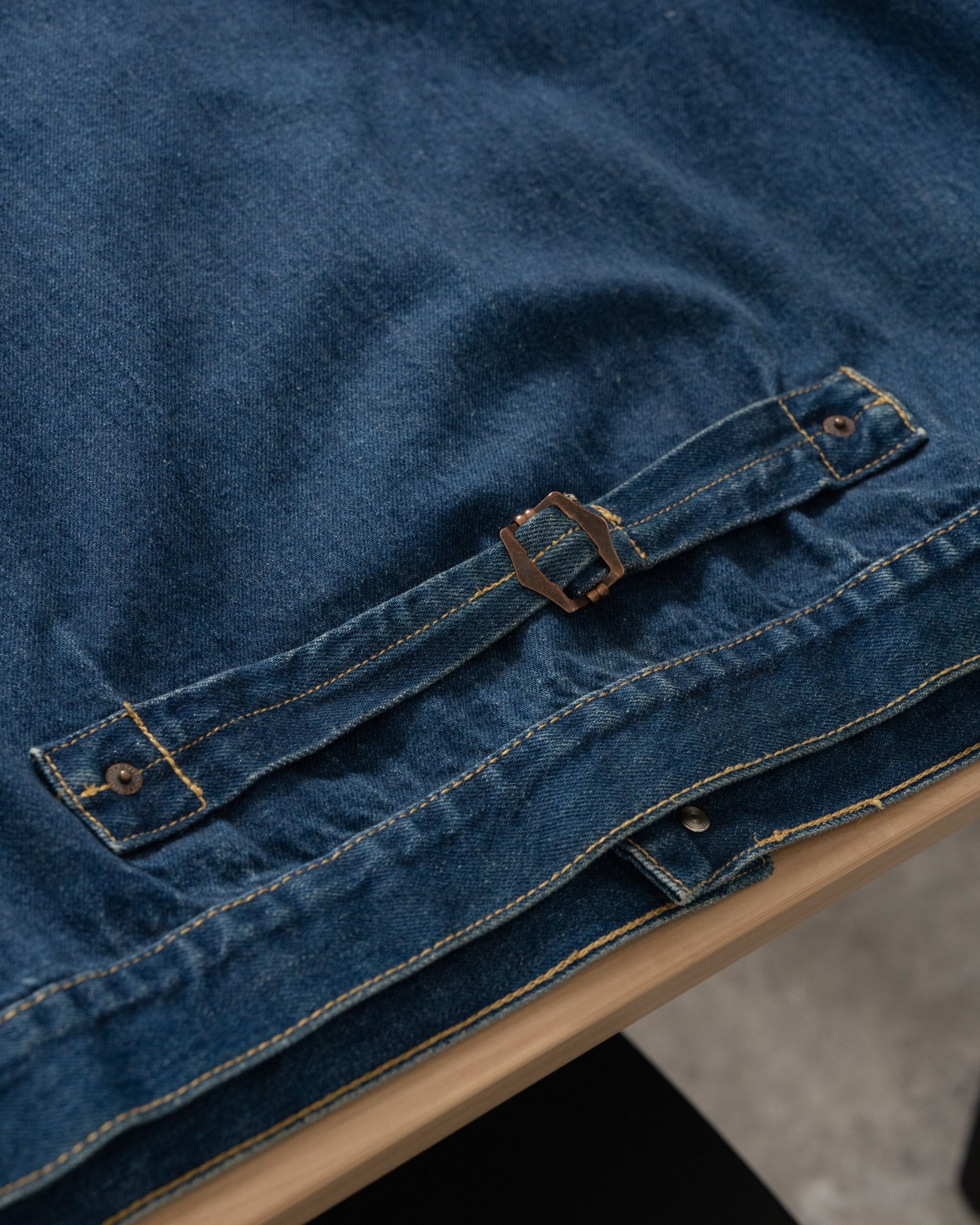 十倍:このネタ元は、皆さんご存じの「リーバイスファースト」と呼ばれる506XXという形なんですけど、リーバイスが最初に作ったデニムジャケットのことです。ポケットが1つで、プリーツと後ろの「シンチバック」と呼ばれるバックルがファーストの特徴です。本当のファーストは「短丈ボックス」という短い丈で、ボックスシルエットなんですよね。そのシルエットがどうしても体型に合わないので、これで代替しようと思って買いました。