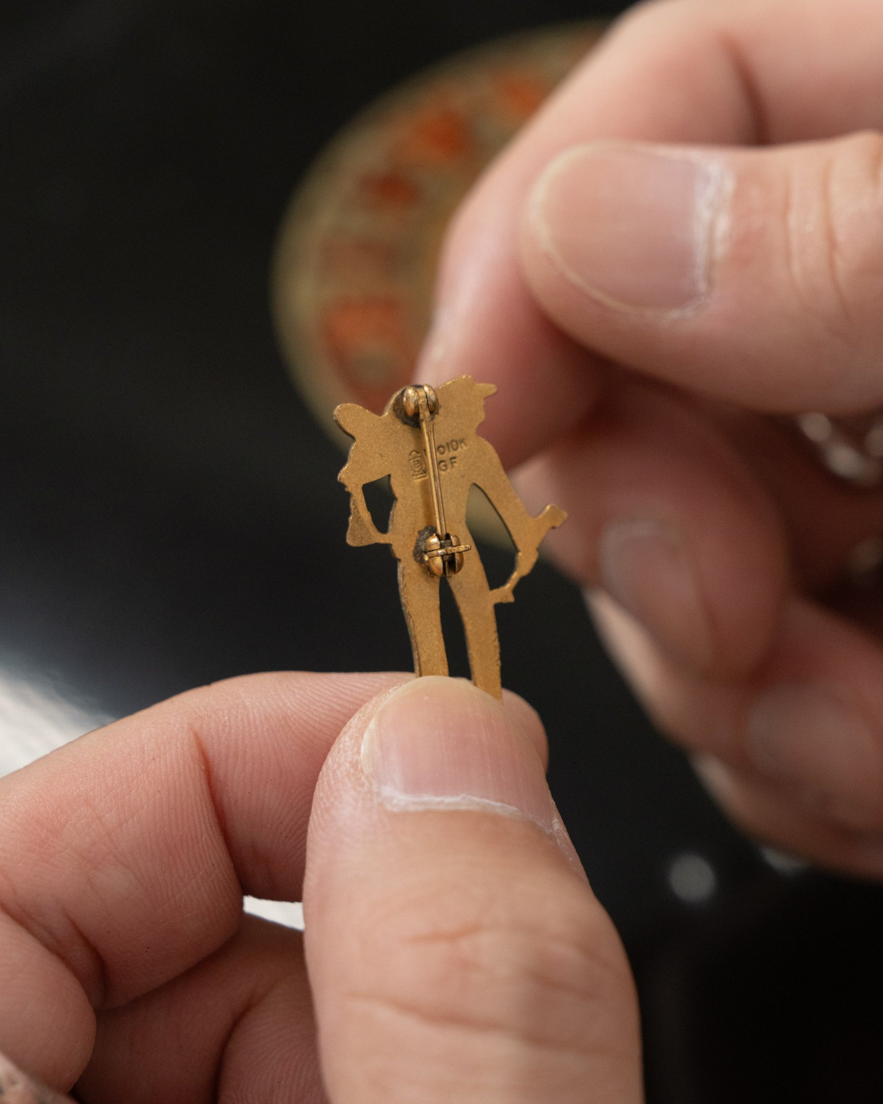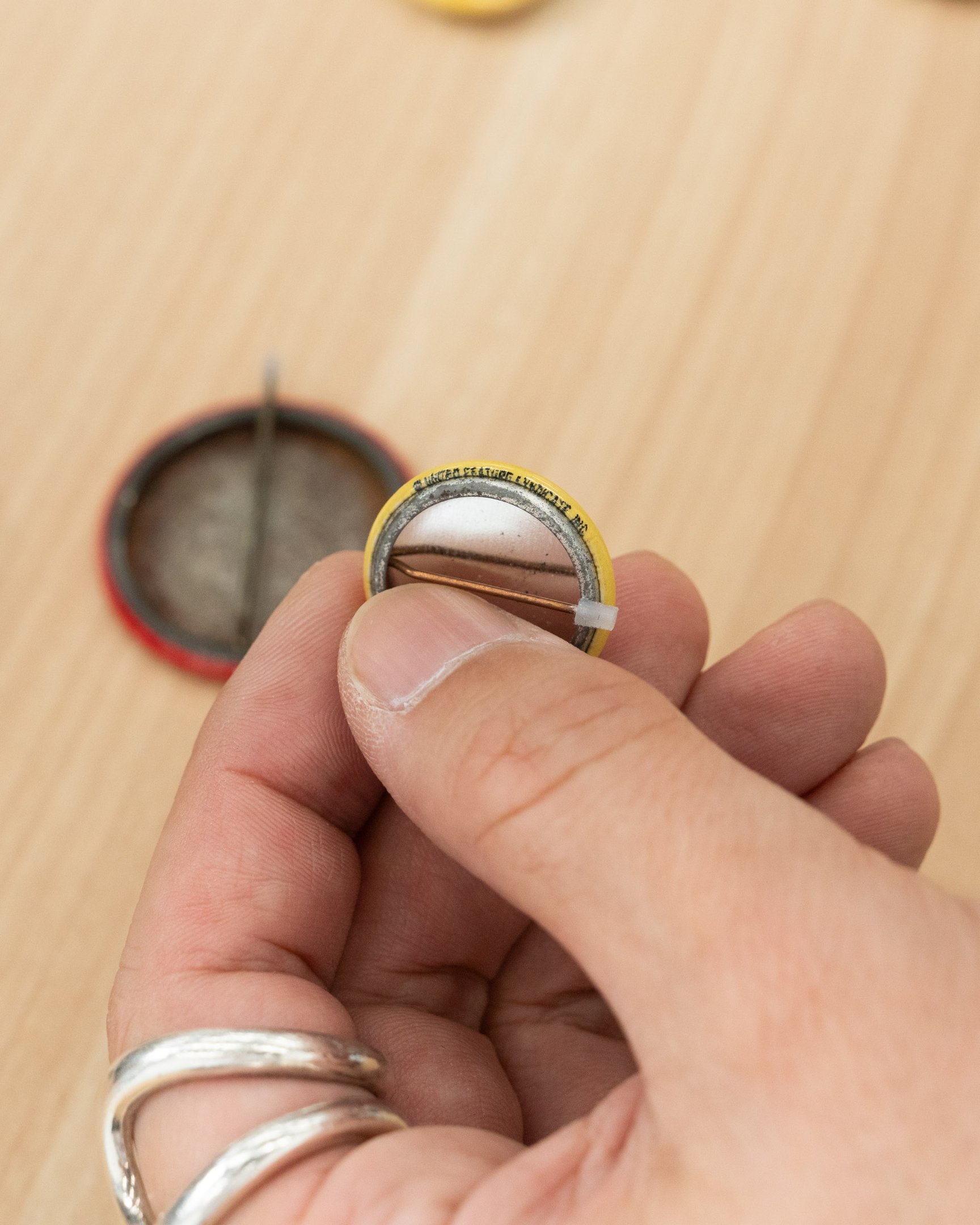 十倍:作っている会社名が刻印されていることが多いので、そこから判別しますね。あとはプリントなどもありますけど、一番分かりやすいのは「バッジの針がどう収まっているか」ですね。針の部分はどんどん進化してバッジの中に収まるようになるんですが、一番古いものは思いきり針が出るんですよね。