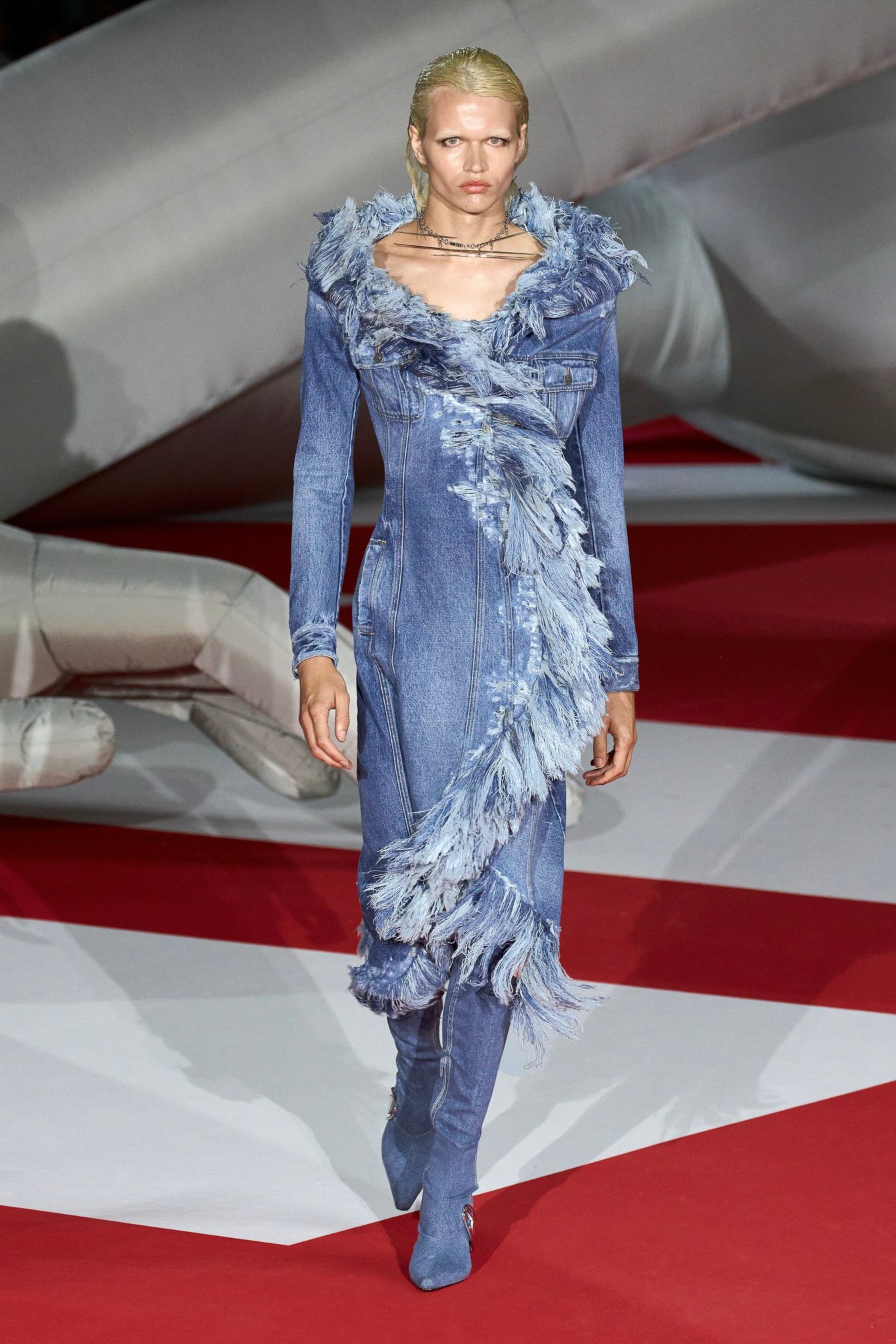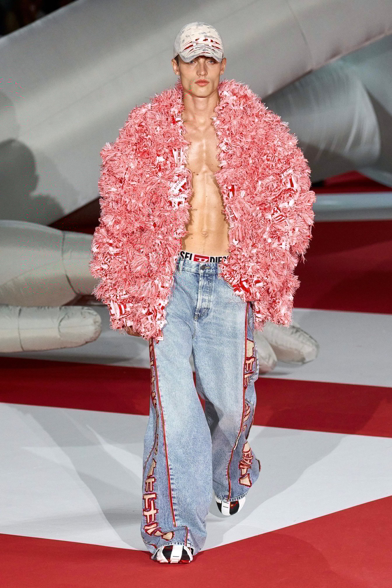 ユーティリティベスト、カーゴパンツといったワークウェアをドレッシーに仕立てたセットアップをはじめ、フューチャリスティックなメタリックドレス、ひび割れ加工のニット、1万5000枚以上のディーゼルのラベルにダメージを施しファーに見立てたコートなど。Y2Kムードのスタイリングと相まって、グレンの実験的なエネルギッシュさが際立った。