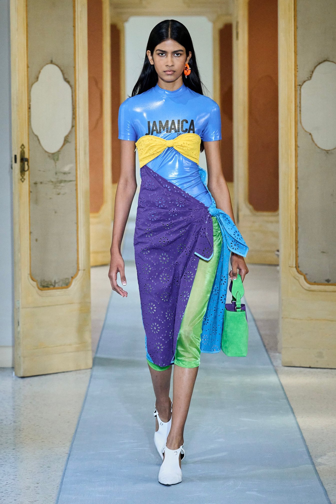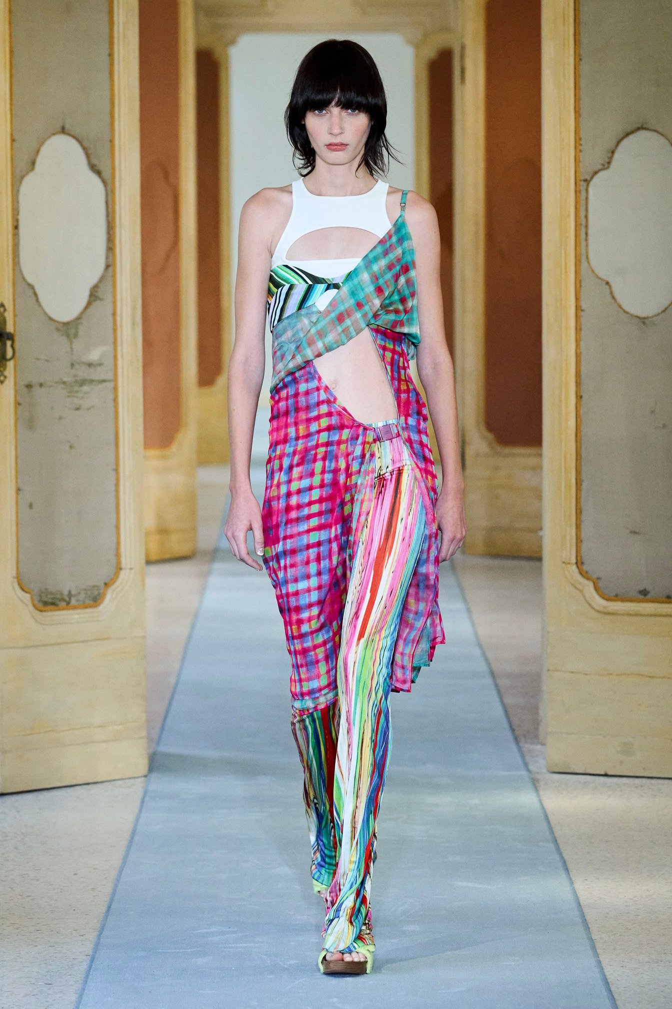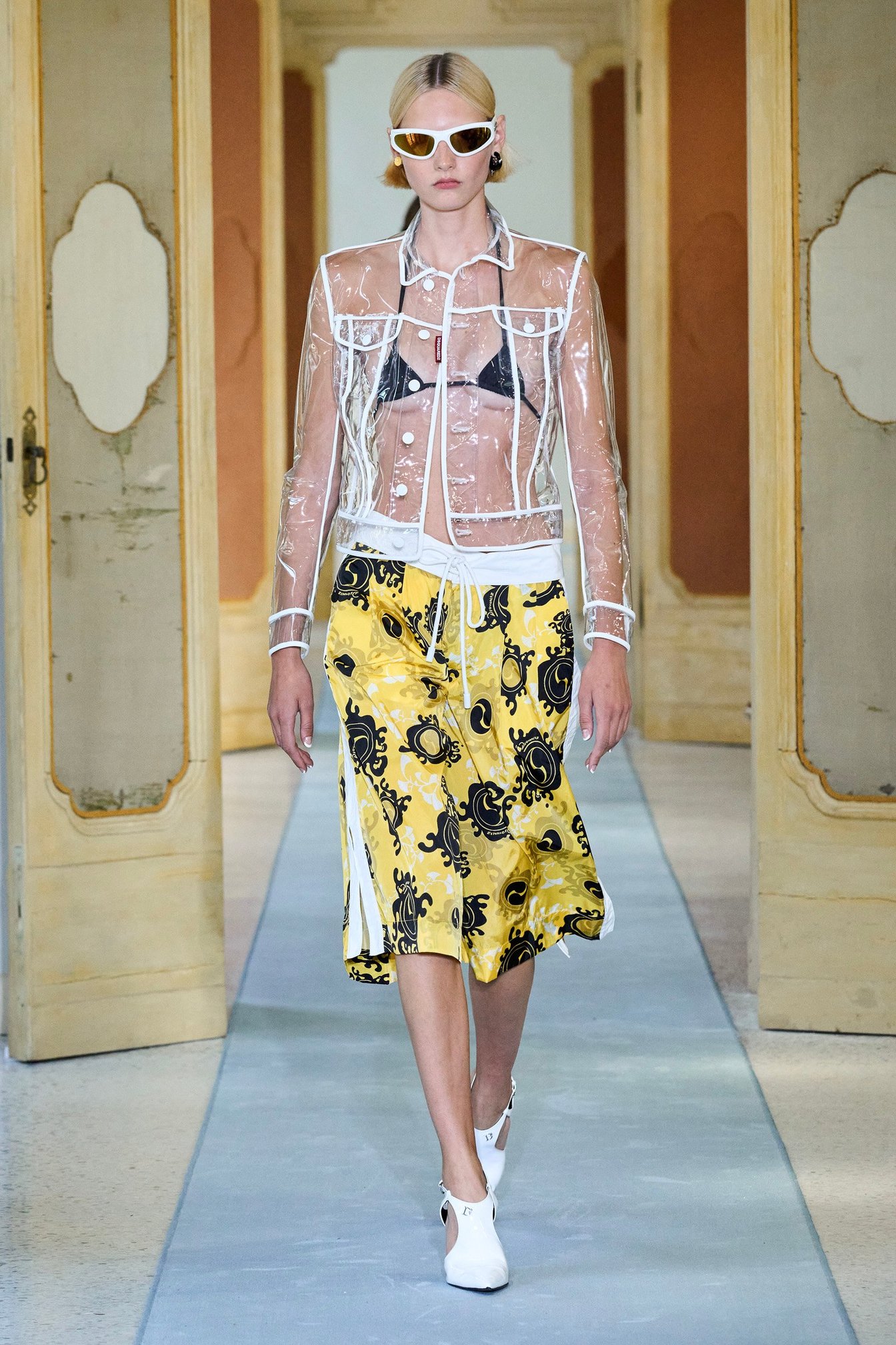 淡い長袖のビーチ風トップスにチェックのシャツにベイビーブルーのレースを重ね、フィルムのように薄いテクノチュールのプリントスカートを合わせたファーストルックでショーがスタート。ウエットスーツをベストに仕立てたり、スイミングパンツをチューブトップや膝下パンツにデザインしたり、マイクロミニのビキニとPVC素材の透明ジャケットを合わせるなど、マリンスタイルを随所に取り入れ、スポーティーなラグジュアリースタイルを提案。