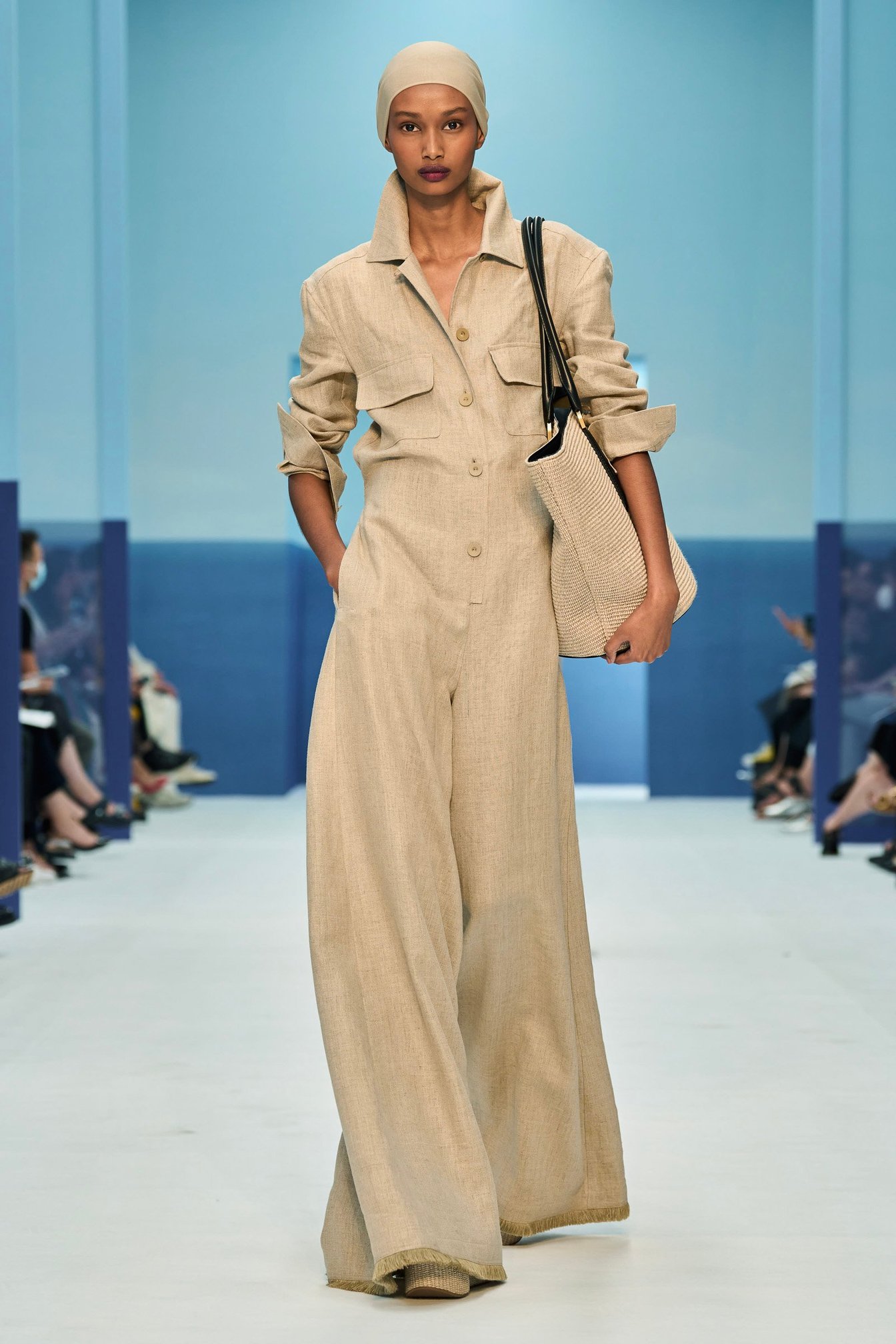 会場壁面の鮮やかな地中海ブルーが印象的な「マックスマーラ」のショーは、ゆったりとした音楽にのせてリゾートムード溢れるコレクションとなった。コレクションでは、太陽が降り注ぐ地中海一帯のリヴィエラに集ったボヘミアンたちに着目。中でも”リヴィエラ・スタイル"を体現した女性として、写真家ジャック=アンリ・ラルティーグ(Jacques-Henri Lartigue)のミューズであり恋人のルネ・ペルル(Renee Perle)とインテリアデザイナーで建築家のアイリーン・グレイ(Eileen Gray)の2人をフィーチャー。