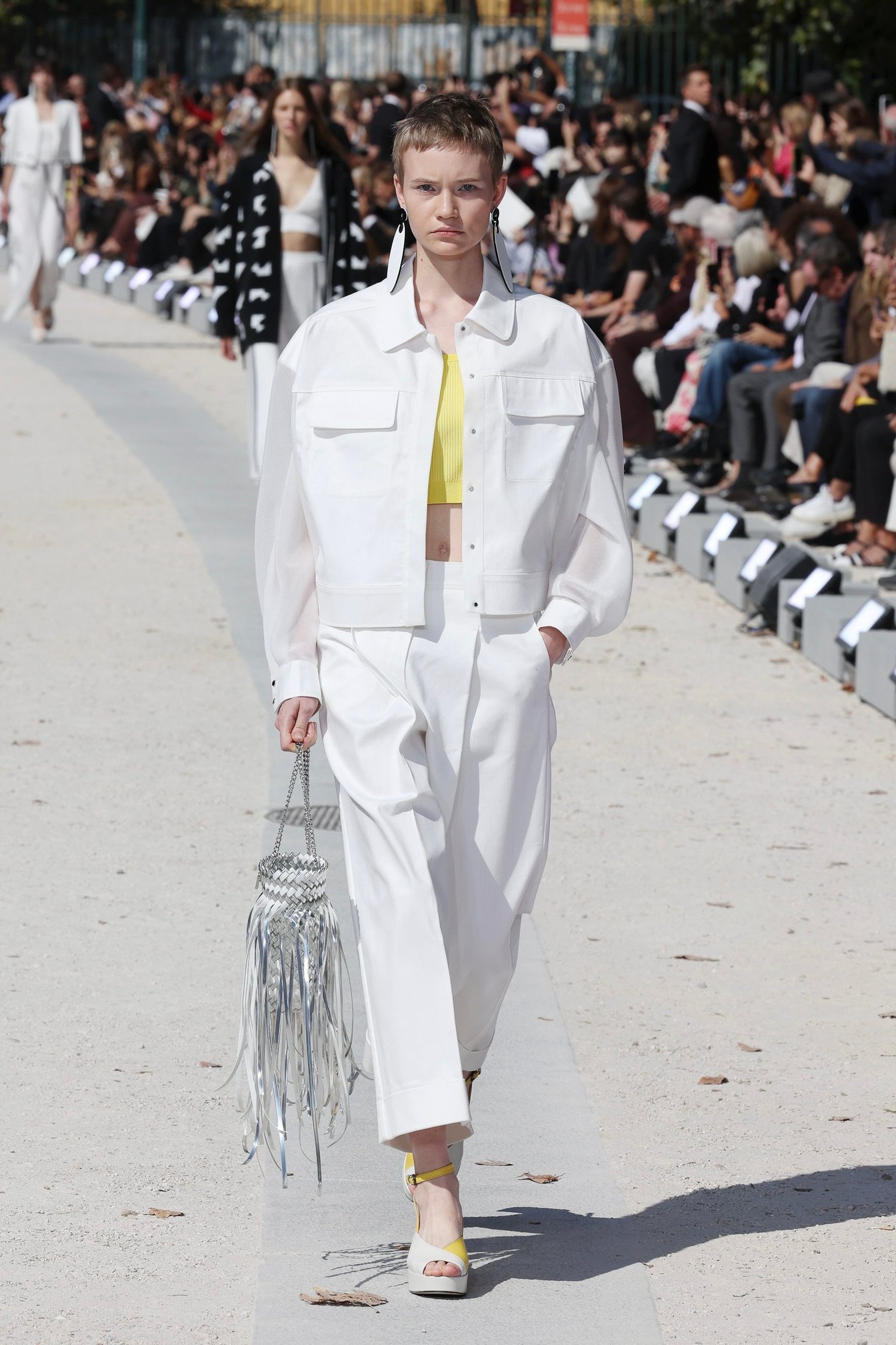 フリンジを垂らした編み込みのバッグや、ブランドのアイコンでもあるワイヤーバッグはマイクロサイズでアクセサリー感覚で取り入れられ、スタイリングに軽やかさを添えた。
