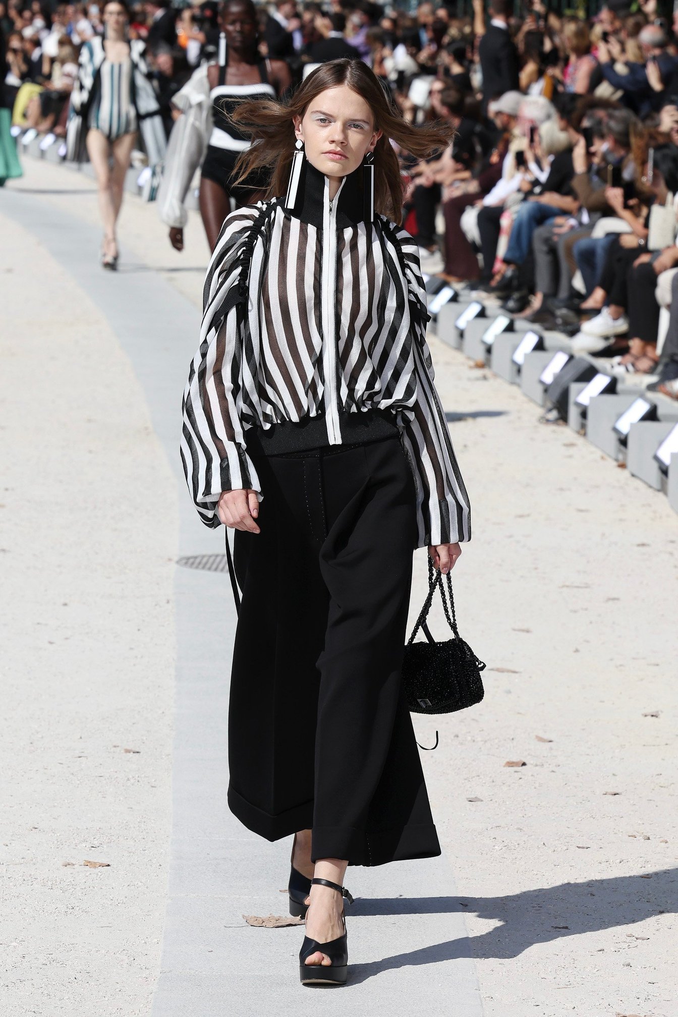 ベージュ、オフホワイト、ブラックを中心に構成されたコレクションでは、クロップド丈の半袖タートルネックやホルターネック、チューブトップに、リネンのロングスカート、ドレス風に仕立てたトレンチコート、生地をたっぷりと使ったセーラーパンツを合わせ、洗練さとしなやかさを兼ね備えたハンサムウーマンを表現。優雅な雰囲気を漂わせるつばの広い帽子や、スイムキャップ、ヘアバンダナなどの小物使いも、リゾート感を助長するアクセントとして取り入れられた。