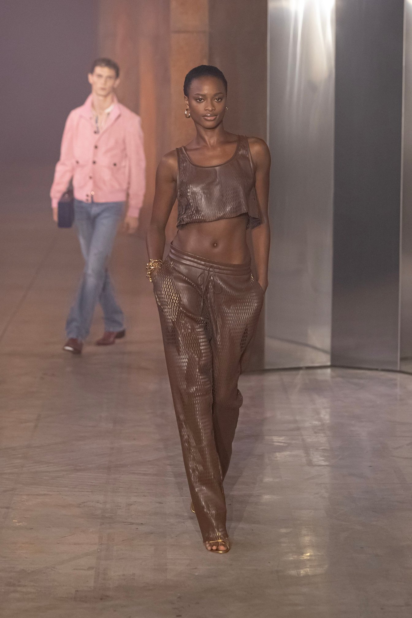 コルセットとレザーシャツをドッキングさせたデザインや、シルクシャツにカマーバンドでウエストマークをしたパンツスタイル、ベルトでウエストを絞ったレザーコートなどフェミニンなシルエットを強調するルックが多く登場した。