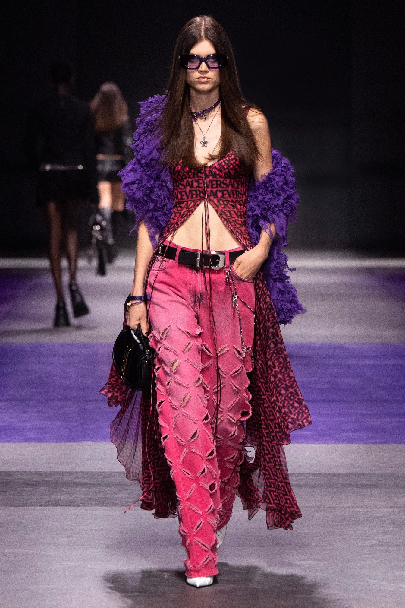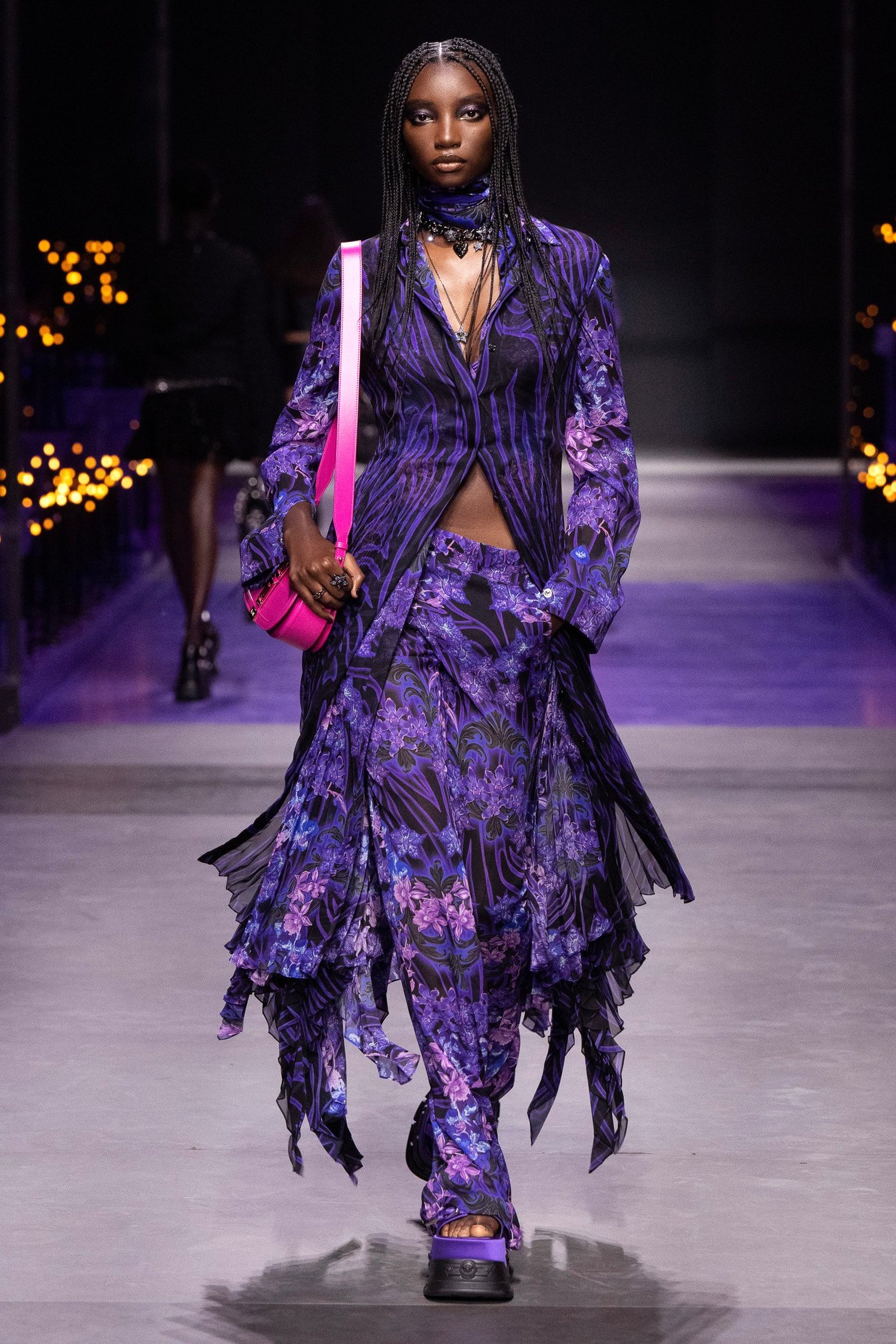 「ヴェルサーチェ(VERSACE)」は「DARK GOTHIC GODDESS(ダークゴシックの女神)」がテーマ。切り裂かれたようなカッテングを大胆にデザインしたドレスやフリンジが袖にあしらわれたレザージャケットといった冒頭のブラックのモノトーンルックに続き、パープルやフーシャピンクのカラードレスが続いた。