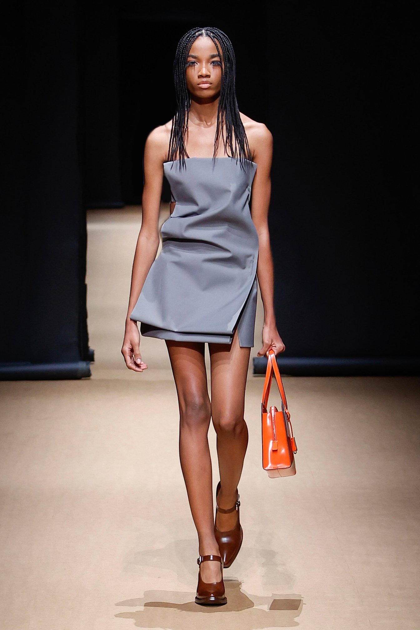 「プラダ(PRADA)」の今シーズンのテーマは「Touch of Crude(粗い手触り)」。会場の内装には黒の紙を部屋の仕切りとして使用(6月のメンズでは白だった)。くり抜かれた窓からは「ネオンデーモン」や「ドライヴ」などの作品で知られるデンマーク人映画監督のニコラス・ウィンディング・レフン(Nicolas Winding Refn)が手掛けたショートフィルムの断片的なシーンが投影され、同氏の視点を取り入れた没入型の空間を作り出した。