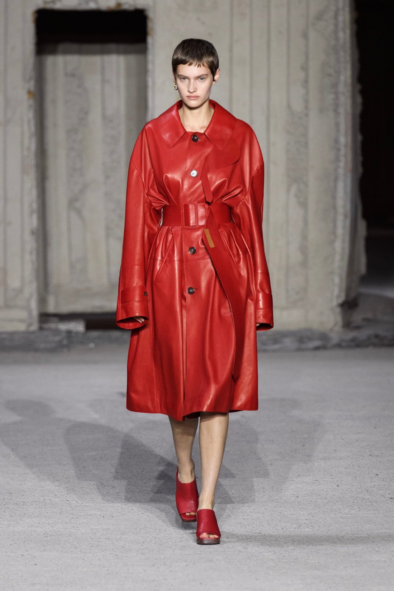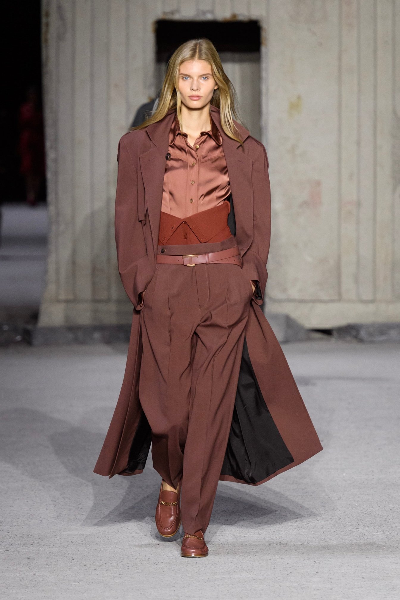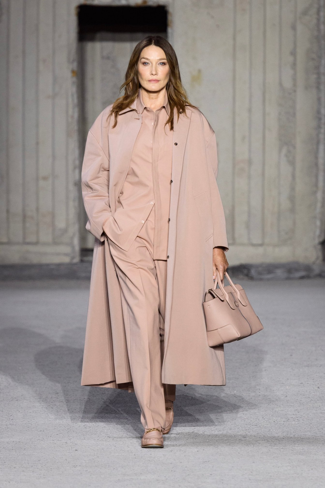 ファーストルックを飾ったカーラ・ブルーニは、ピンクベージュのワントーンルックで登場した。コレクションを構成するのはヌーディーなカラーを中心に、パウダーピンク、ダスティベージュ、レンガ色といった落ち着きのあるナチュラルな色味。ミニマルなスタイルの中に光るのはクラフトマンシップを感じさせるレザー使いで、レザーのシャツドレスはウエストがシェイプされており、体のラインにぴったりと沿う布のようなしなやかさが印象的。