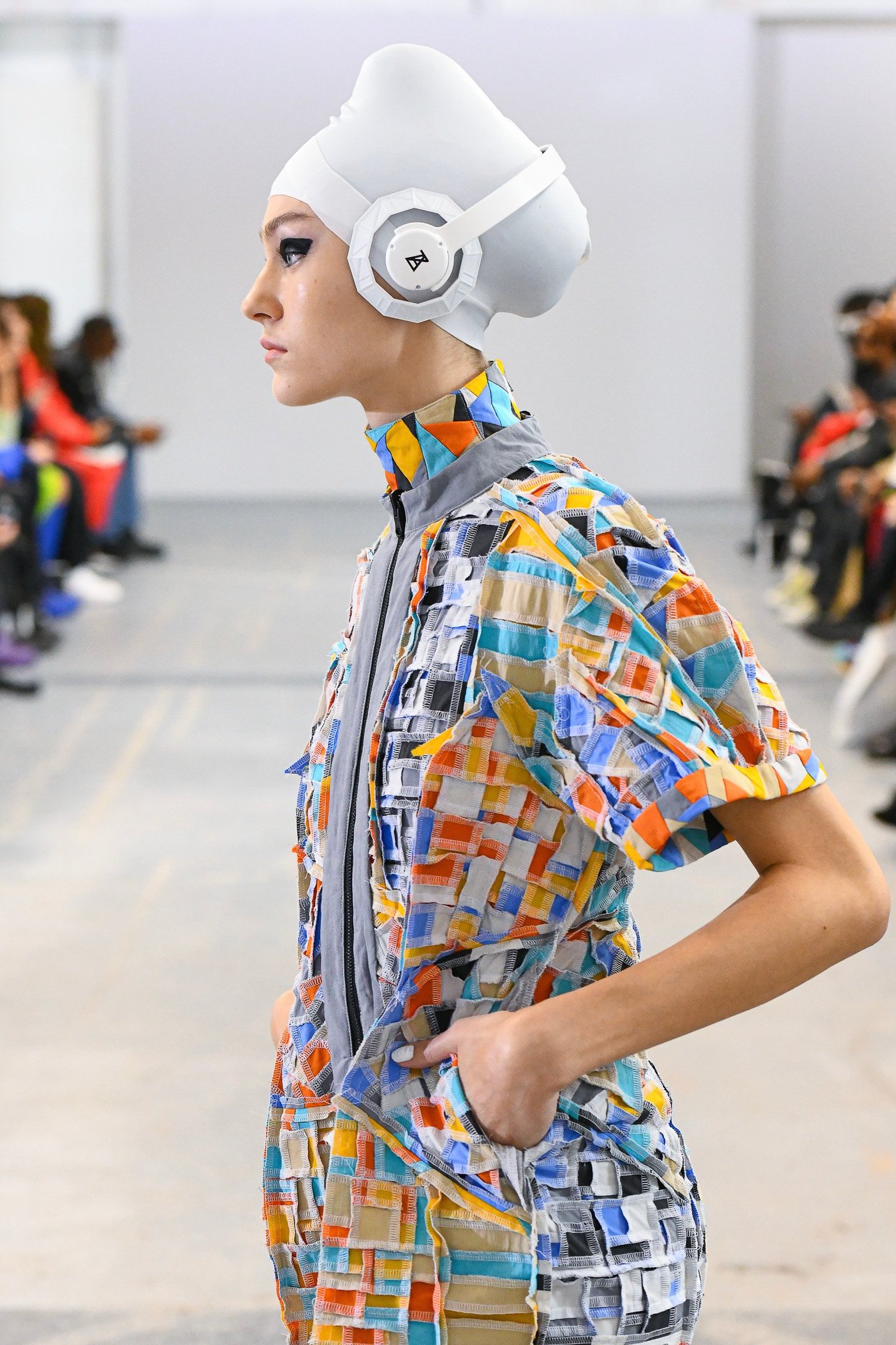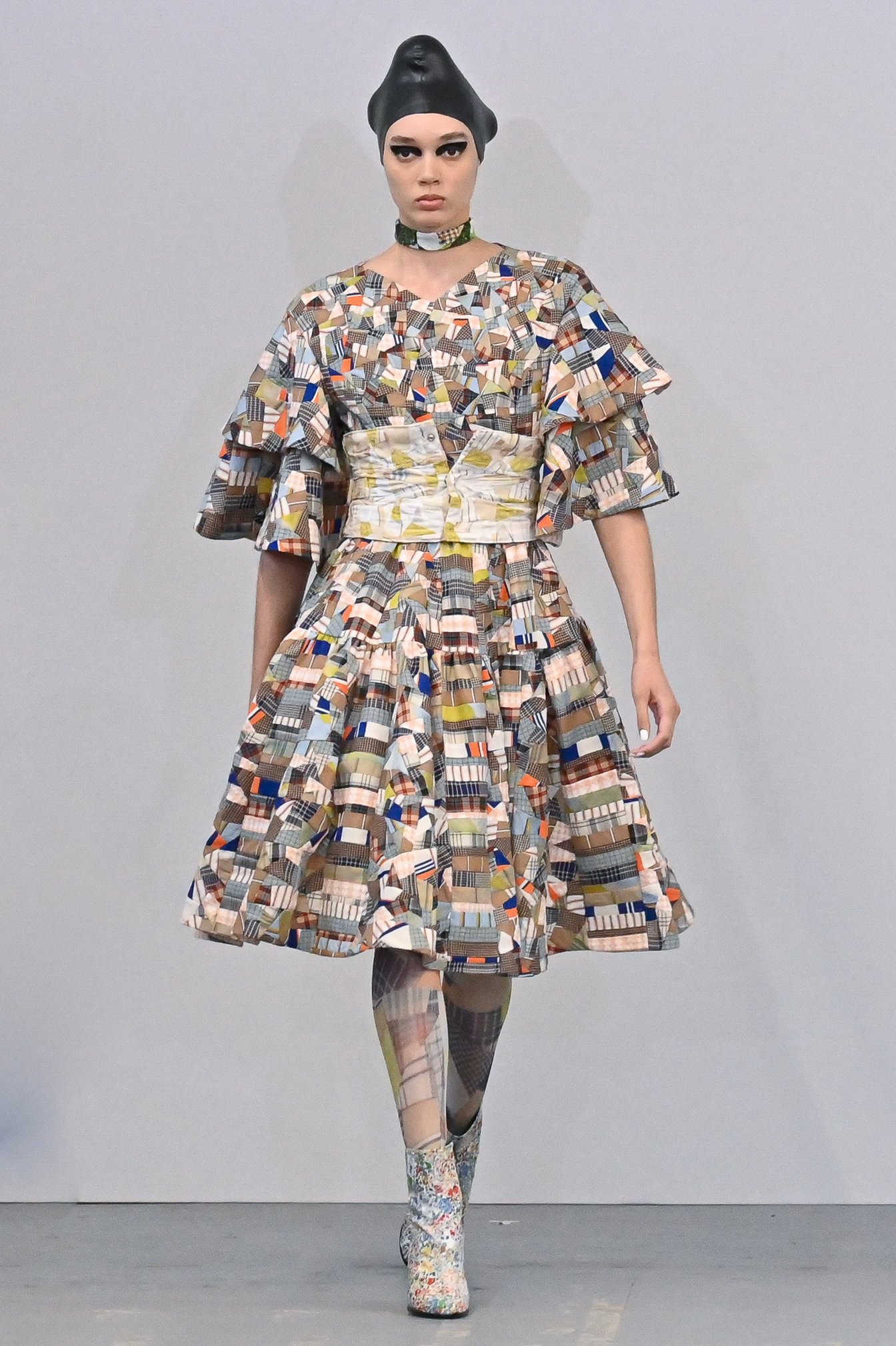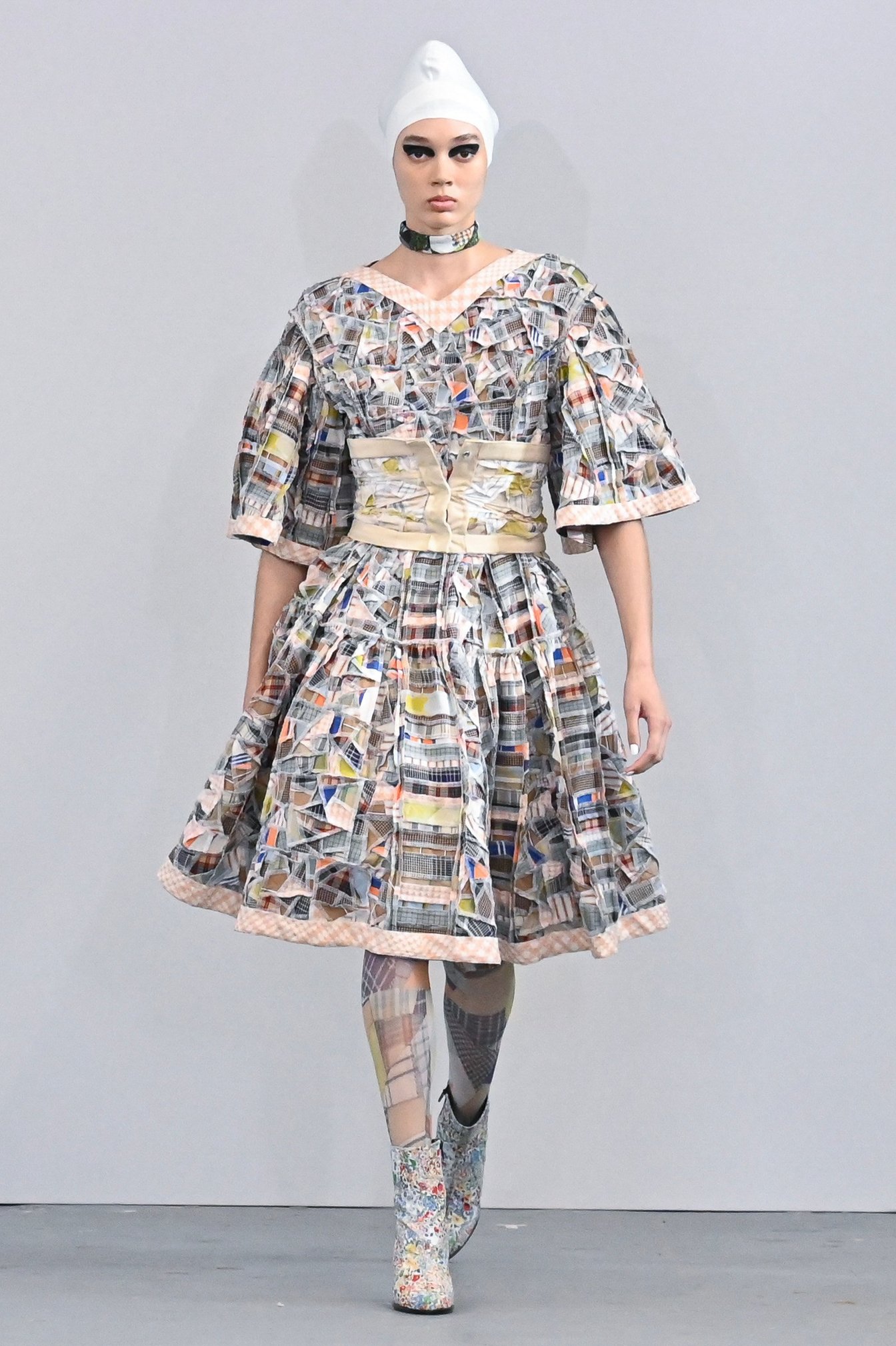 ショーの前半では、ブランドの初期から20年にわたり作り続けてきたパッチワークのみで作られた15体を披露。それらを後半で全て裏返しにしてモデルに着せることで、数千パーツを繋ぎ合わせて制作されるパッチワークの手仕事を可視化した。
