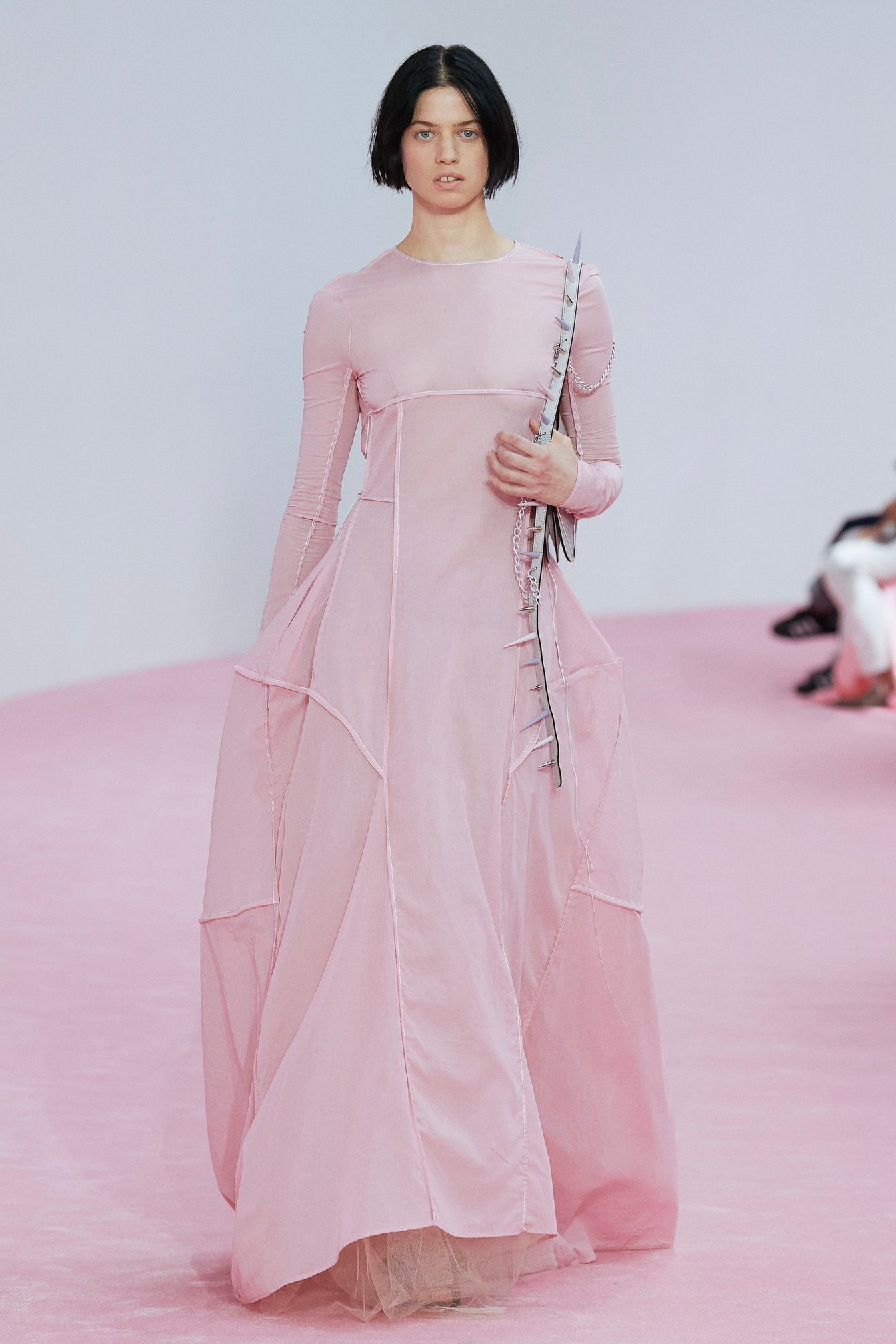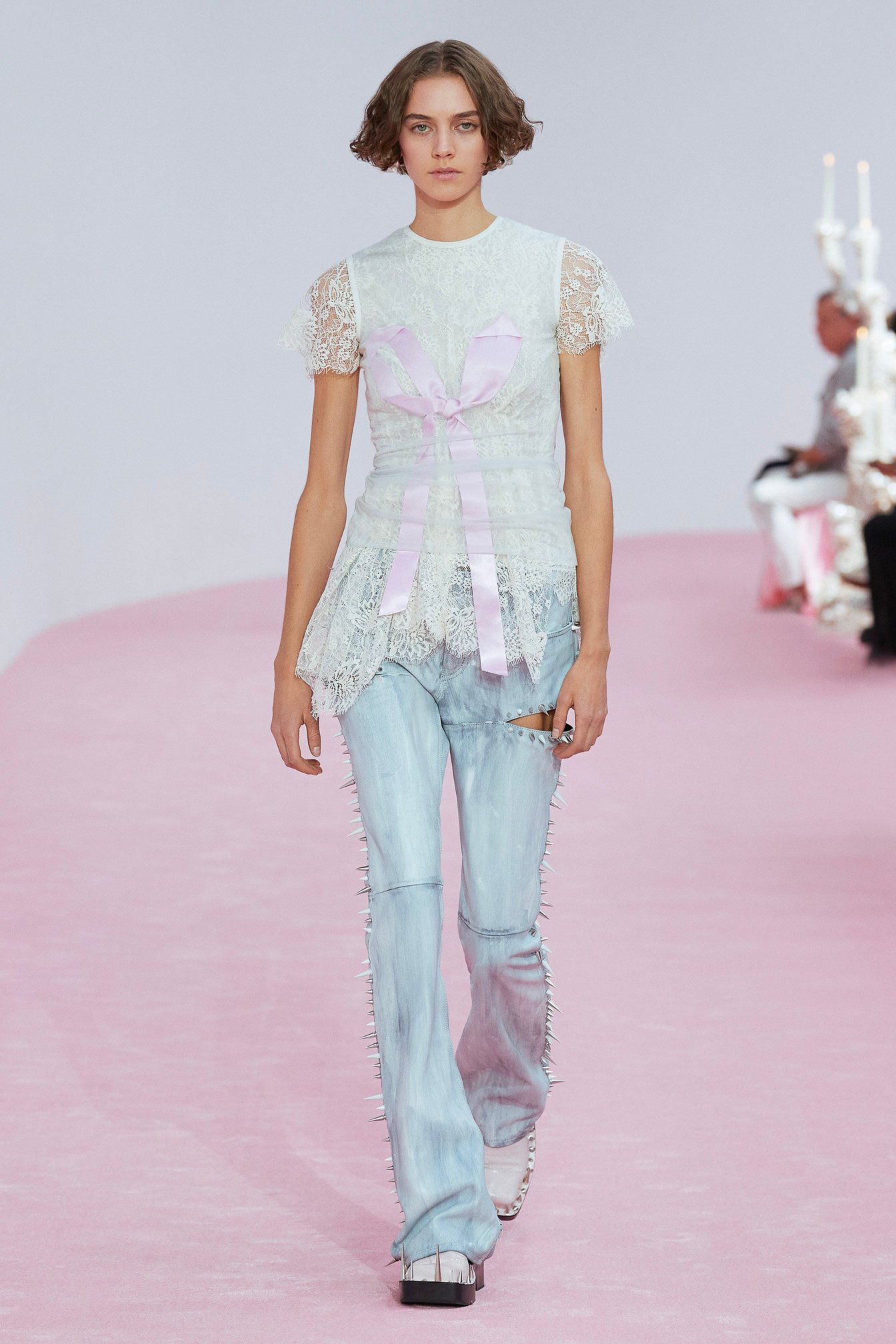 スウェーデン発の「アクネ ストゥディオズ」は、パリでの発表10周年を記念して、ショー会場でウエディングパーティーを表現。ひねりを効かせ、ピンクのサテンシーツが敷かれたベッドが客席となった。
