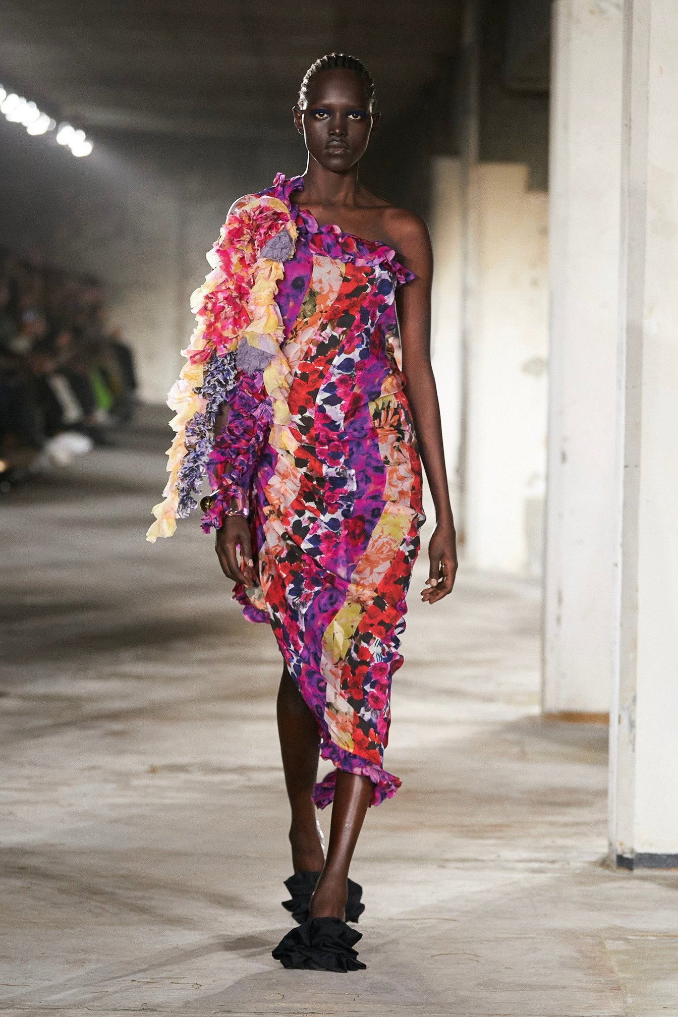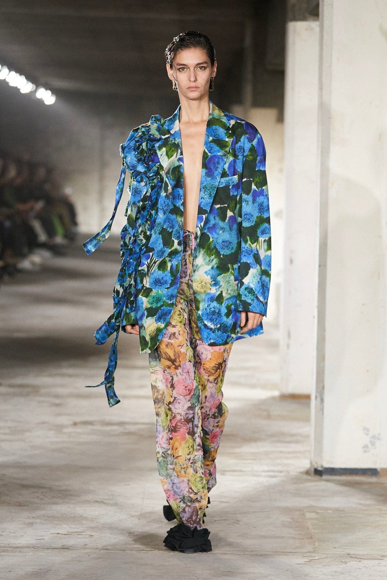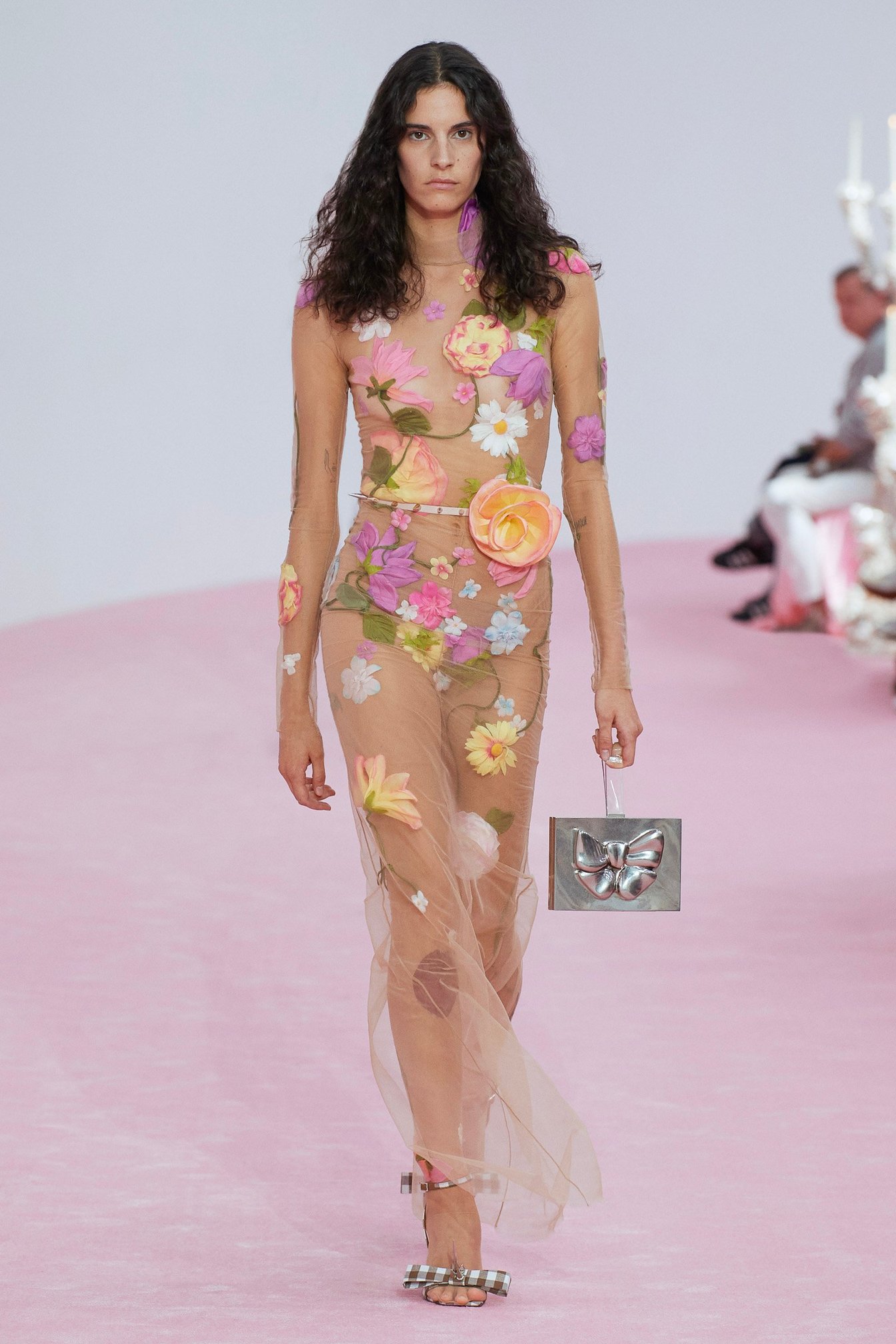 中盤は落ちついた色味のパステルカラーをミックス。フリルやプリーツ、マクラメ編み、そして手吹きガラスのアクセサリーがディテールを強調する。終盤はあらゆるフラワープリントが咲き乱れ、喜びを表現。ブランドの代名詞のひとつでもあるフラワーをアーカイヴから再考し用いたという。オプティミズムの祝祭といえる、圧巻のフィナーレとなった。