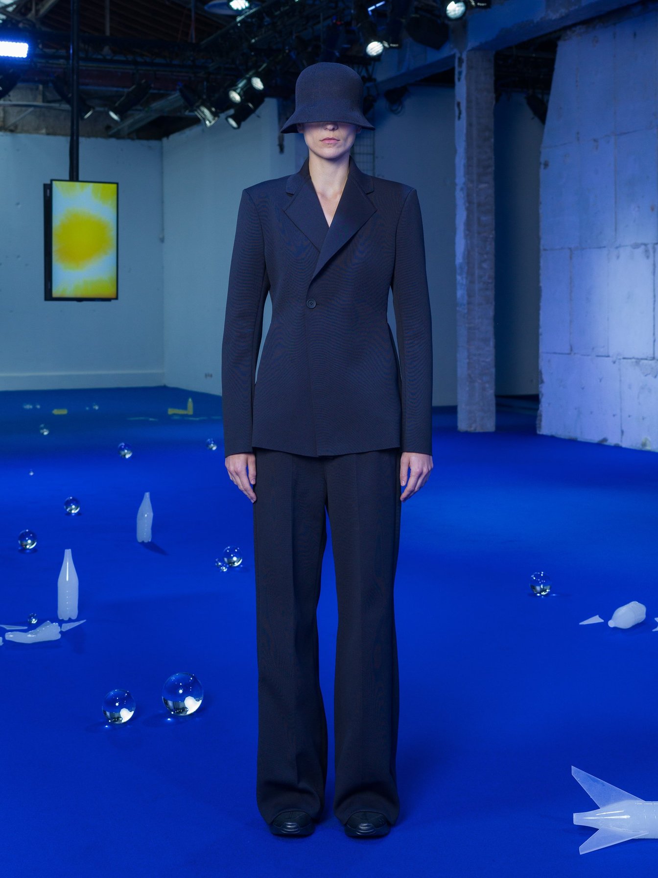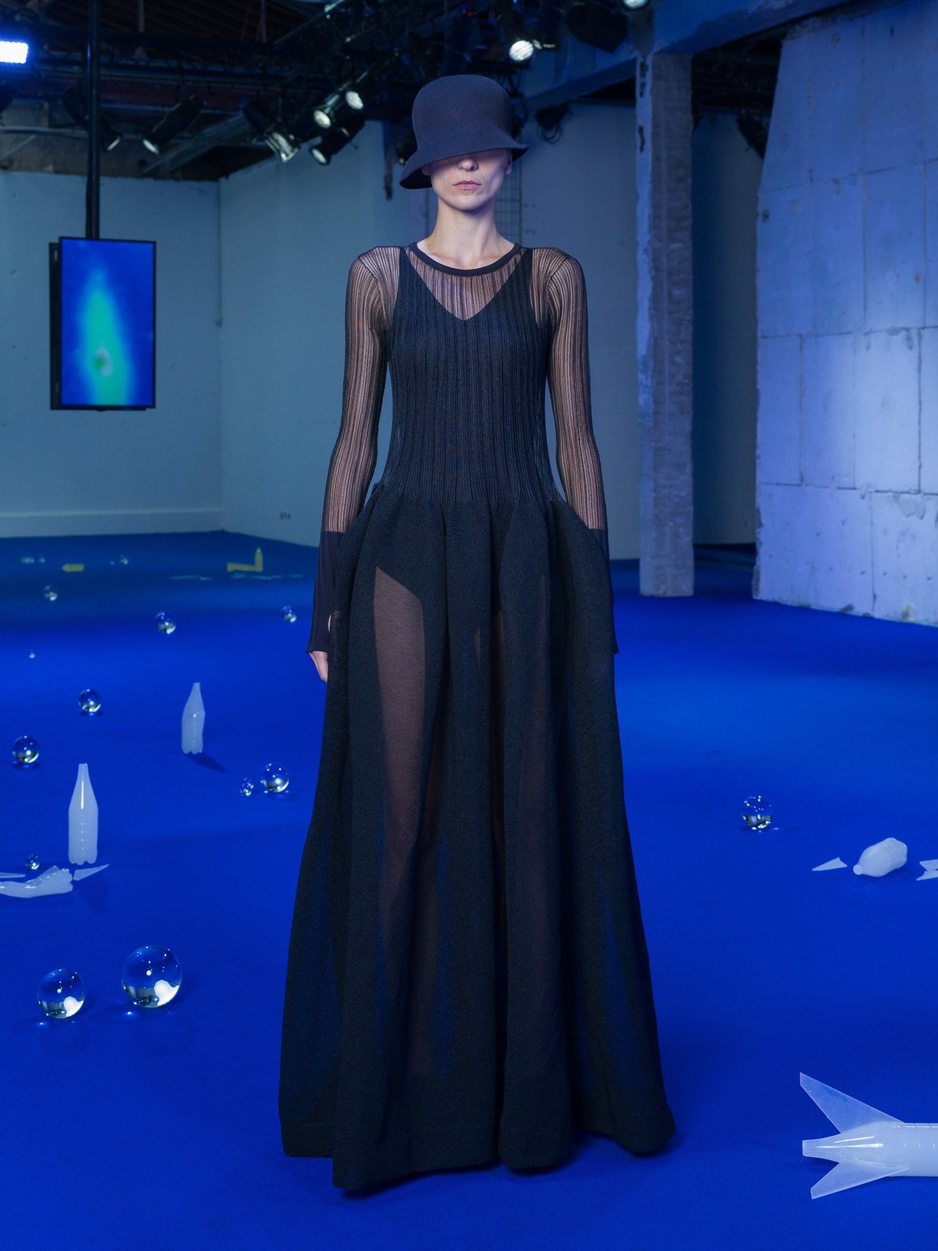 高橋悠介が手掛ける「CFCL」はパリコレ初日、フィジカルのプレゼンテーションを初開催。「Knit-ware: Blueprint」をテーマに、資源に覆われた⻘い銀河系"PLAnet"への旅をセノグラフィー(舞台美術)で表現し、再生プラスチック製のブルーのカーペットの上に、ペットボトル型のロケットなど化石に見立てたオブジェを配置した。