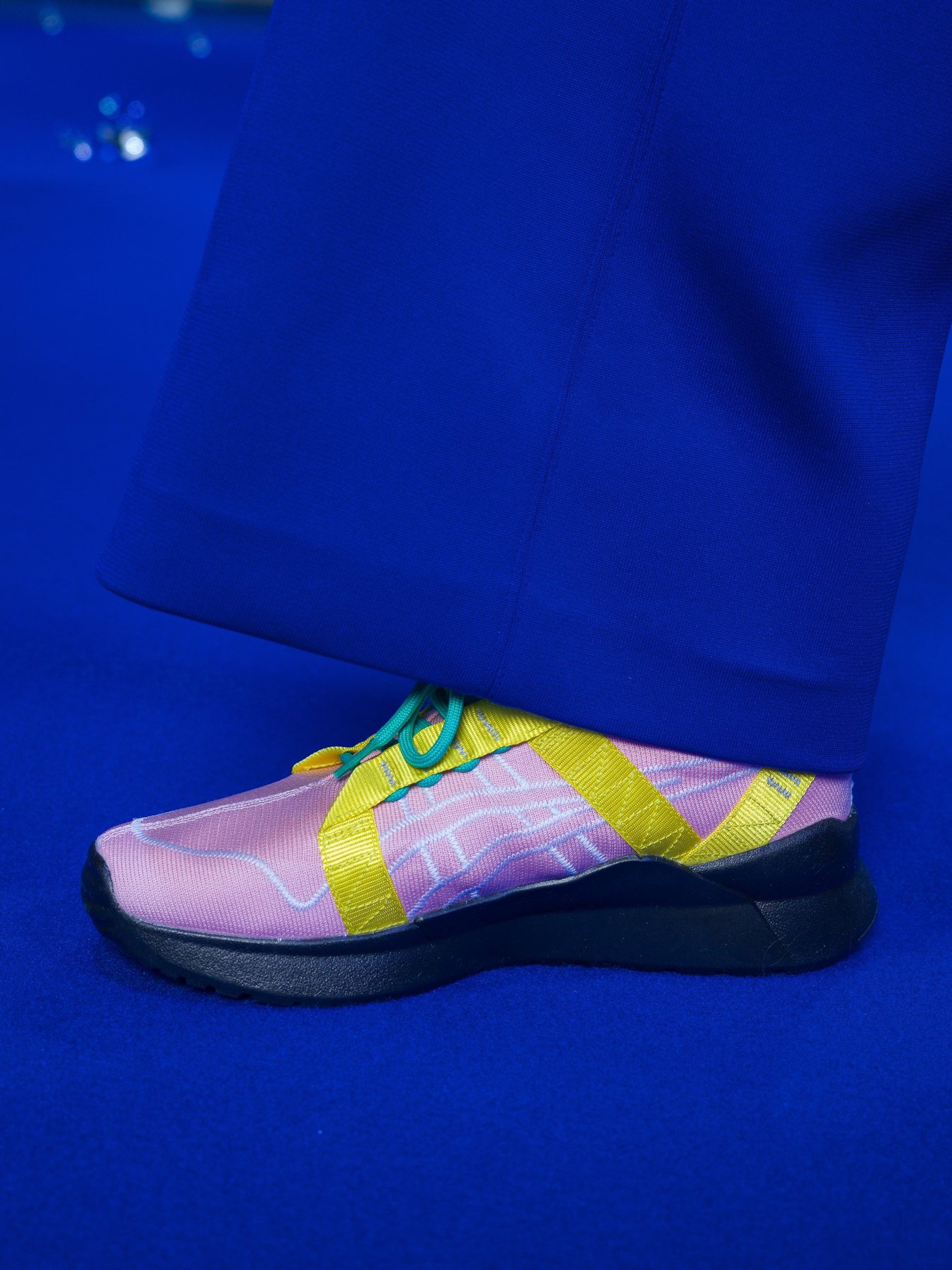 足元の注目は「アシックス(asics)」とのコラボレーションシューズ。温室効果ガス排出量が世界最小のスニーカーを初披露した。ホワイト、ピンク、ブラックの3色展開で、来夏の発売が予定されている。