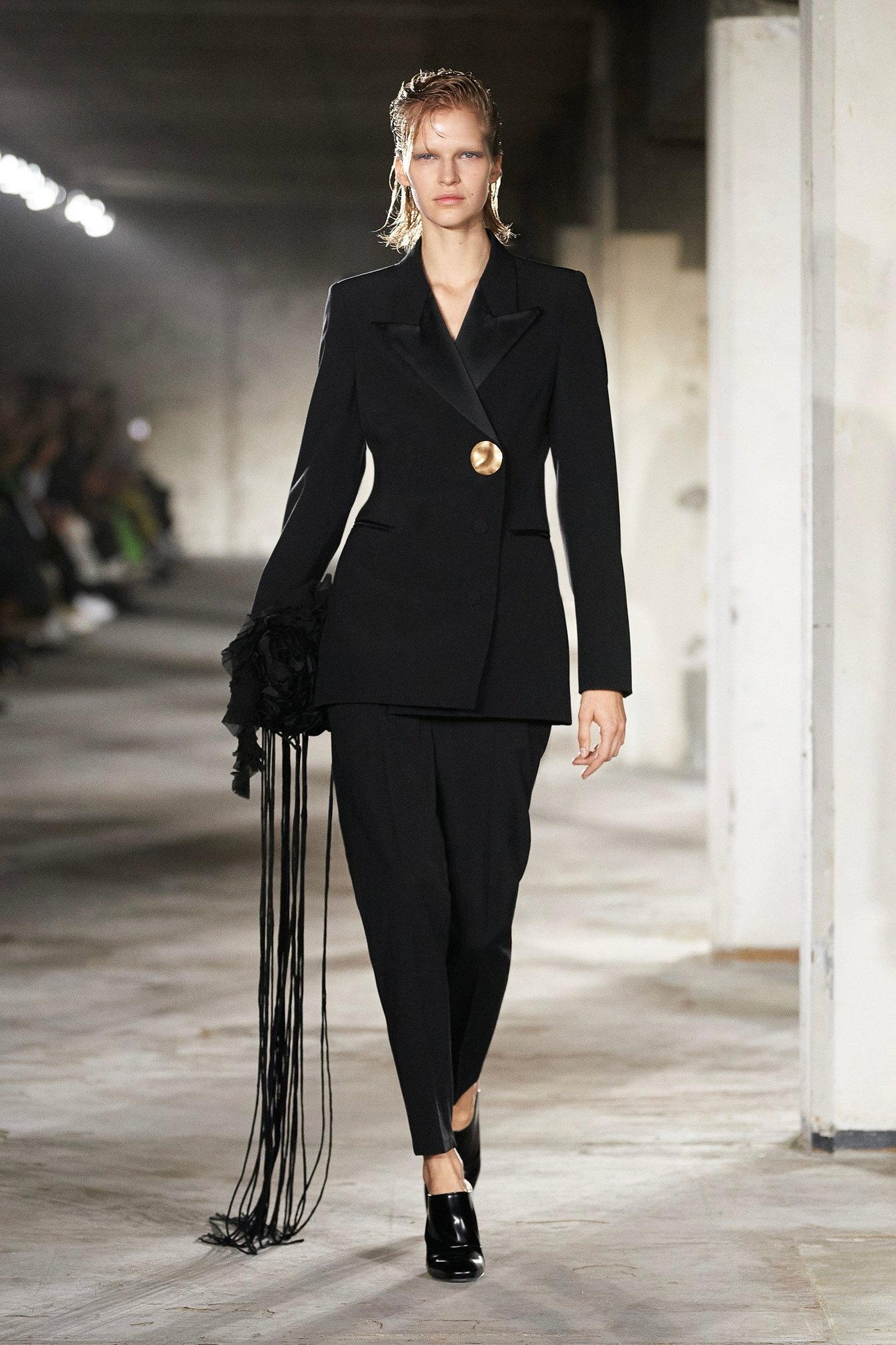 「ドリス ヴァン ノッテン」による2年半ぶりとなるウィメンズコレクションのランウェイショーは、3つの構成で闇に光が差すようなストーリーが展開された。序盤の着想源となったのは、カジミール・マレーヴィチ(Kazimir Malevich)の作品「黒の正方形」。無垢な印象のブラック一色のルックが、ジャケットやドレスの構築的なフォルムを引き立たせている。