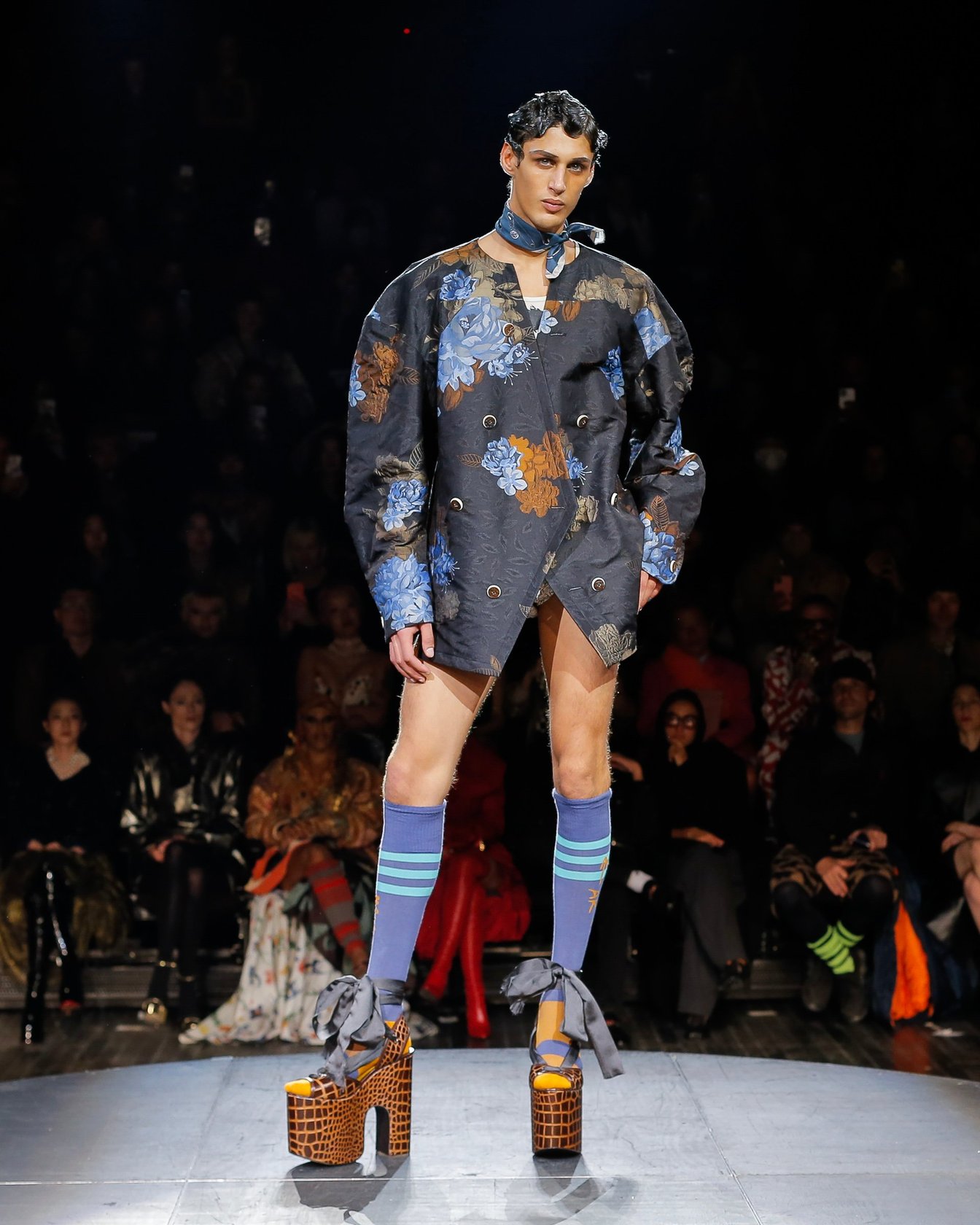 巨大なスタジアムの中央に設けられたランウェイでは、プレタポルテのウィメンズとメンズ、そしてオートクチュールの計103体が登場。籐を編んで仕立てた造形的なドレスにはじまり、ルネッサンス絵画や炎が印象的なプリント、そして木の皮や貝殻といった自然の美をまとったオートクチュールまで、壮大な演出で披露された。