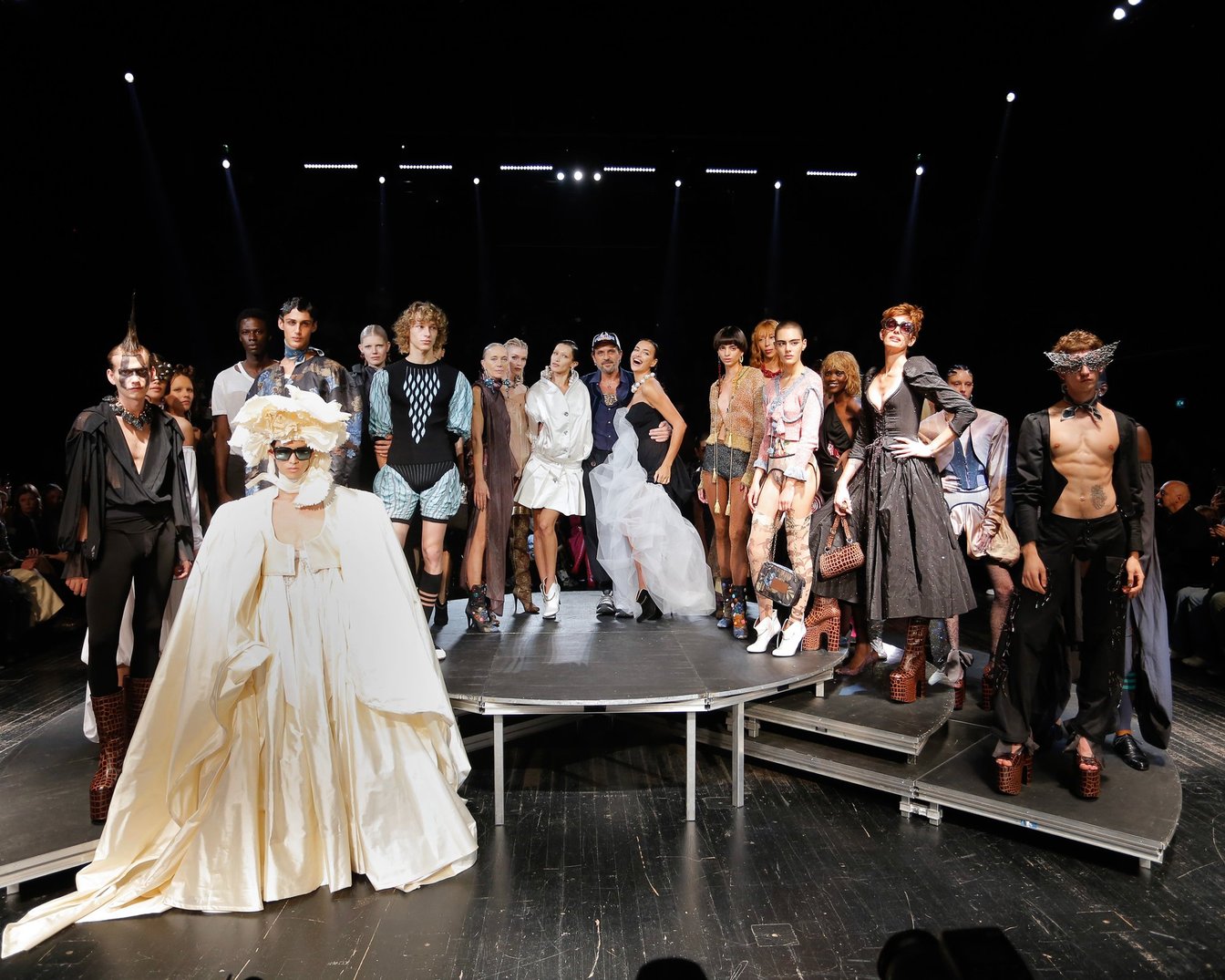 歴史的なものを使って遊ぶことで過去を見つめ、ルネッサンス風に仕上げるというヴィヴィアンならではの手法をなぞり、古いものと新しいものを融合したコレクション。着古した風合いのTシャツやスウェットをリメイクしたり、デッドストックの生地を使用して、個性の引き立つドラマティックな装いとなった。円形のステージに全モデルが集合したフィナーレは、まるで舞台劇のカーテンコールの雰囲気。