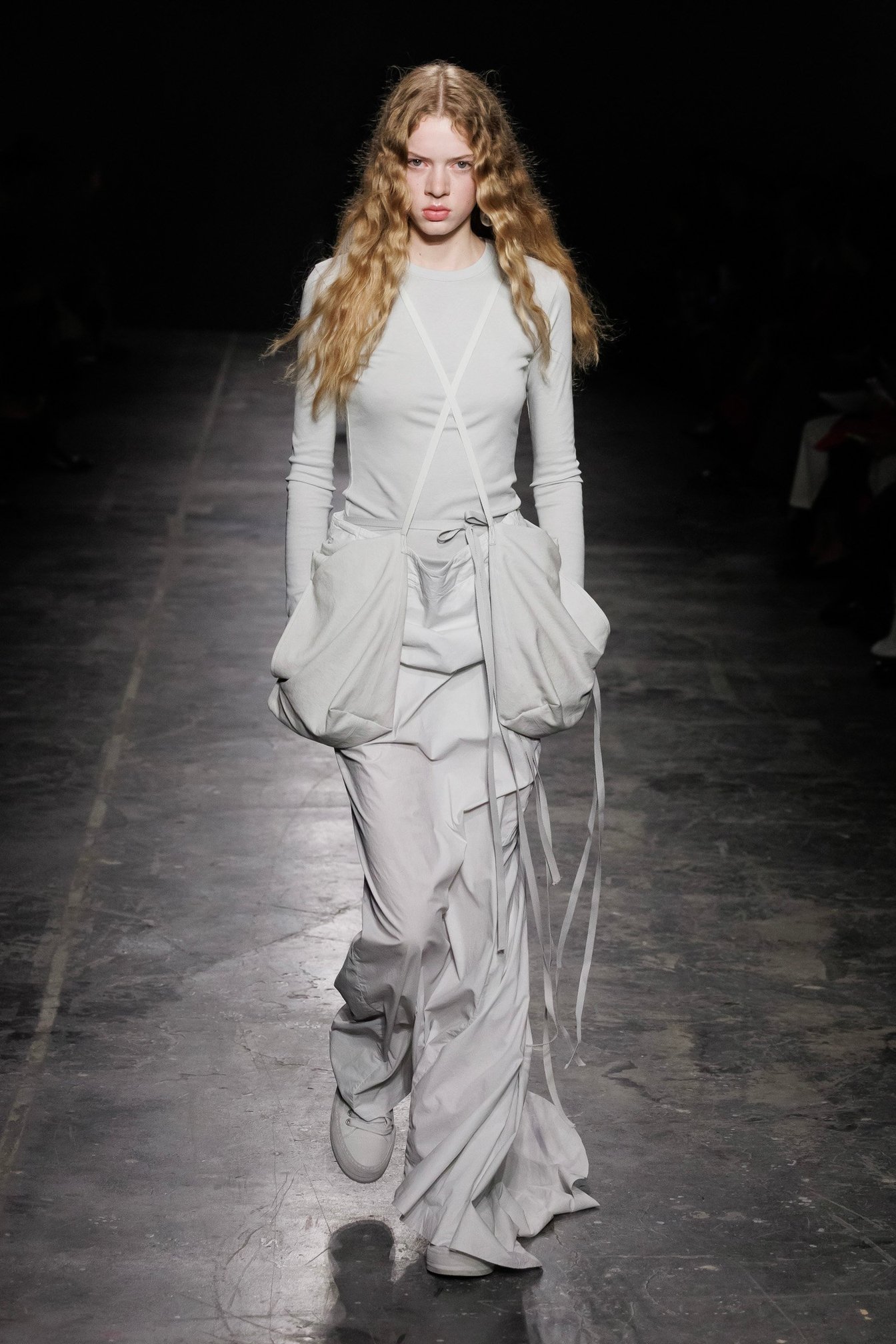そして光と闇のテーマをモノトーンで表現した「アン ドゥムルメステール(ANN DEMEULEMEESTER)」は、2つのバックを左右にクロスさせてポケットのように着用。ワントーンで揃え、一体化したかのようなルックに仕上がった。