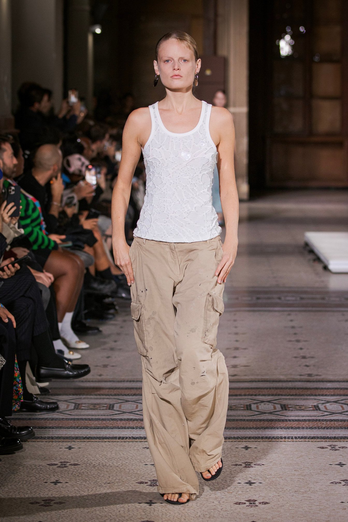 一方で「コぺルニ(COPERNI)」のカーゴパンツは、絶妙なユーズド感がタフな女性像を演出。ガラスの破片をつないだタンクトップと共に、一見オーソドックスでありながら手の込んだディテールが光る。