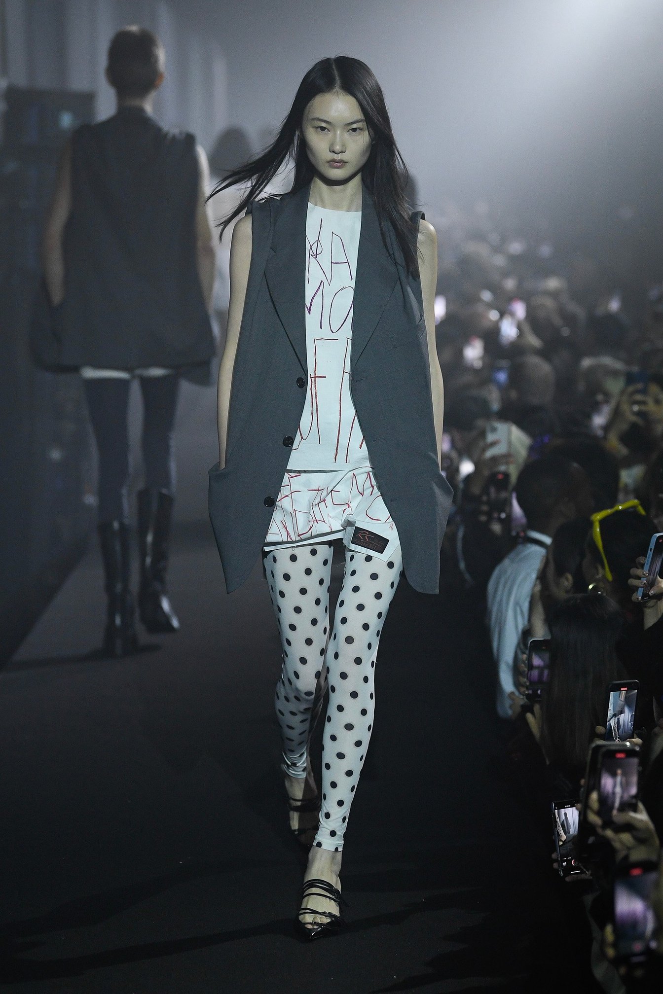 また、昨年11月にブランド終了を発表した「ラフ・シモンズ(RAF SIMONS)」は、ブランド定番のスリーブレスのジャケットやロングジレをラストコレクションでも提案。フィリップ・ヴァンデンベルク(Philippe Vandenberg)の作品を取り入れたインナーに合わせ、ドット柄のタイツで縦長シルエットを強調した。両手はもちろんポケットの中にイン。