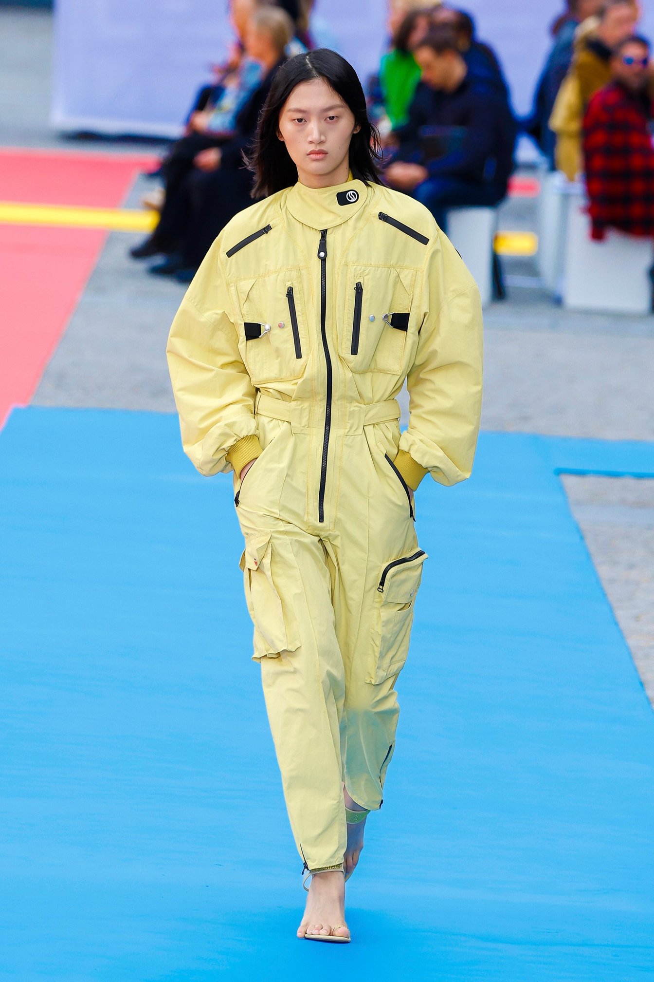 また、「ステラ マッカートニー(STELLA McCARTNEY)」からは、レモンイエローのジャンプスーツが登場。多用されたジッパーポケットやフラップポケットが効果的なアクセントとなり、ヘルシーかつポジティブなY2Kムードを加速させる。