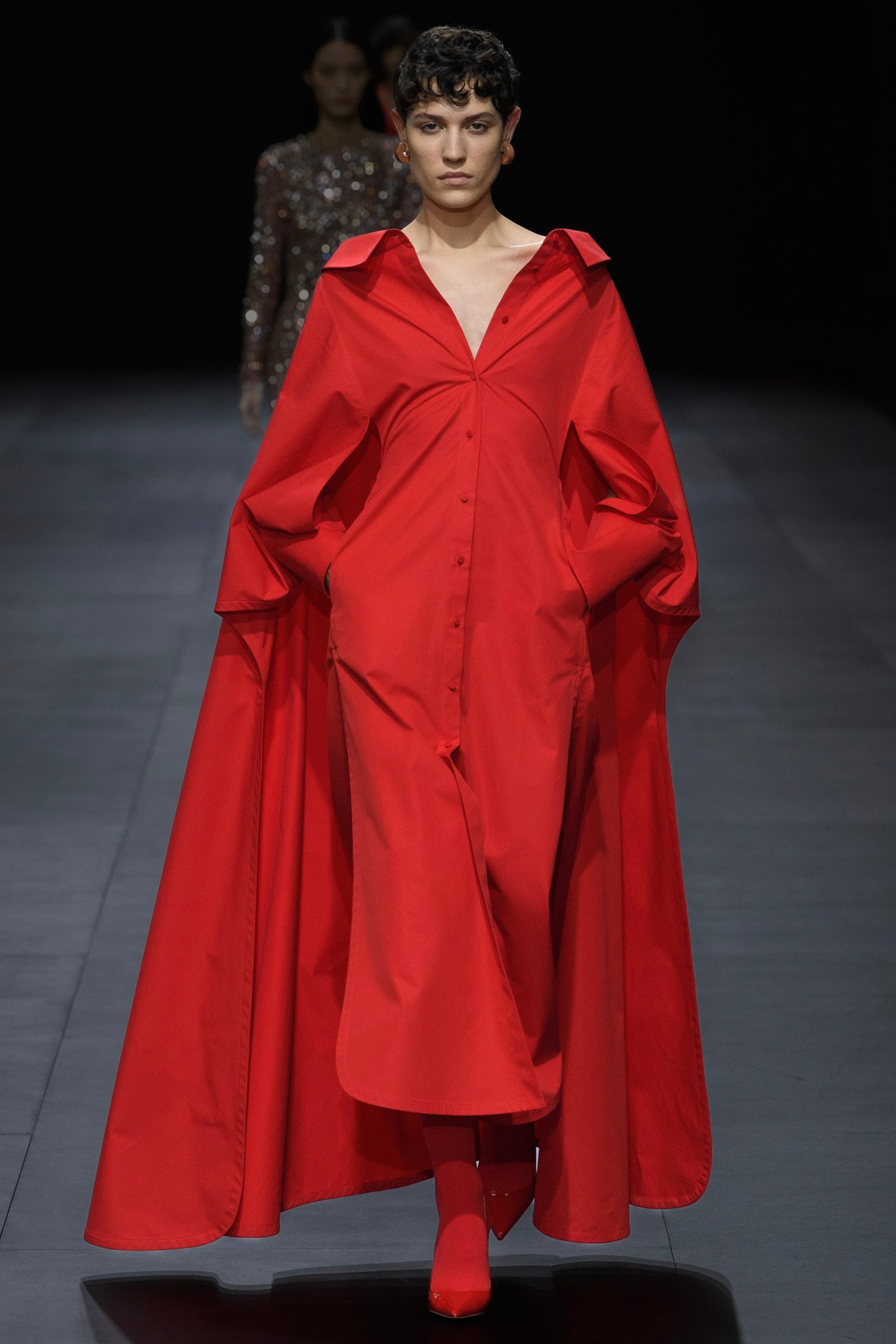 さらに、ドレスもカジュアルなアティテュードで着こなすのが今季流。「ヴァレンティノ(VALENTINO)」は「UNBOXING(箱を開ける)」をテーマに、様々な決まりや既存の概念からの解放を表現した。襟を抜いたシャツドレスは、ストッキングやパンプスまでも赤一色のスタイリング。両手をポケットに突っ込んだモデルの凛々しさが際立つ。また、「ヨウジヤマモト(Yohji Yamamoto)」は、片側のみ長袖となったコートドレスを発表。黒×白のストライプに黒い生地を重ねたデザインで、片手をポケットに入れたスタイルに反骨精神を滲ませる。