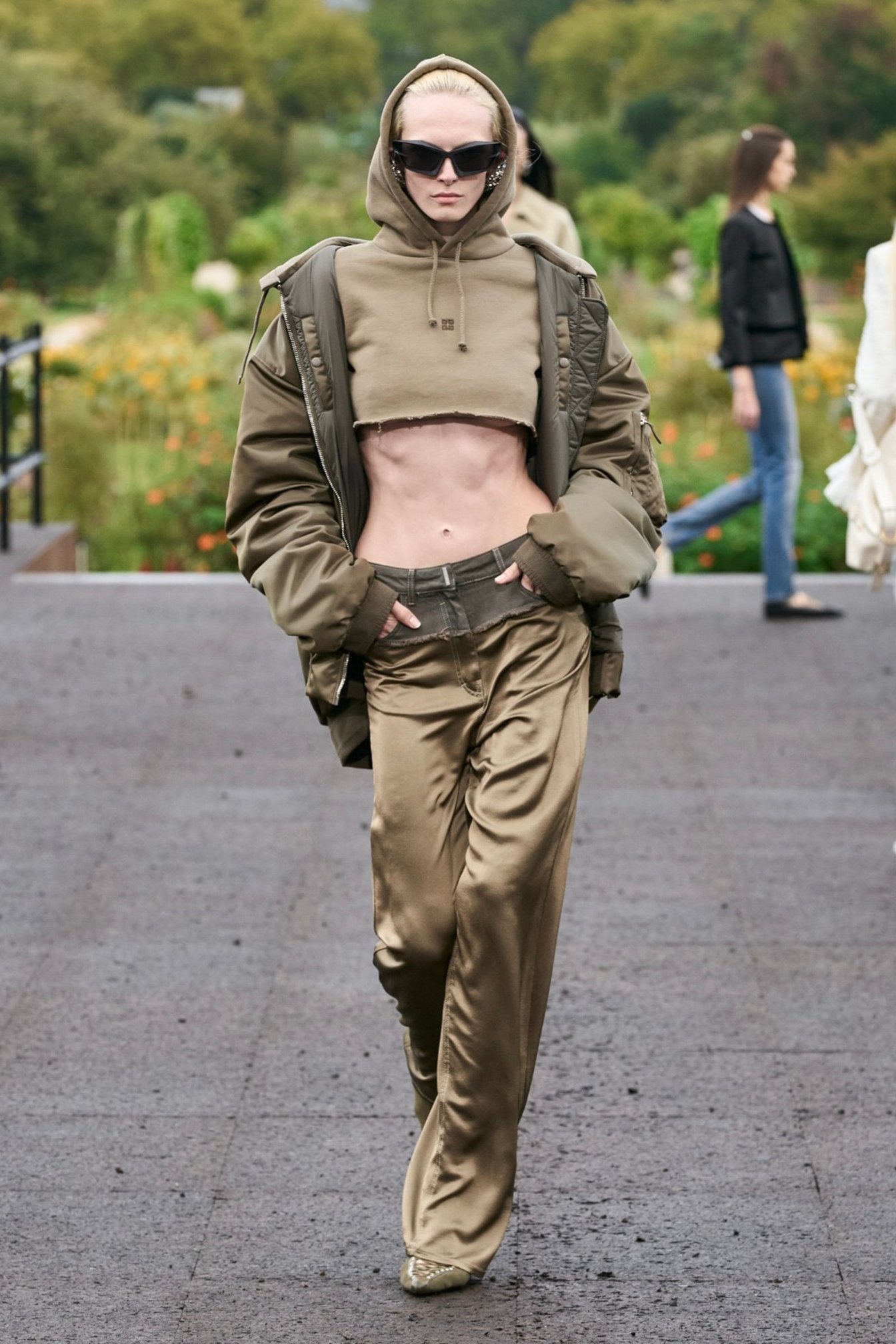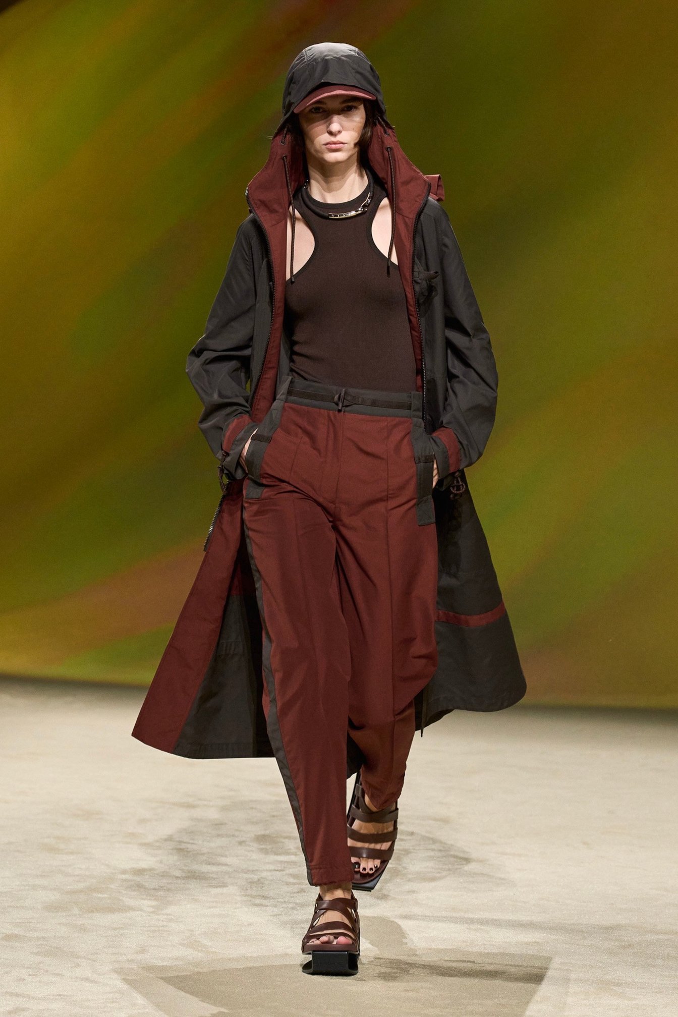 スポーティなルックも今シーズンの特徴だ。「エルメス(HERMÈS)」はテントの機能性やシルエットを取り入れ、「砂漠でのレイヴ」を表現したコレクションを発表。留め具やロープなど、随所にアウトドアの要素を感じさせる。軽量なテクニカル素材のレインコートと合わせたテラコッタカラーのパンツは、黒のテープでポケットを縁取った。