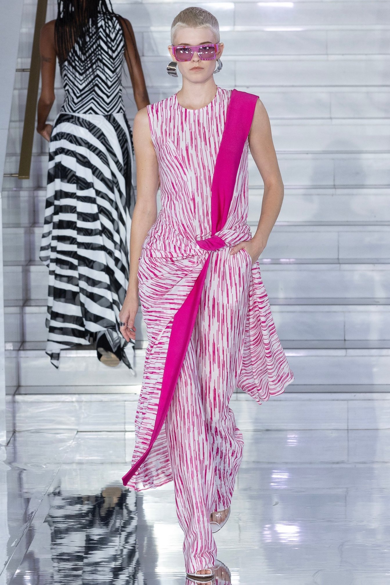 フィリッポ・グラツィオーリ(Filippo Grazioli)が手掛ける新生「ミッソーニ(MISSONI)」は、ノットをポイントにしたボディコンシャスなドレスを発表。ドレスと同柄のパンツを着用し、片側の裾をめくってポケットに手を入れるセクシーかつ都会的な女性像を描いた。