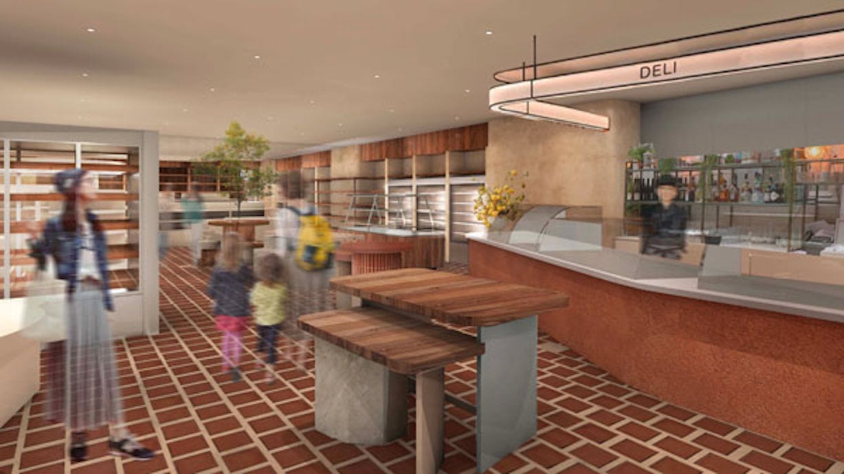 インテリアデザインは「Common(東京・六本木)」や「Soil Setoda(広島・尾道)」を手がけたデザインユニット「STUDIO DIG.」が担当。店内の床材や照明、壁面素材、ディスプレイ、什器に、土や木、石、和紙などの自然素材を用いることで、素材にこだわる「信濃屋」の姿勢を表現している。また物販、デリ、レストランといった機能が異なる空間を流動的に繋ぐことで、より快適な店内体験を演出することを意図した。