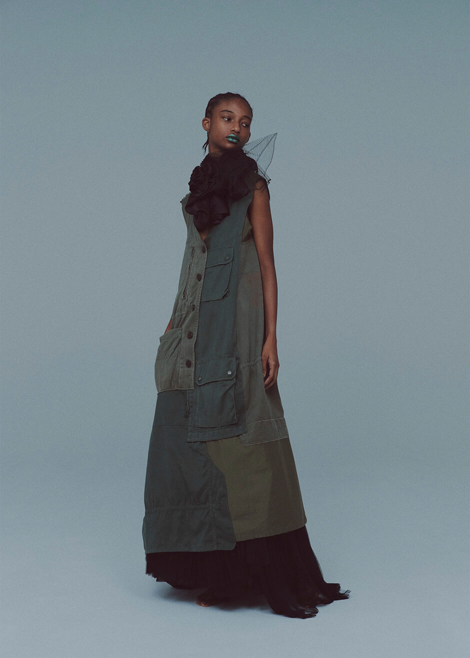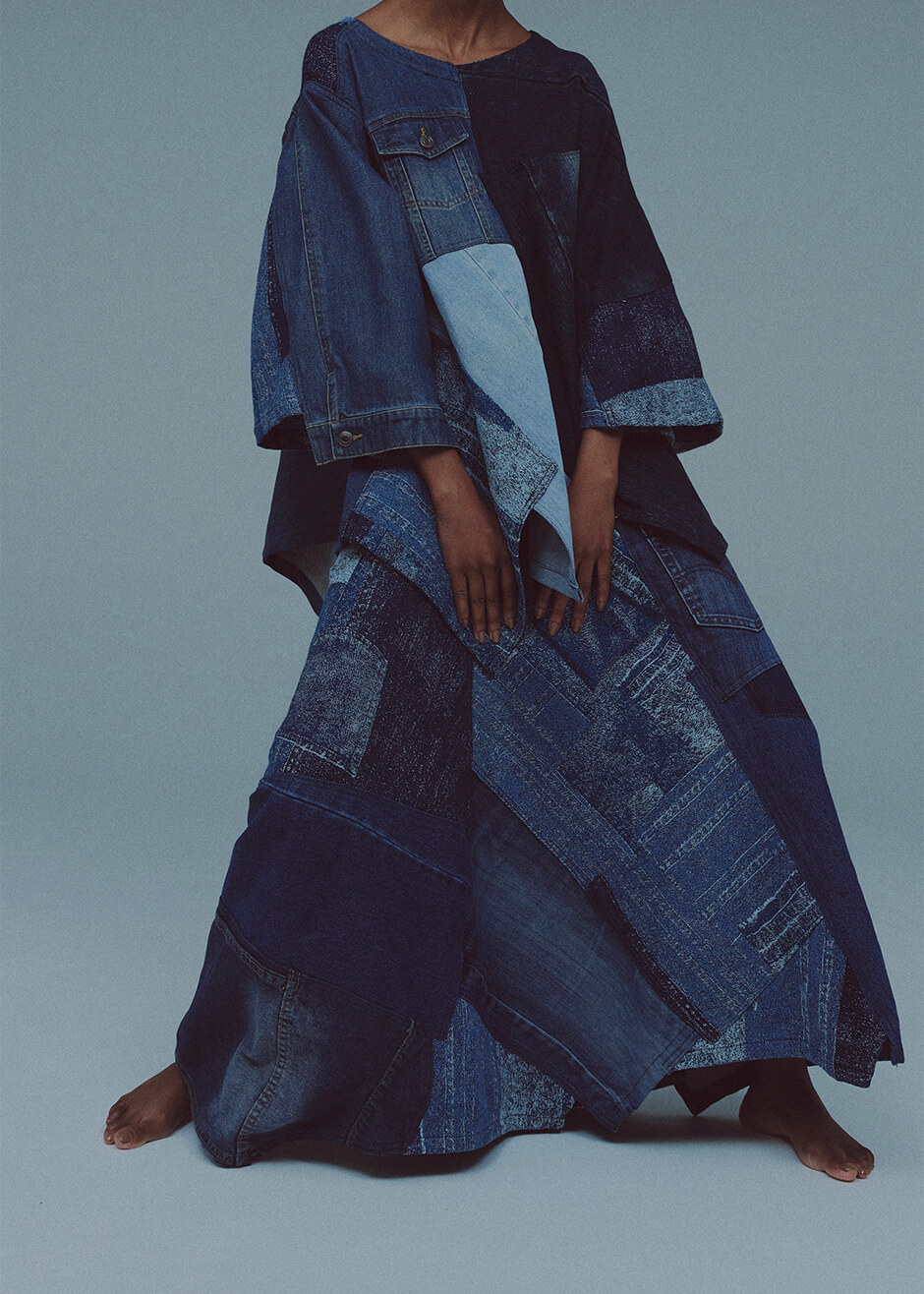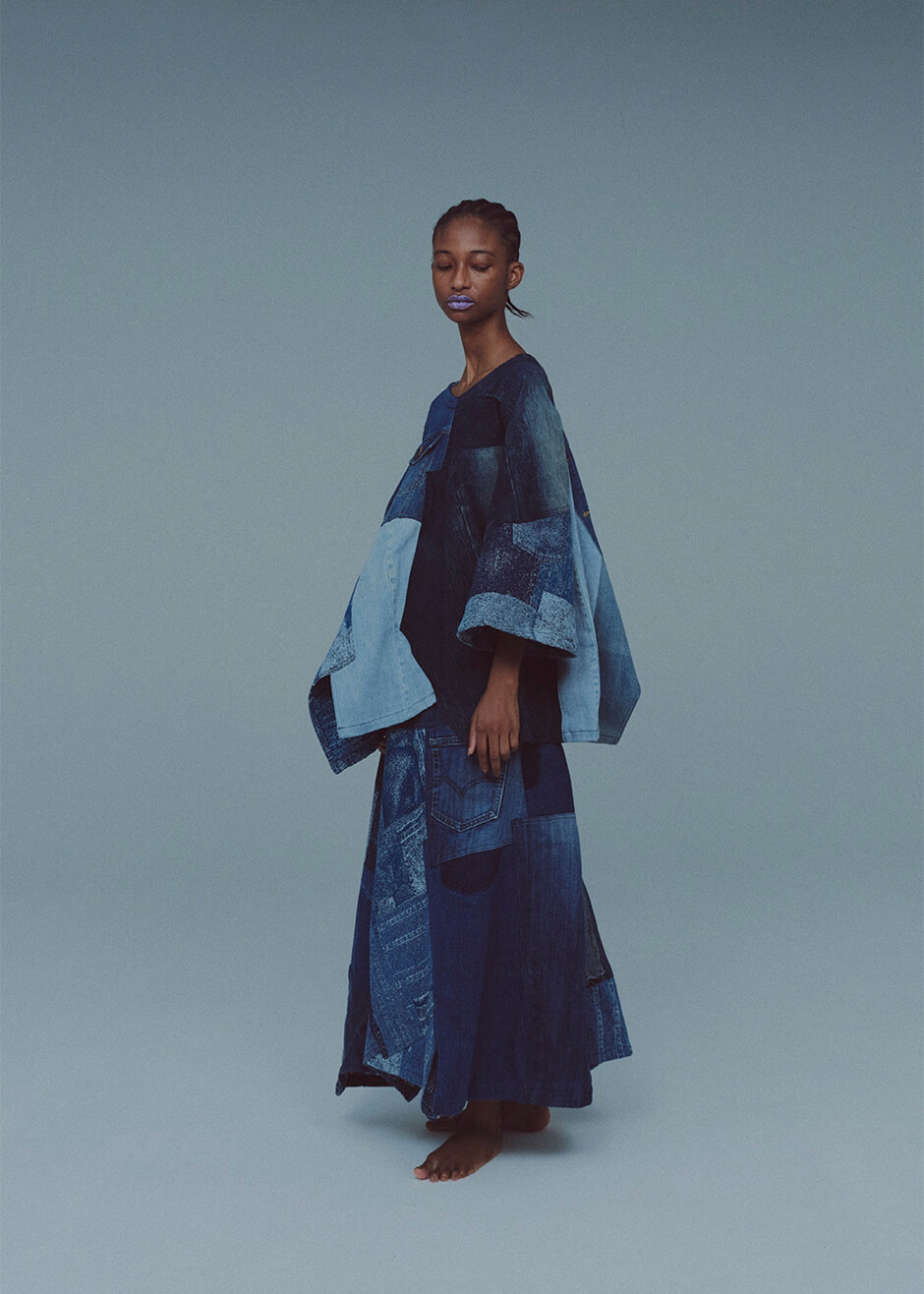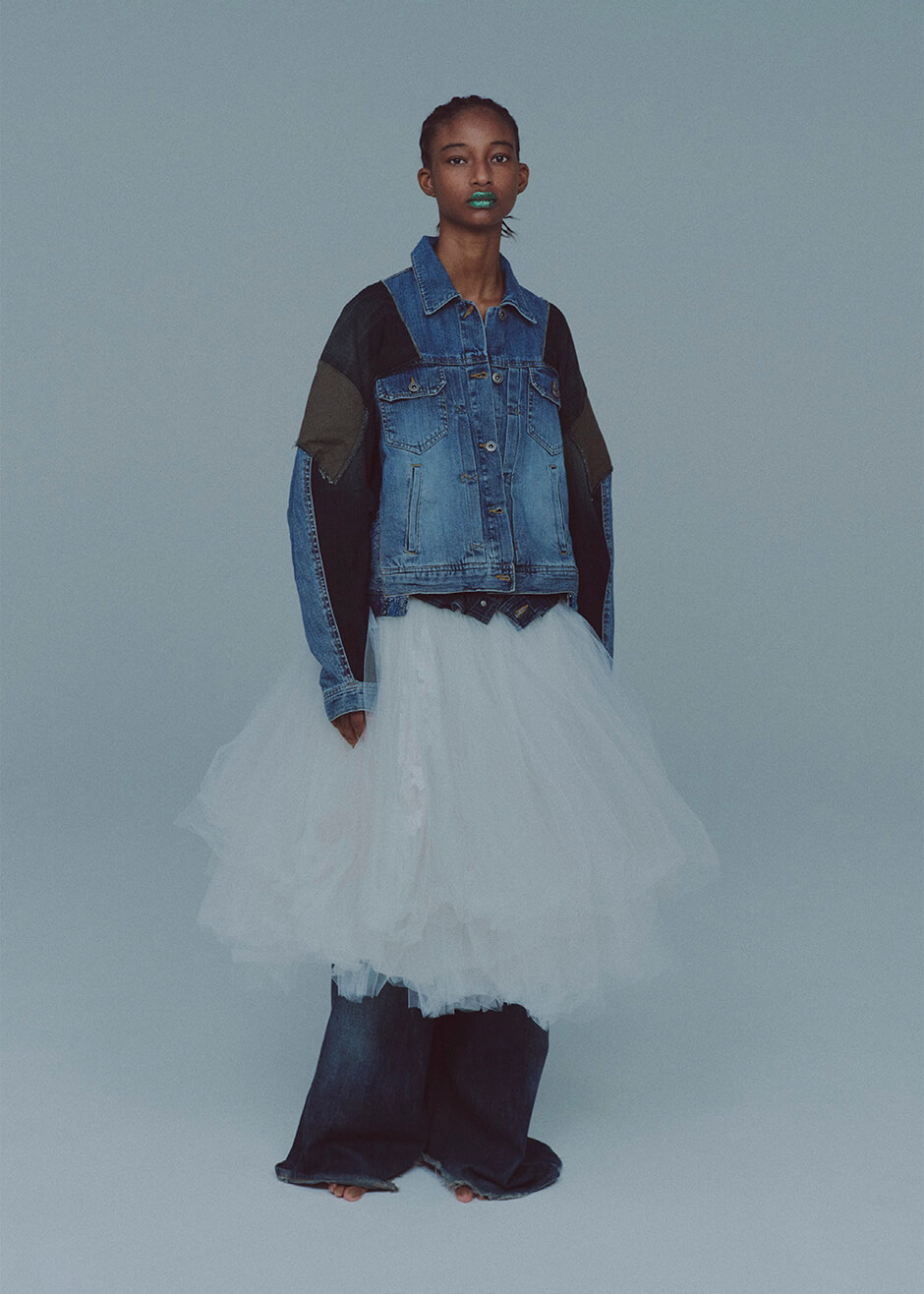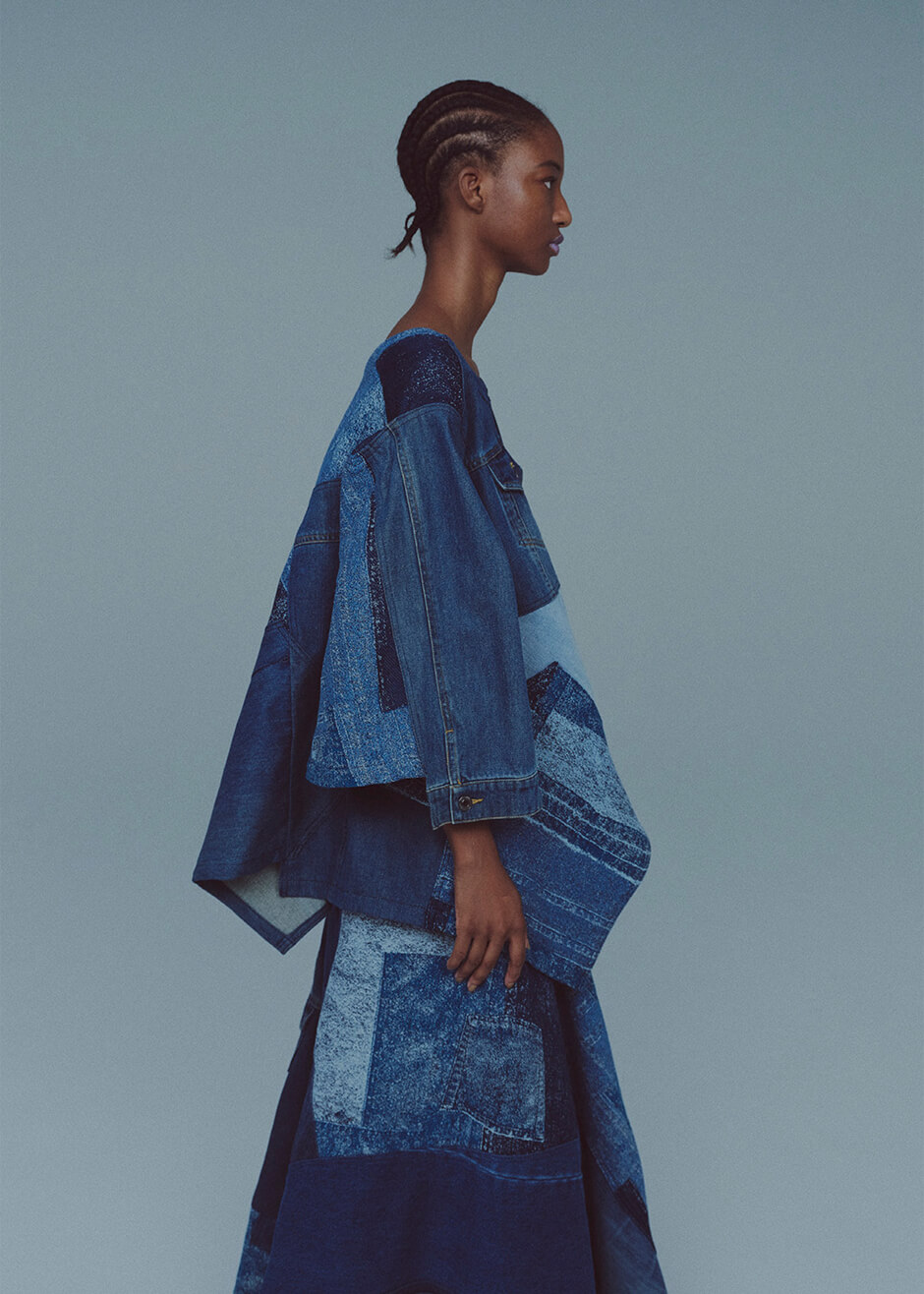 さまざまな種類のデニムやミリタリーウェアを大胆なパッチワークで繋ぐ脱構築的なアプローチと、巧みな技術で全体を包む美しいパターンの曲線は、プロダクトにしなやかな佇まいをもたらす。