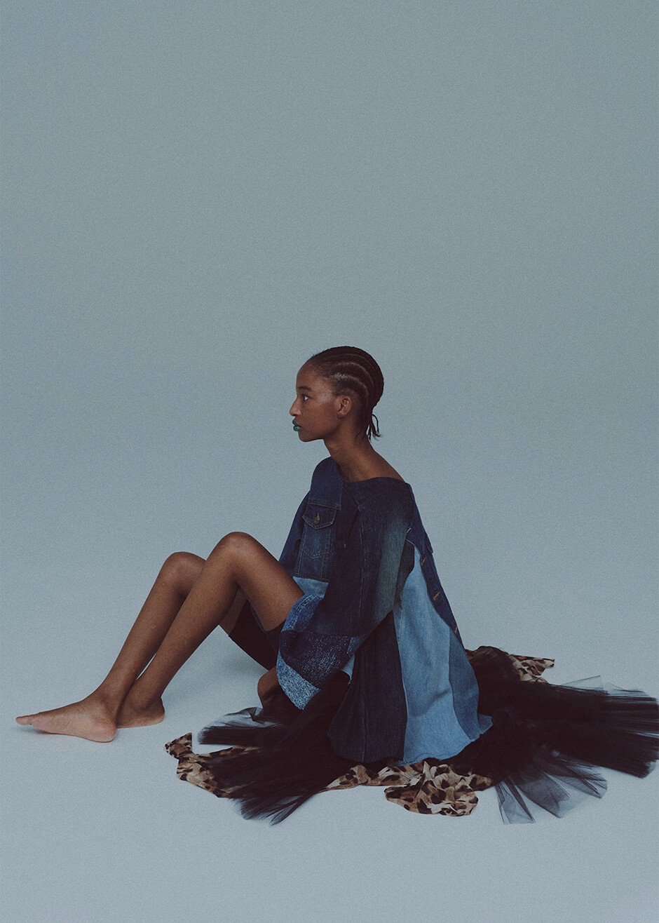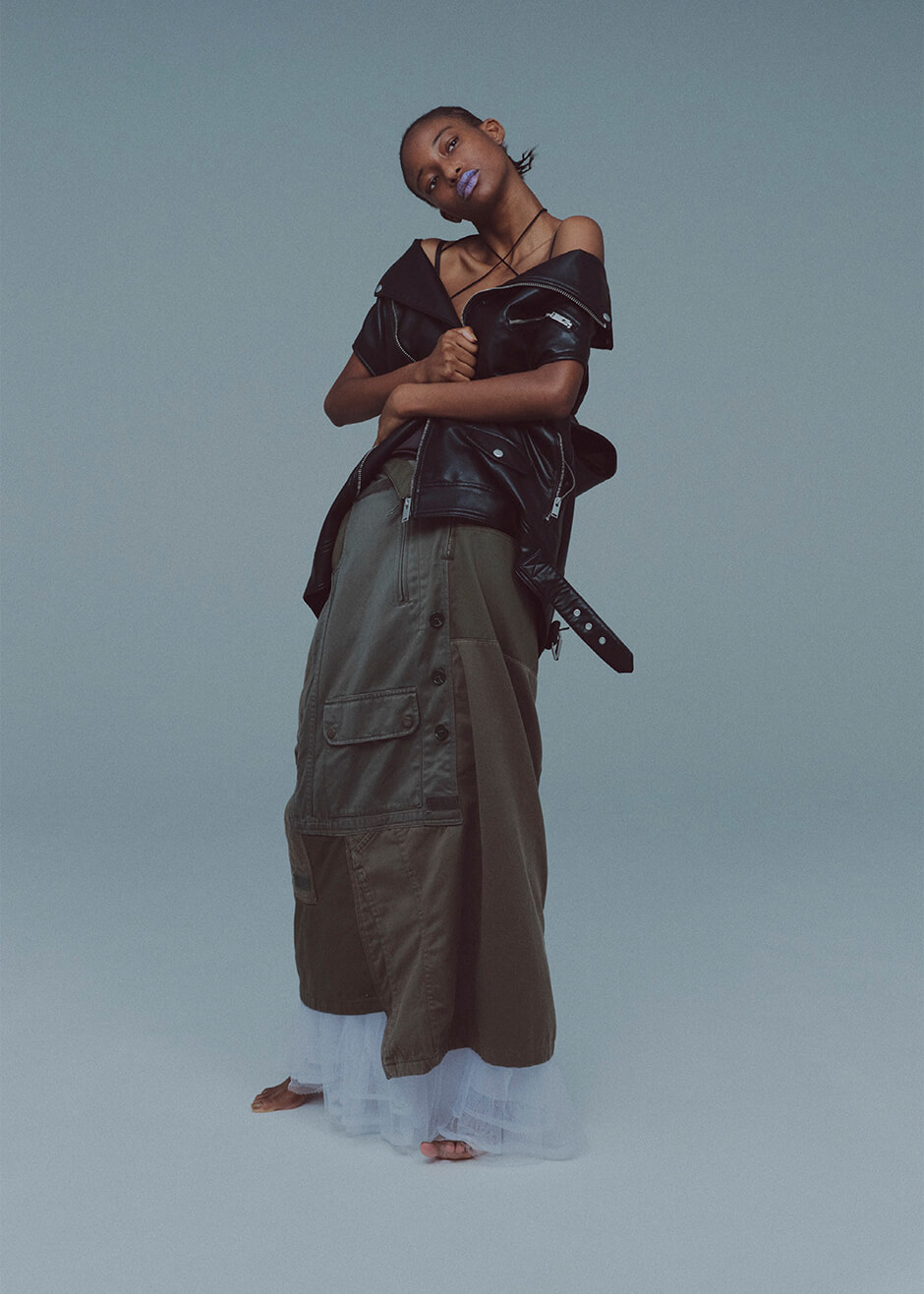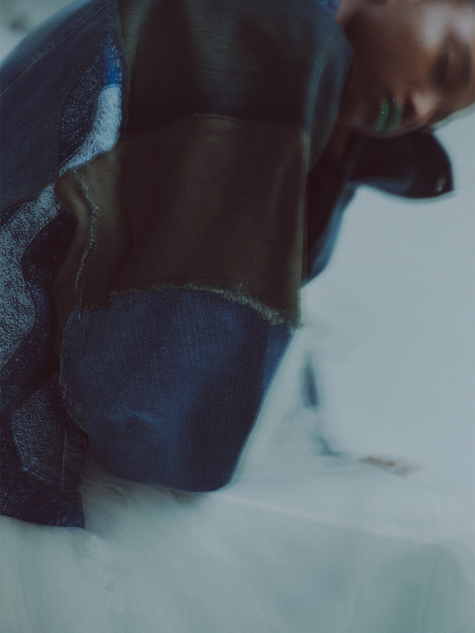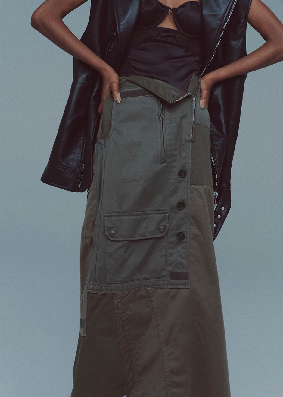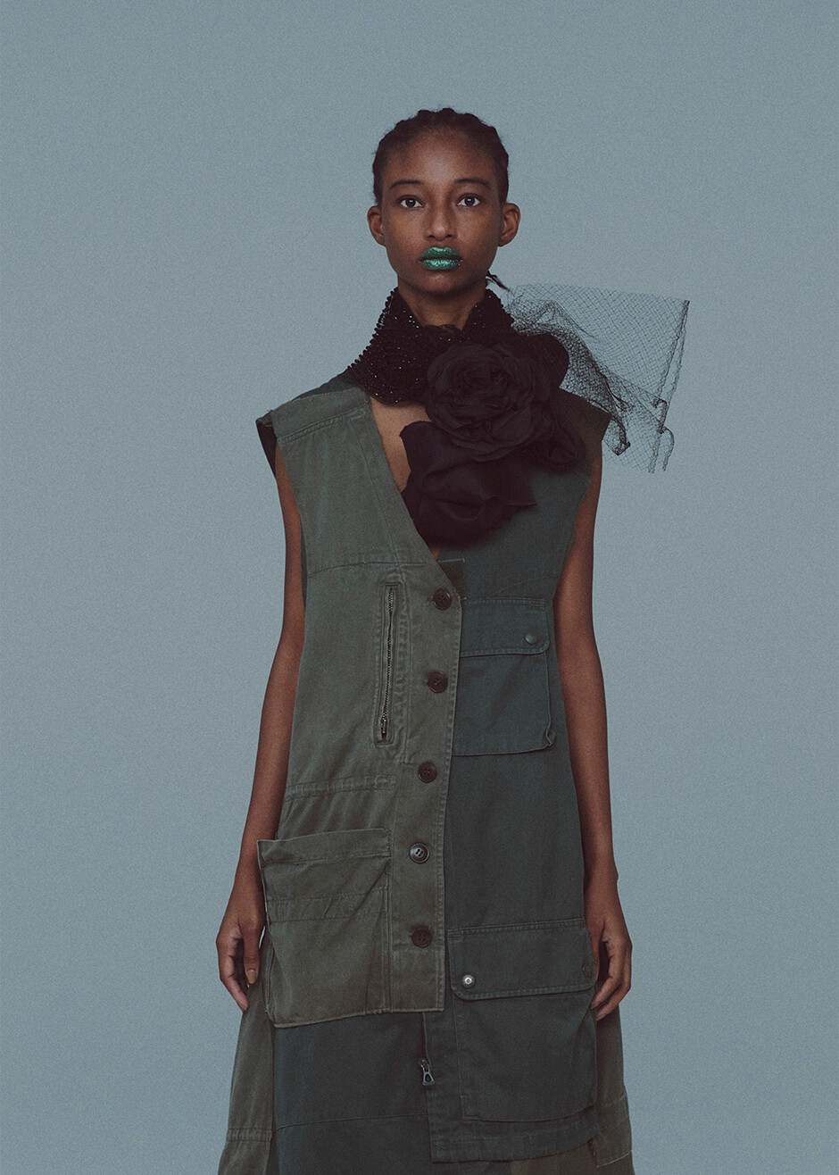 さまざまな種類のデニムやミリタリーウェアを大胆なパッチワークで繋ぐ脱構築的なアプローチと、巧みな技術で全体を包む美しいパターンの曲線は、プロダクトにしなやかな佇まいをもたらす。