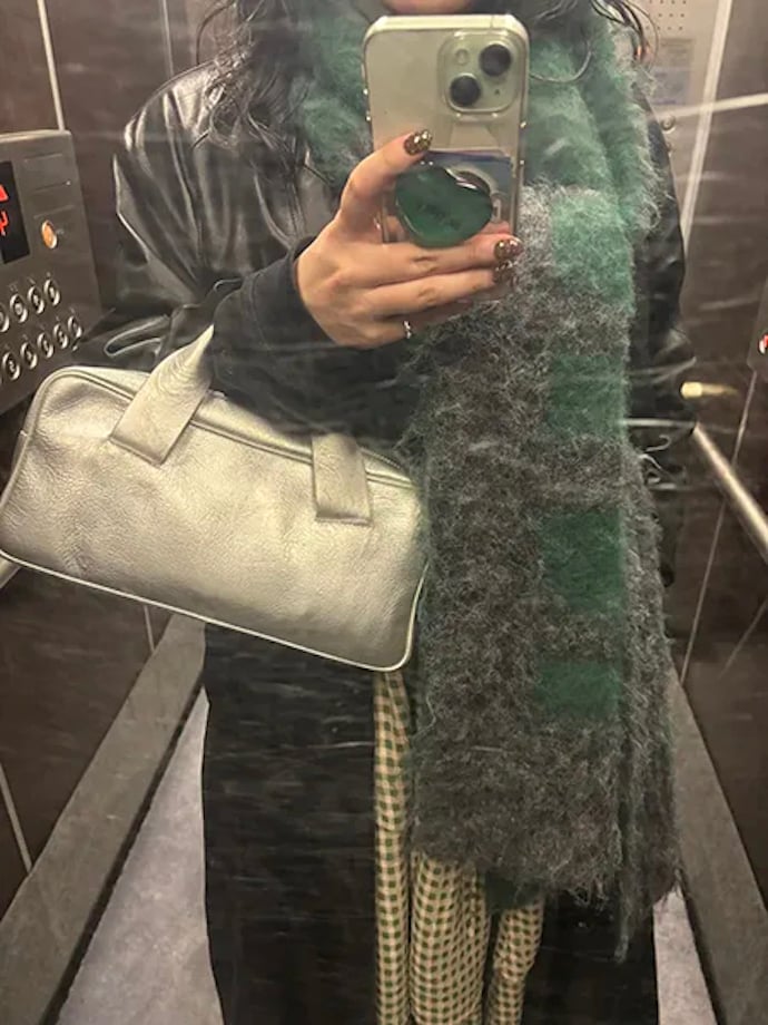tomoyo:「NKNIT(ンニット)」のマフラーです。受注したものが先日届き、そこから毎日着けています。あたたかくてボリュームがあり、コーデのポイントにもなるので、本当に重宝しています!