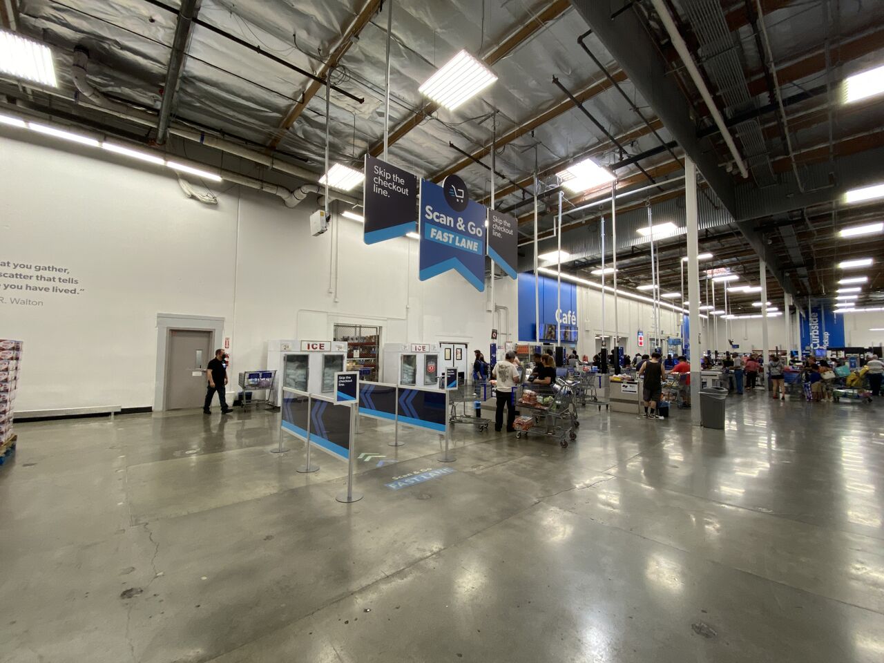 ゲートには「次回のお買い物ではレジを素通りできるスキャン&ゴーを試してください」との文字もあり、サムズクラブではスキャン&ゴーでの利用を増やしたい意向だ。