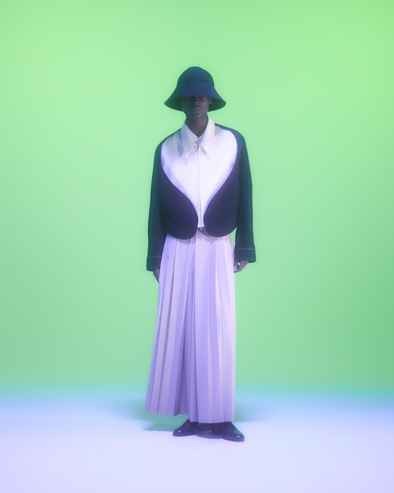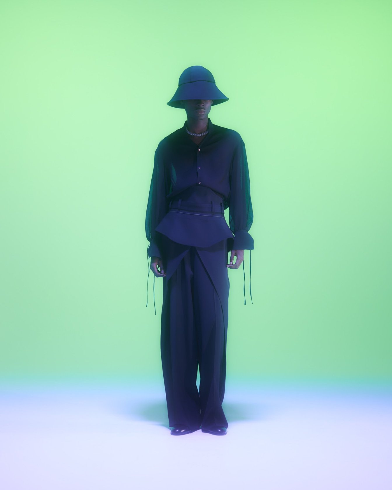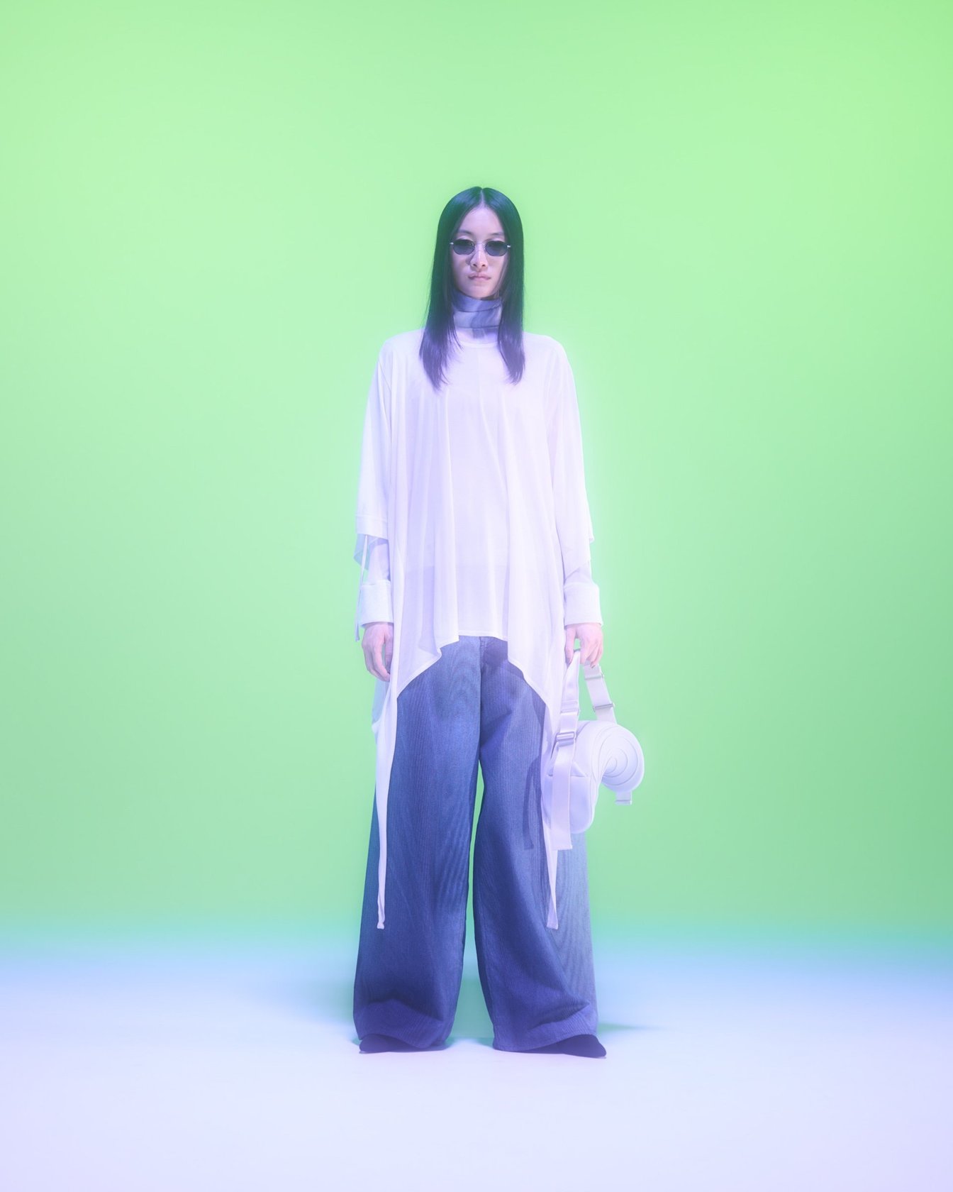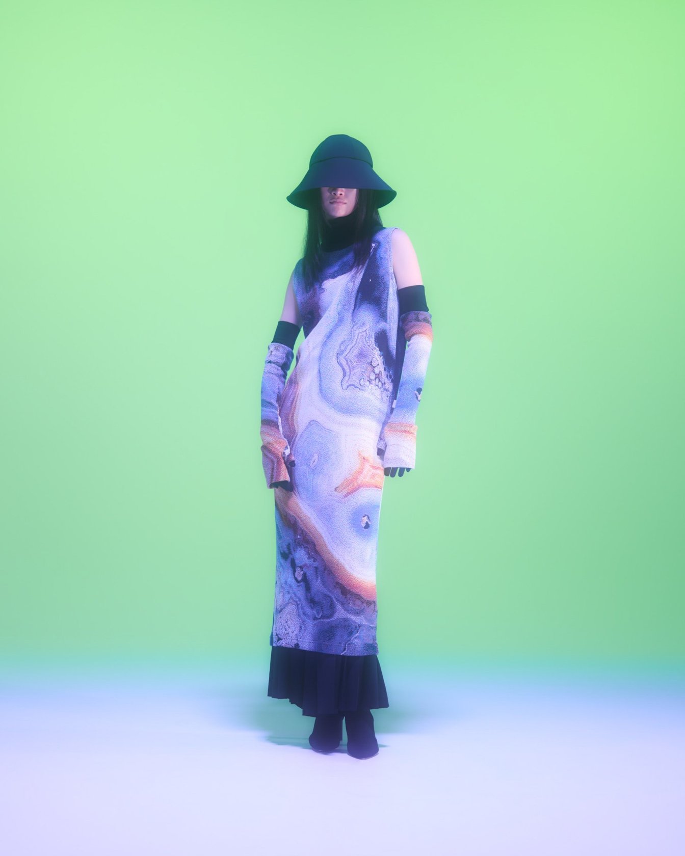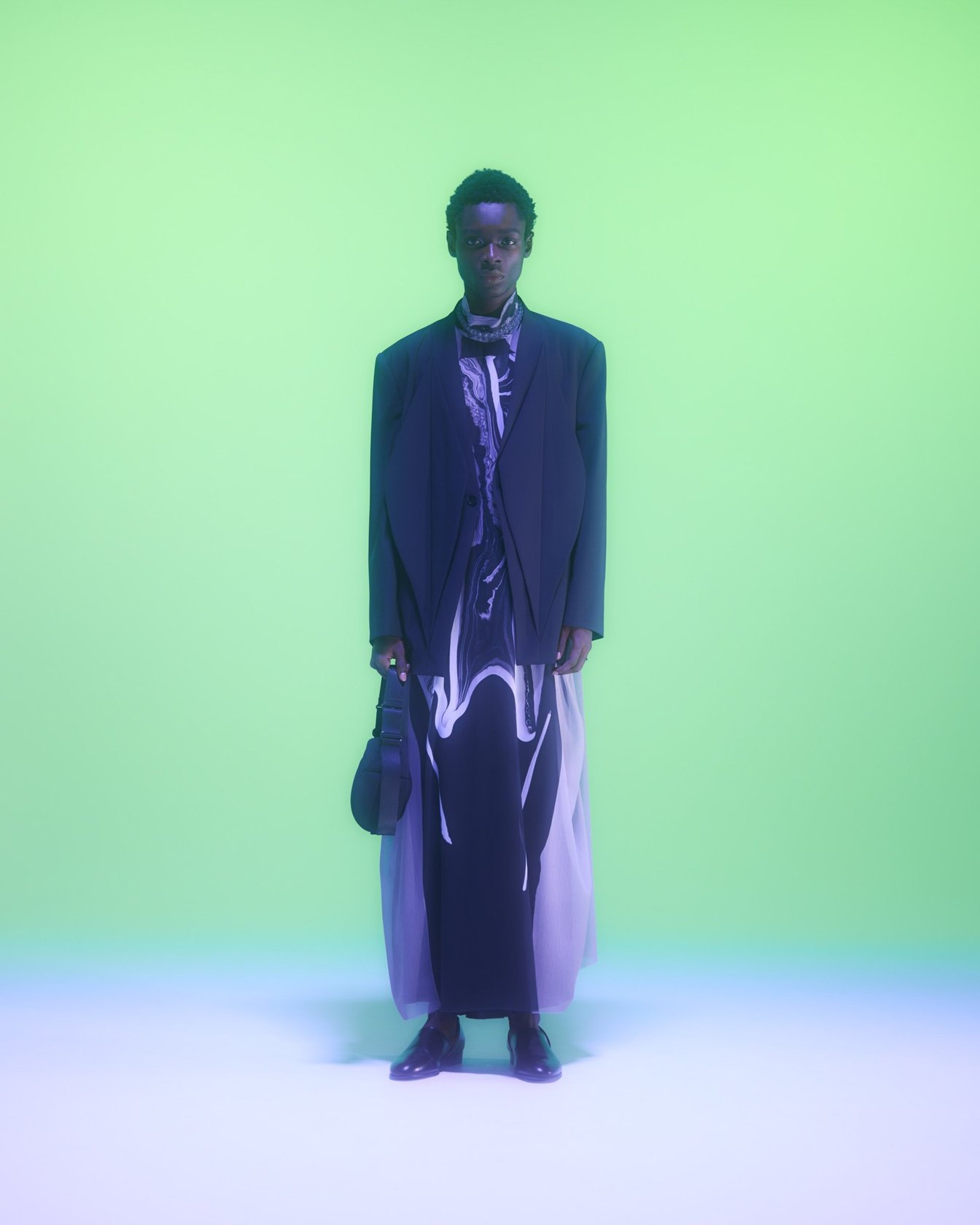 ギリシャ語で半透明を意味する「DIAPHANES」を語源にした「DIAPHANERA」を24SSシーズンのテーマに掲げ、人工知能の視座を利用してシルエットについて再解釈を行ったコレクションを展開。本シーズンでは人工知能を用いたデジタル作品や彫刻を制作するアーティストの岸裕真をメインコラボレーターとして迎え、同氏が独自にチューニングした画像生成AIモデル「DIAPHANERA AI」を用いて一部コレクションが制作された。鉱石画像を元に構築されたAIモデルは、インプットされたイメージを結晶化させアウトプットする。過去シーズンのアイテムをこのAIモデルを通じて結晶化させ、それをグラフィックとして落とし込んだアイテムを展開するなど、多彩なデザインアプローチが垣間見えるコレクションに仕上がっている。