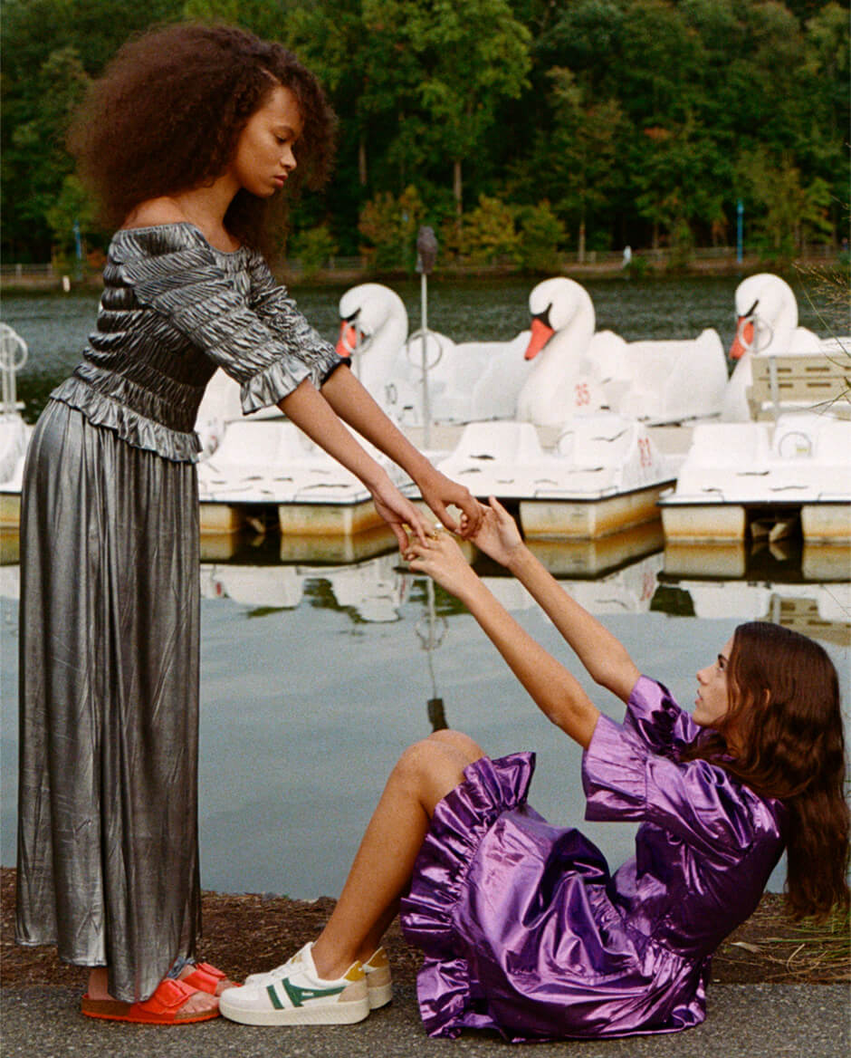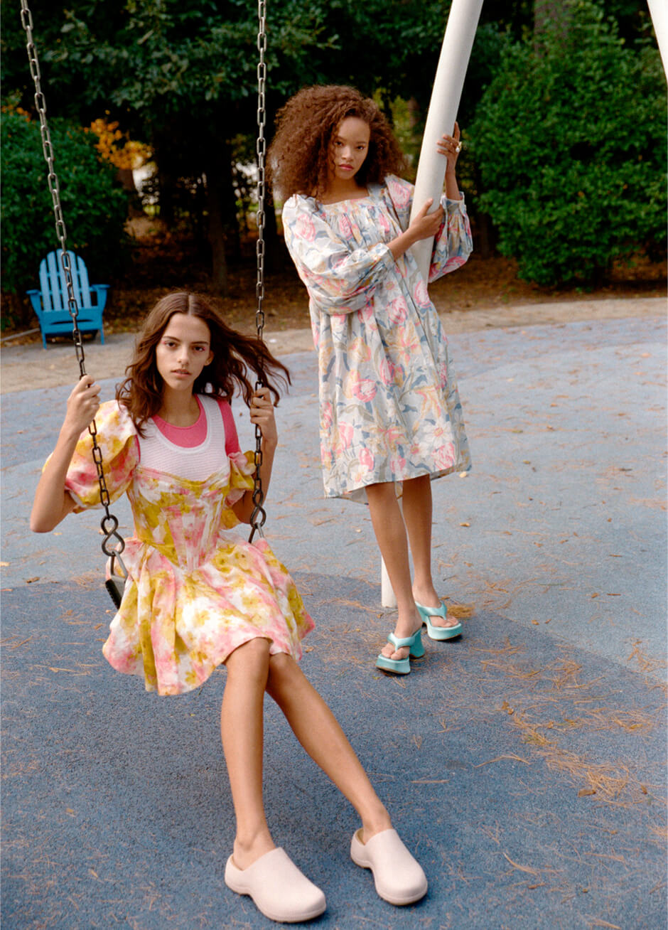 left - dress by BATSHEVA , sandals by BIRKENSTOCK,right - dress by BATSHEVA, shoes by GOLA