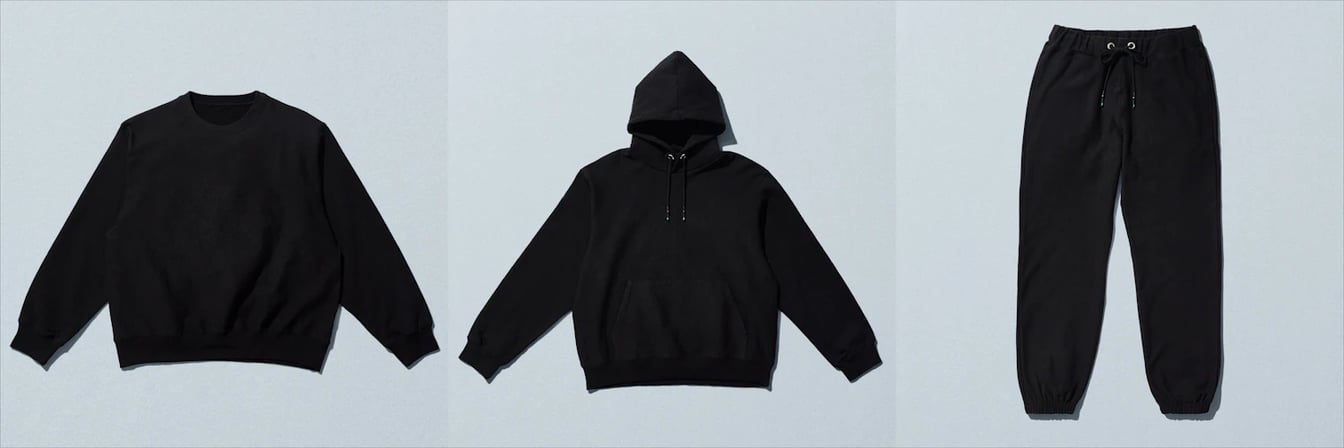今回はファッションアイテムとしてベーシックな品揃えの拡充という視点から、スウェット素材の3アイテム(トレーナー、パーカー、パンツ)が発表された。カラー展開は、黒一色となっている。