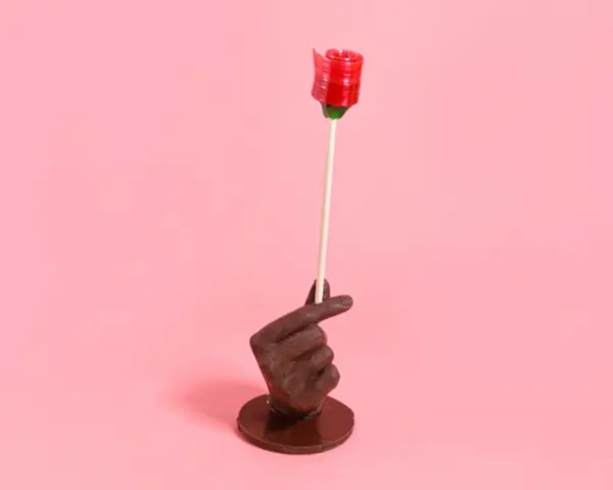 「きゅん」の手の部分に穴が開いていて、好みのロリポップを刺すことができる、インパクトたっぷりなチョコレートです。