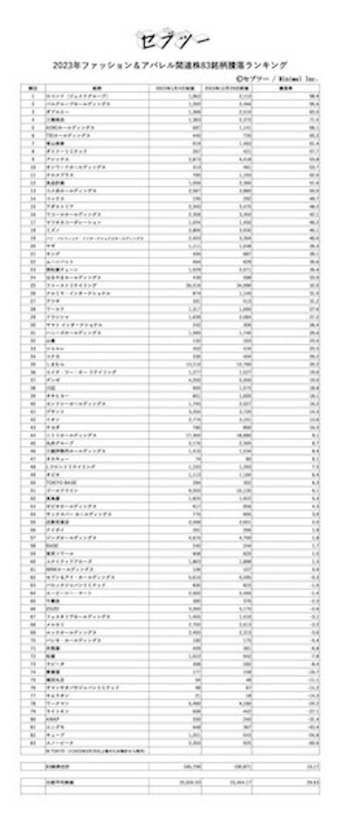 スノーピークは2022年12月期には過去最高の307億7300万円の売上高を達成しており、17期連続で増収を記録している。株価もコロナ禍真っ只中の2021年11月19日に終値で4440円までマークしたが、2023年に入ると状況は一転し、2024年に入った現在も1000円以下という水準でいる。「セブツー」では、ファッション&アパレル関連84銘柄の株価騰落率を調査してそのランキングを作成しているが、2023年の年間を通して全銘柄のうち最も株価を下げたのはスノーピークだった。2023年1月4日の始値は2350円で、12月29日の終値が925円となり、2023年の一年間で株価はマイナス60.6%まで下げている。