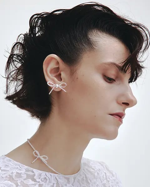 鎖骨のやや上にリボンが乗る短めのデザインで、クラシカルなムードが漂います。