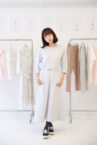 AMOの「初期衝動を詰め込んだ」というデビューコレクションでは、大きなフリルをあしらったワンピースやパンツ、ジャケットのセットアップに加えて、背中やウエスト、肩周りがカットオフされたデザインのトップスやワンピースなど、甘めのデザインながら色合いや雰囲気に落ち着きのあるアイテムをラインナップする。なお、同氏は、今後ルビー アンド ユーとポワニェの2ブランドのデザイナー・ディレクターを兼任していくという。