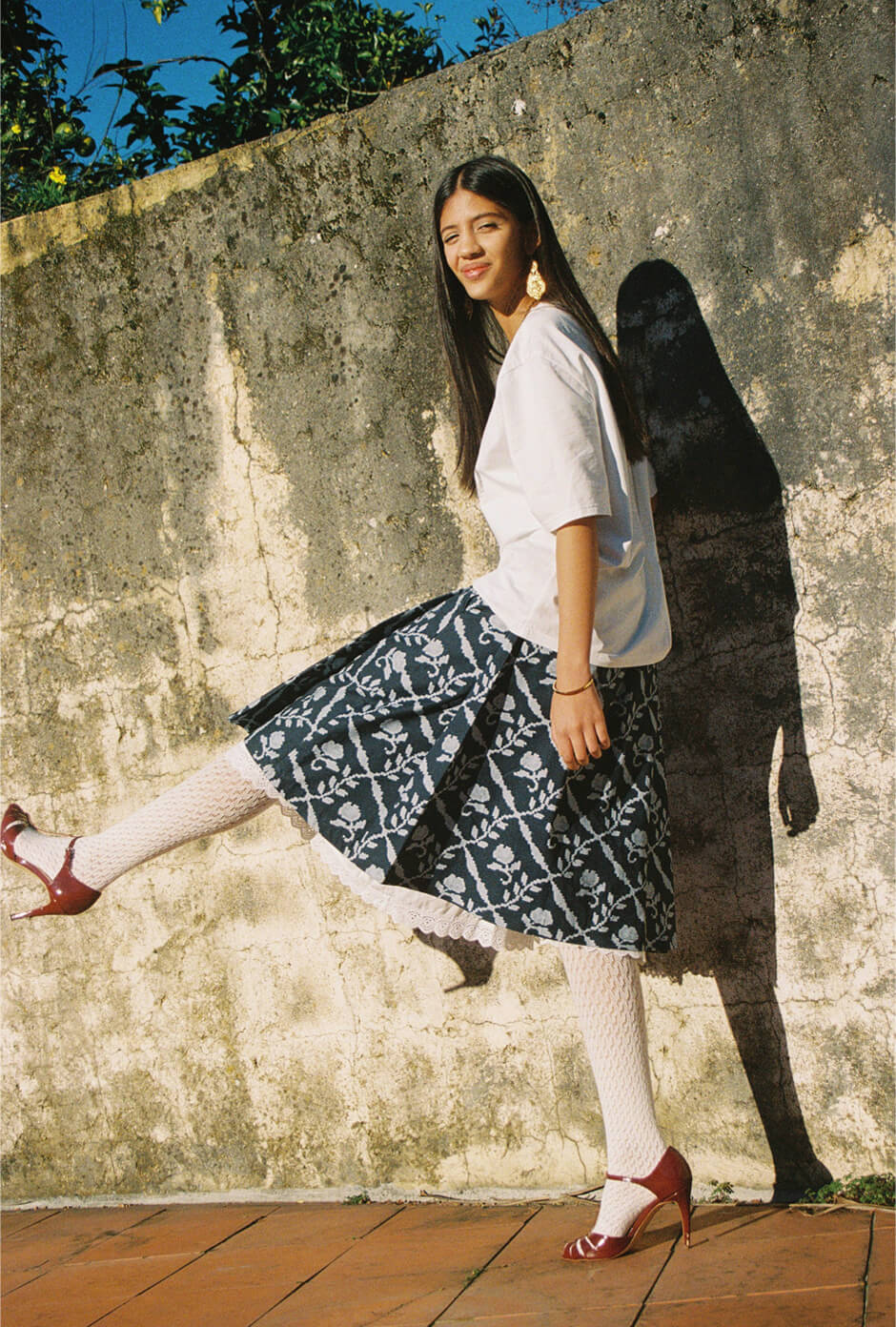 top and skirt by DIOGO RODRIGUES, inner skirt by ARCHIVAL REGIONAL COSTUME, tights, sandals, earrings, necklace and bracelet stylist’s own