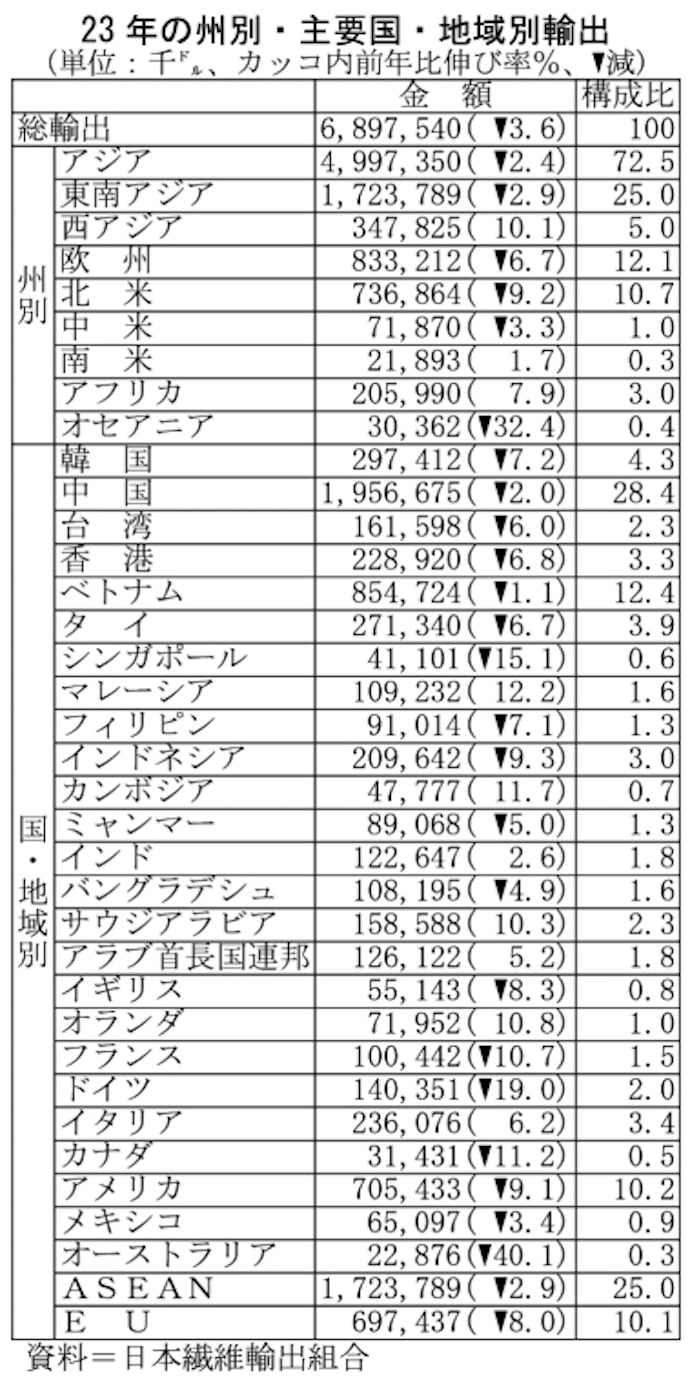 繊研plus円安下でありながら、繊維品の輸出が伸び悩んでいる。日本繊維輸出組合によると23年の繊維品の輸出は、前年と比べて3.6%減の68億9754万ドルで70億ドルを割り込んだ。2年連続の減少だ。70億ドルを割り込むのはコロナ禍で大きく落ち込んだ20年以来。
