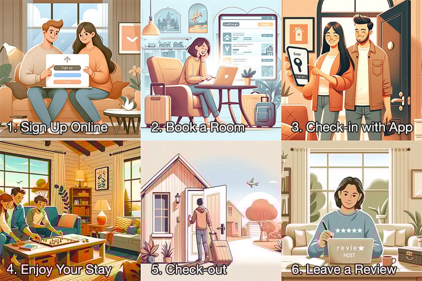 例えば、下記の例のように、考えたサービスアイディアの粒度を上げるために、ストーリーボードを生成AIを活用してアウトプットする。これはAirbnbの例であるが、よりそのサービスイメージを得やすい結果となっている。