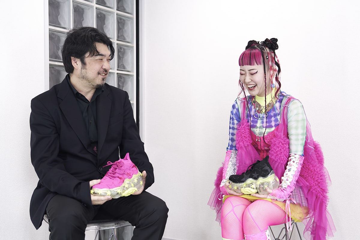 さて、そんな中で進めてきた詩羽とのプロジェクトがいよいよローンチとなり、コラボシューズが発売される。アッパーには星の刺繍、ソールにもネオンカラーで星がプリントされている。詩羽が「夢に向かって1歩踏み出してほしい」と願いを込めた1足だ。ハイクオリティな質感と独創的なデザイン、そしてファンシーさがミックスされたデザインは、一段と原宿との相性も良さそう。その手応えは?